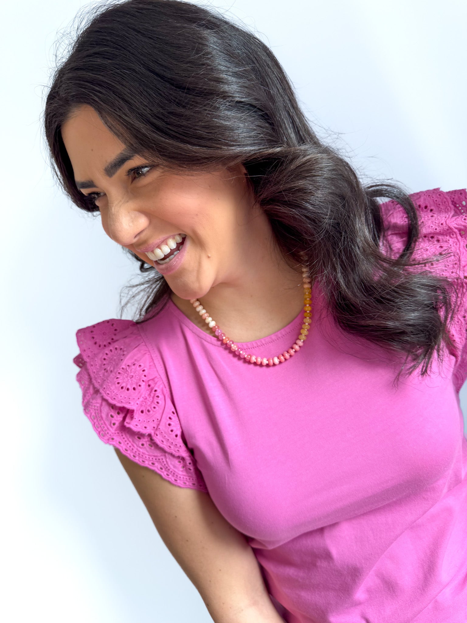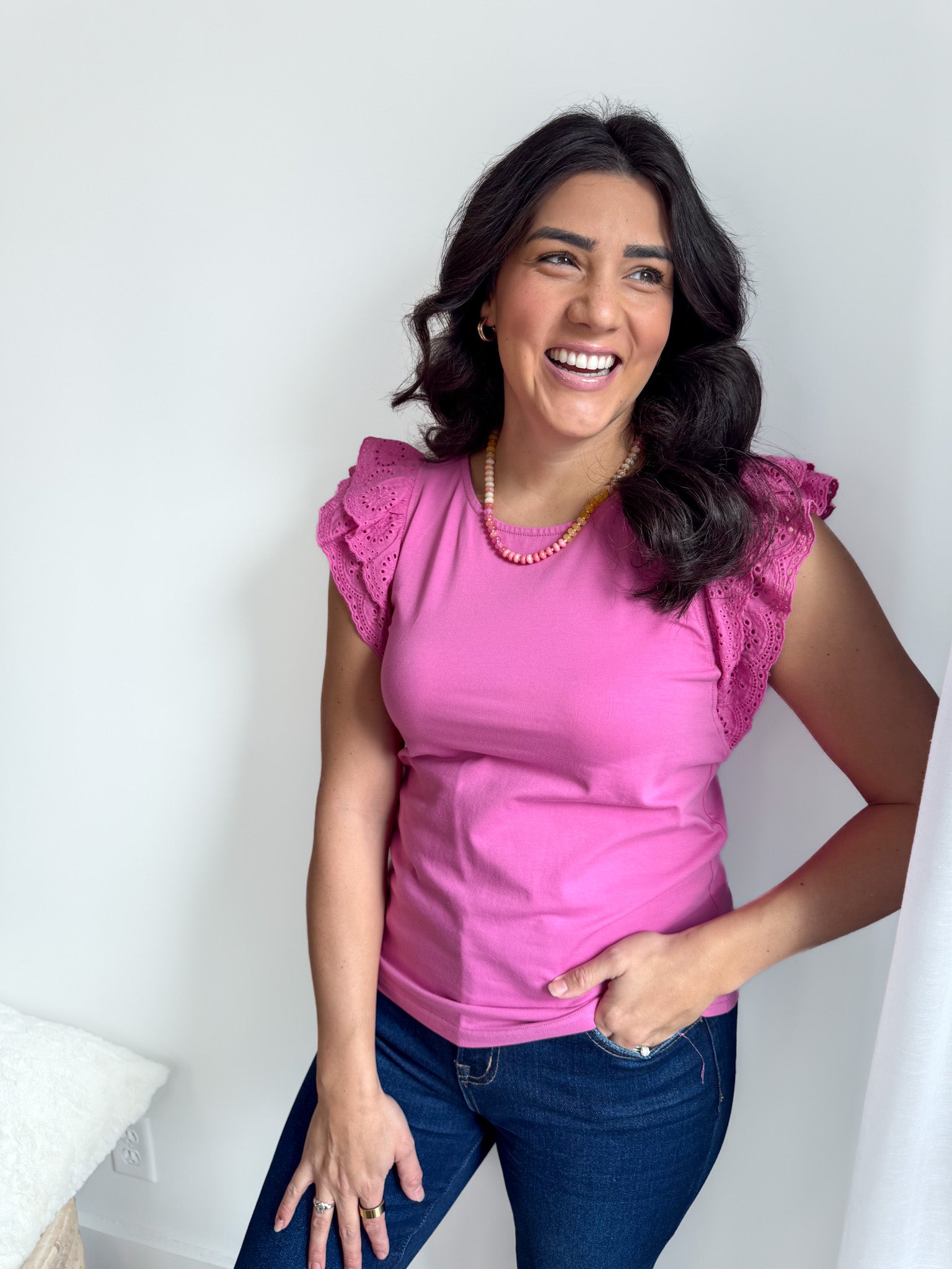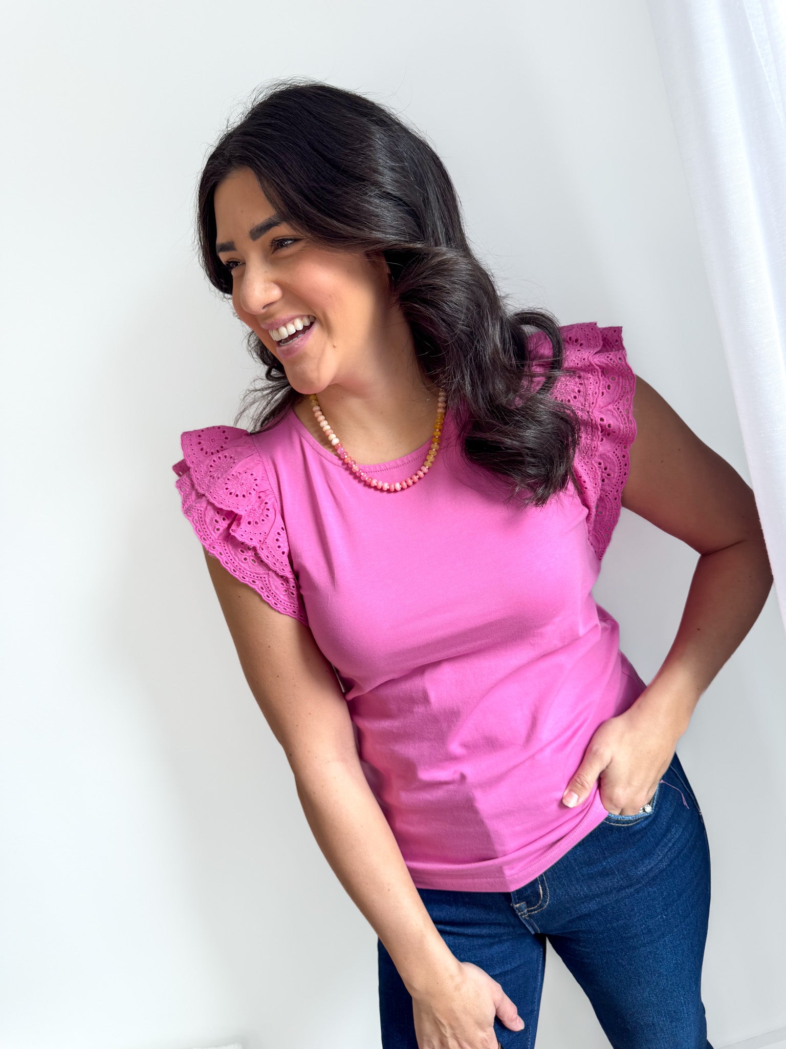 This charming blouse captures effortless flirtation through its delicate eyelet ruffle sleeves and vibrant color palette.