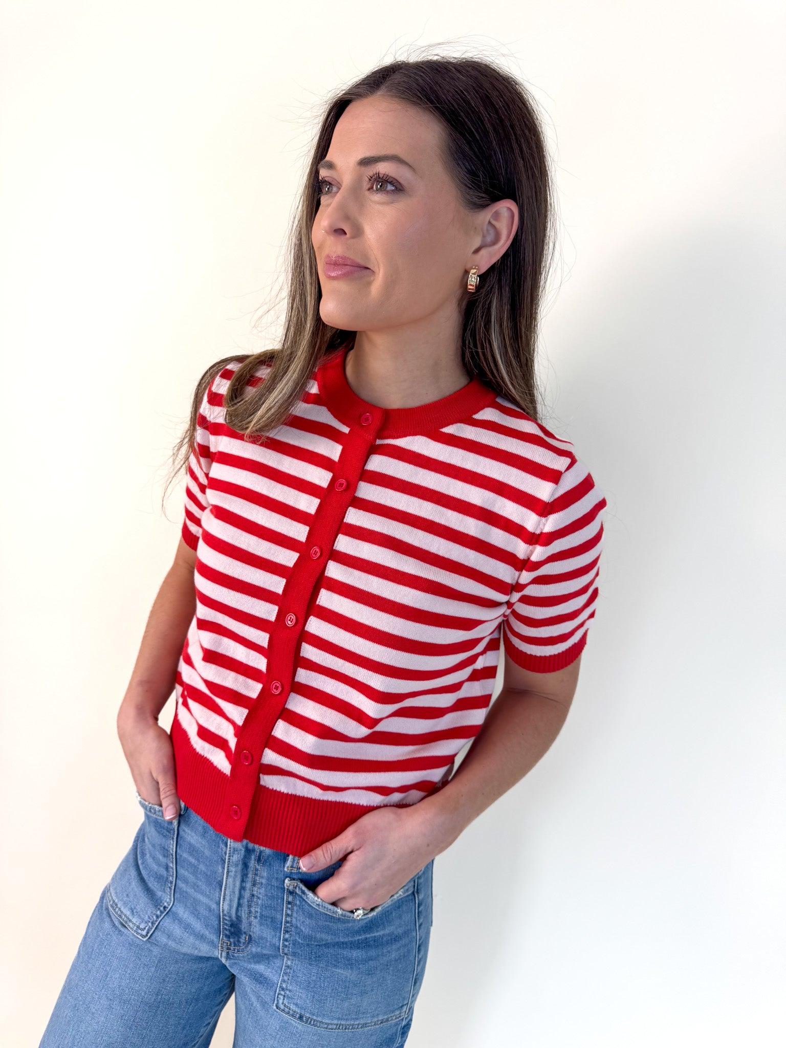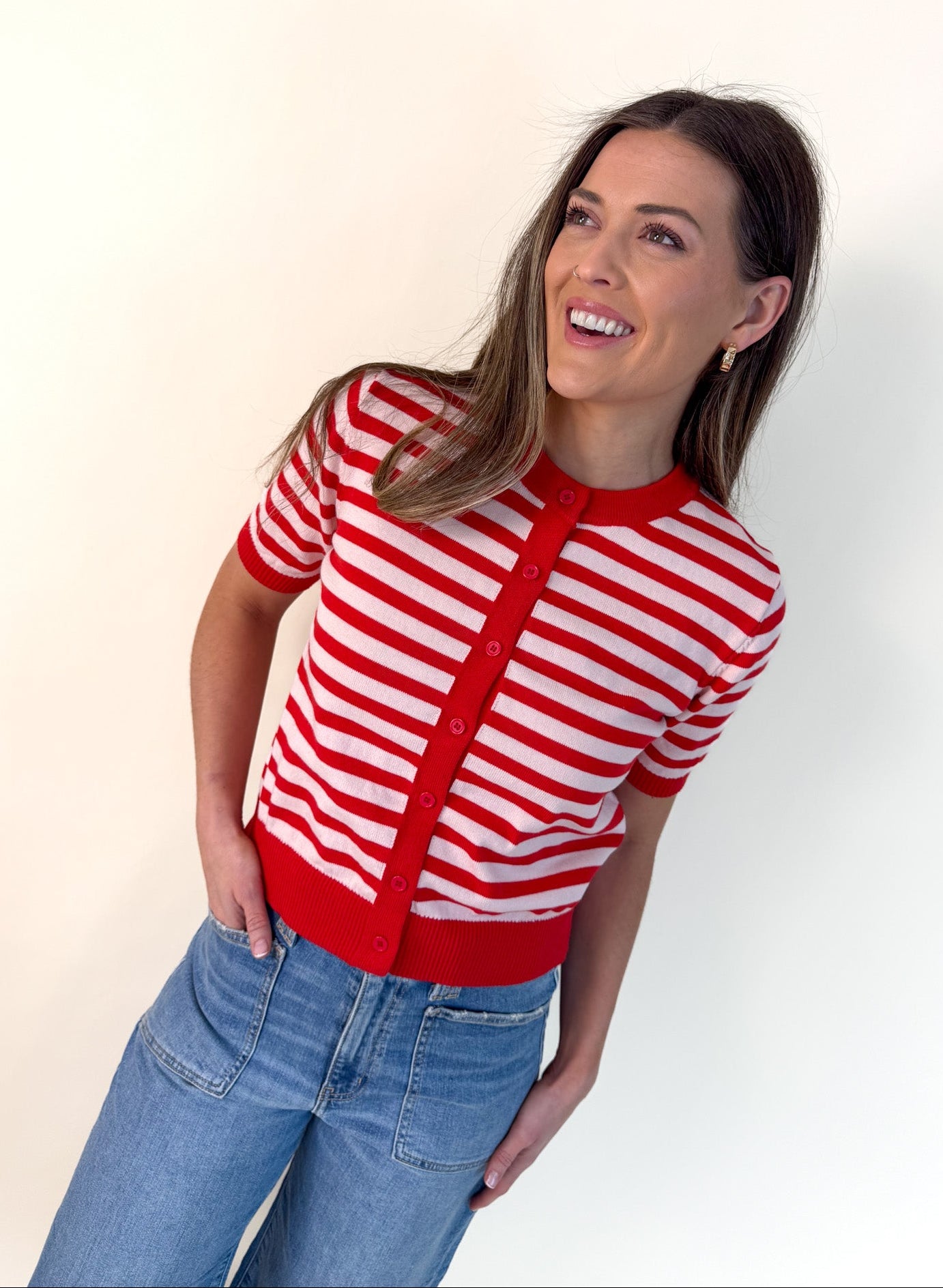 A sweet, cheerful knit that instantly brightens any spring–summer look. This striped short-sleeve cardigan blends a playful color palette with a soft, lightweight sweater knit. Perfect for warm days when you still want something cozy and polished. The silhouette is charmingly relaxed with a round neckline, delicate button-down front, and ribbed hems that create a naturally flattering fit. It pairs beautifully with flowy skirts for a soft, feminine look or with crisp shorts for an effortless, sun-kissed weekend style. Easy to layer, easy to love. Whether styled as a top or worn open over tanks and dresses, it’s the versatile knit that completes every outfit.