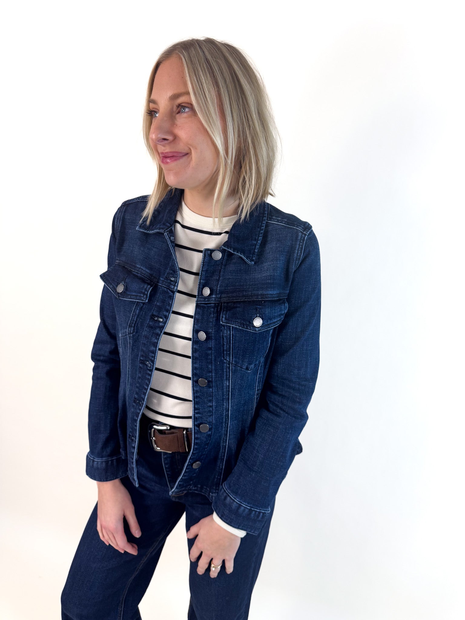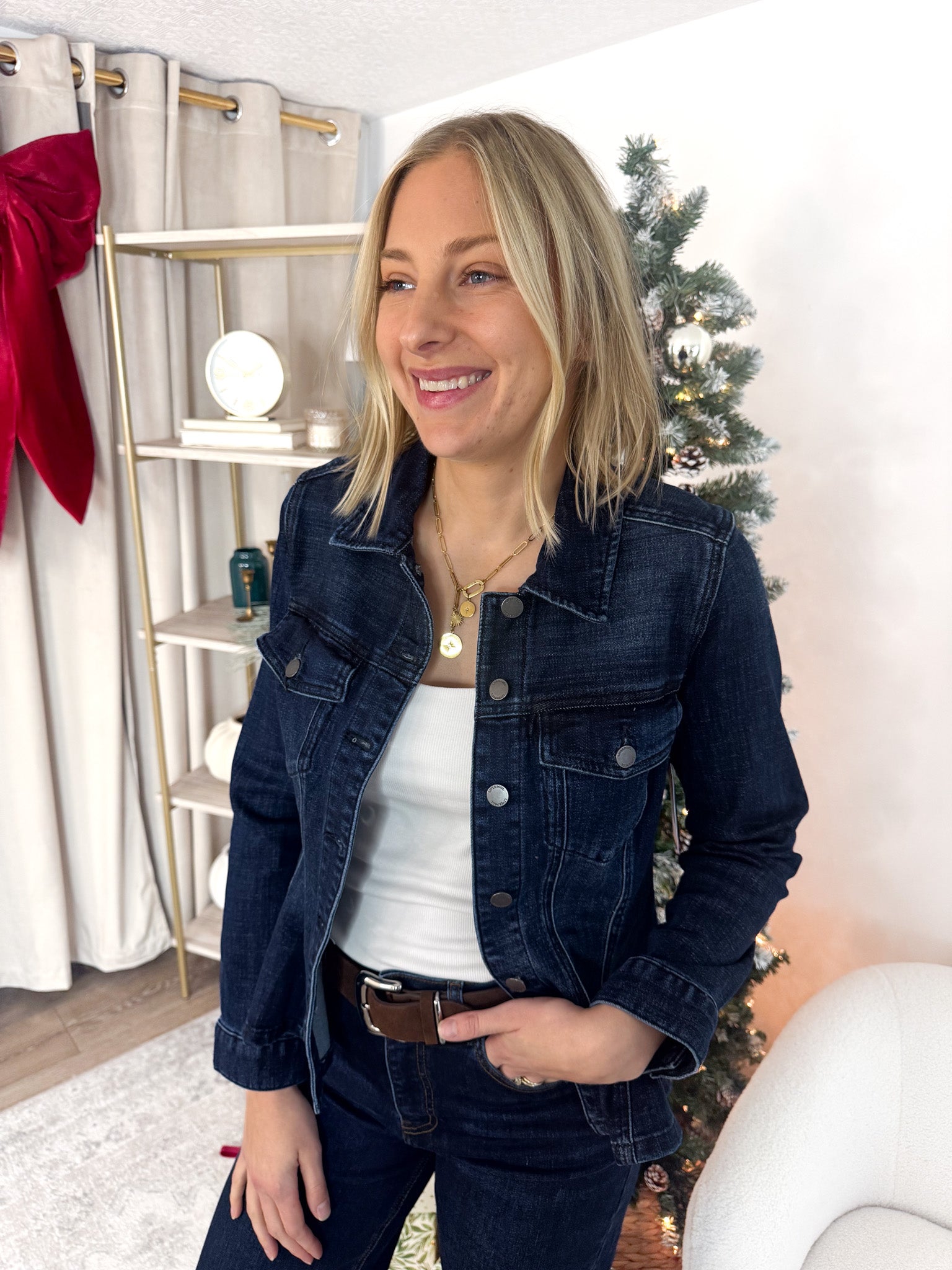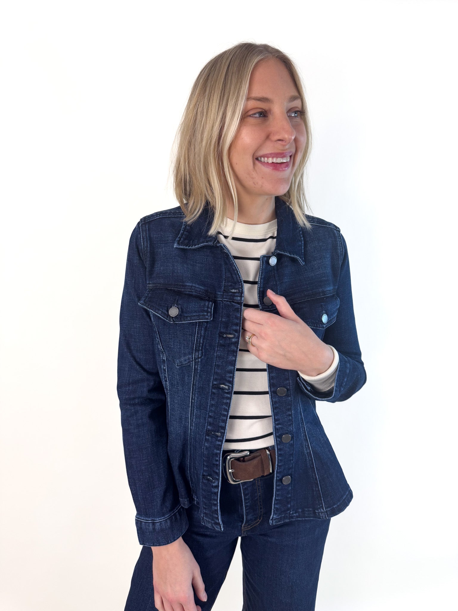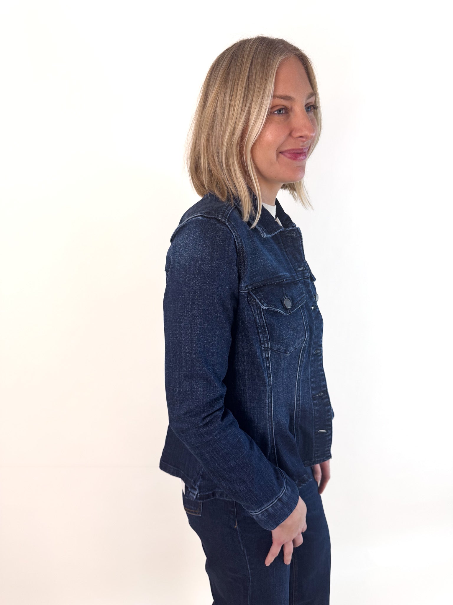 Designed with a sleek, fitted silhouette through the shoulders and chest, it shapes beautifully while still giving you that classic, structured denim feel.