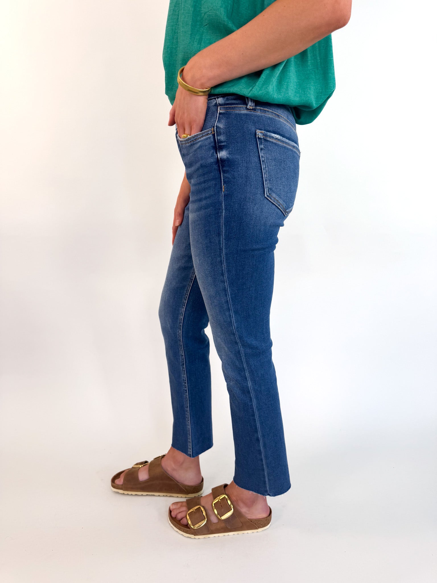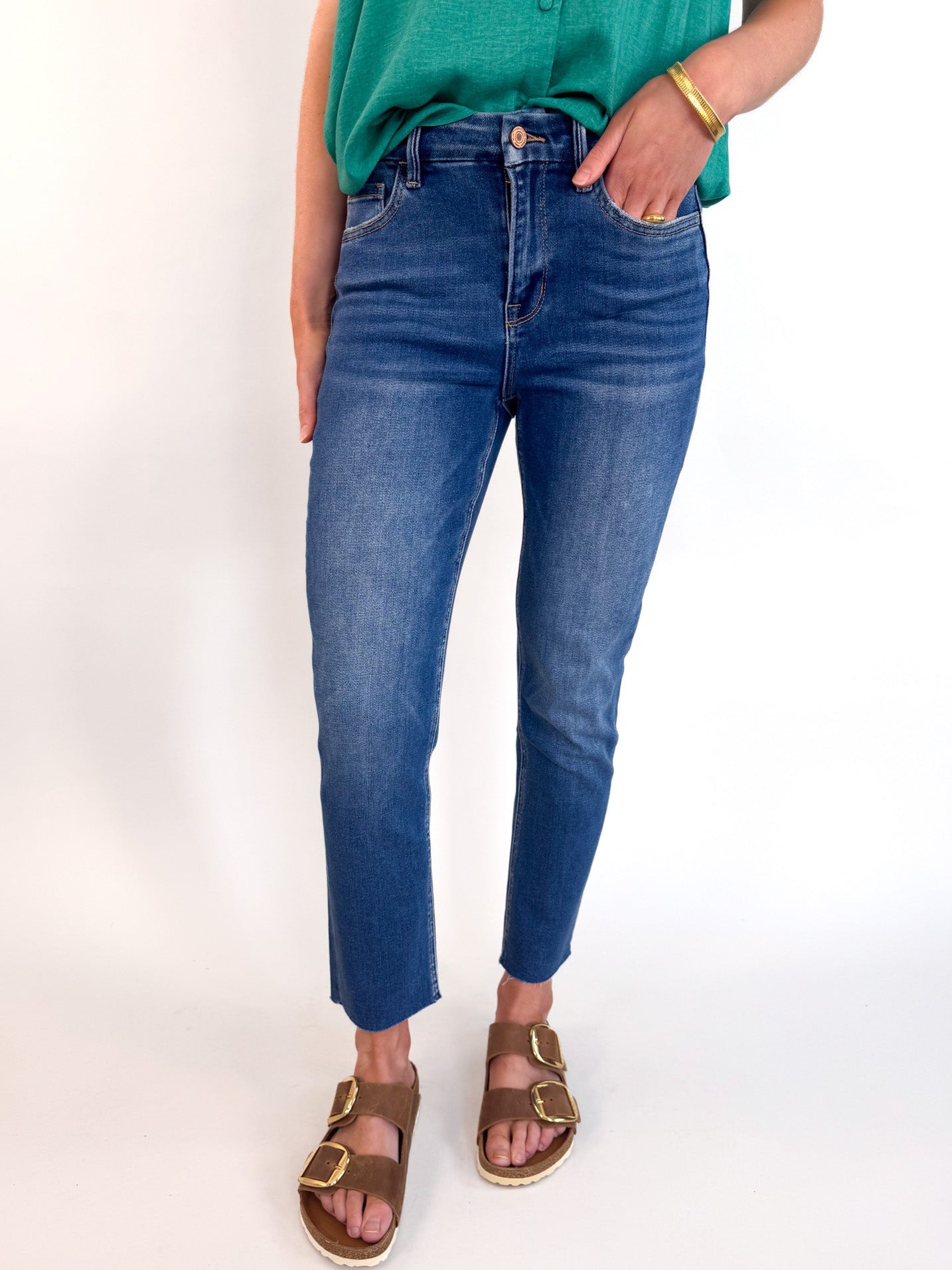 Stay comfortable while looking stylish in the Mel High Rise Slim Straight Jeans! Made with stretch denim, these jeans hug your curves and provide all-day comfort. The high rise waist and slim fit give you a flattering figure, while the raw hem and cropped length add a touch of edge.