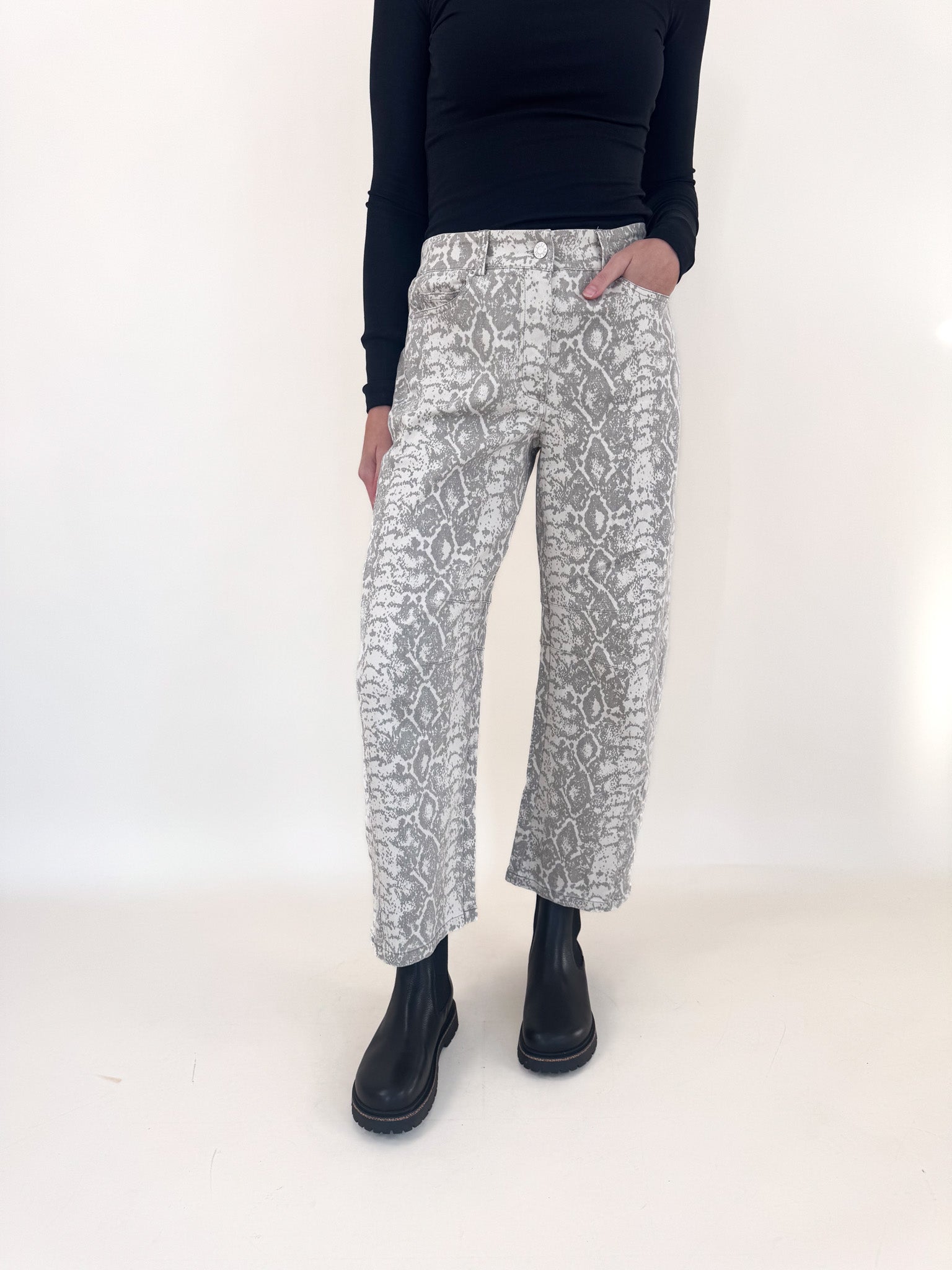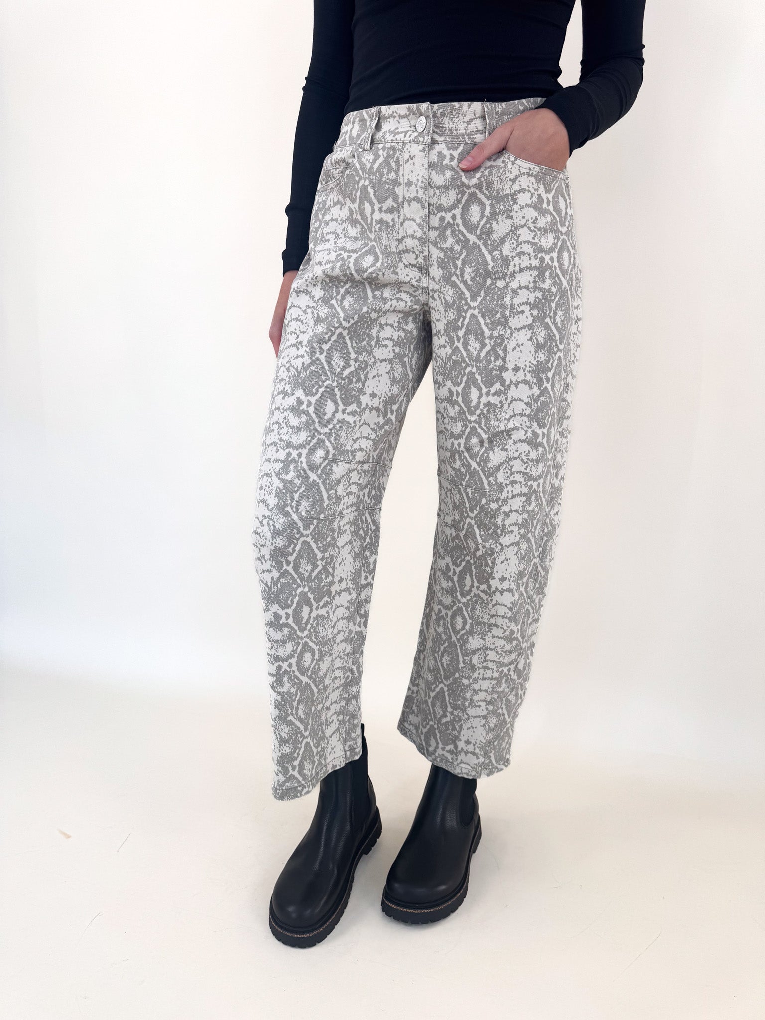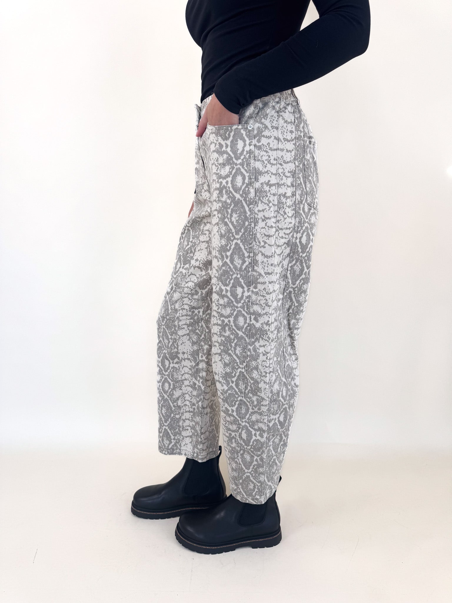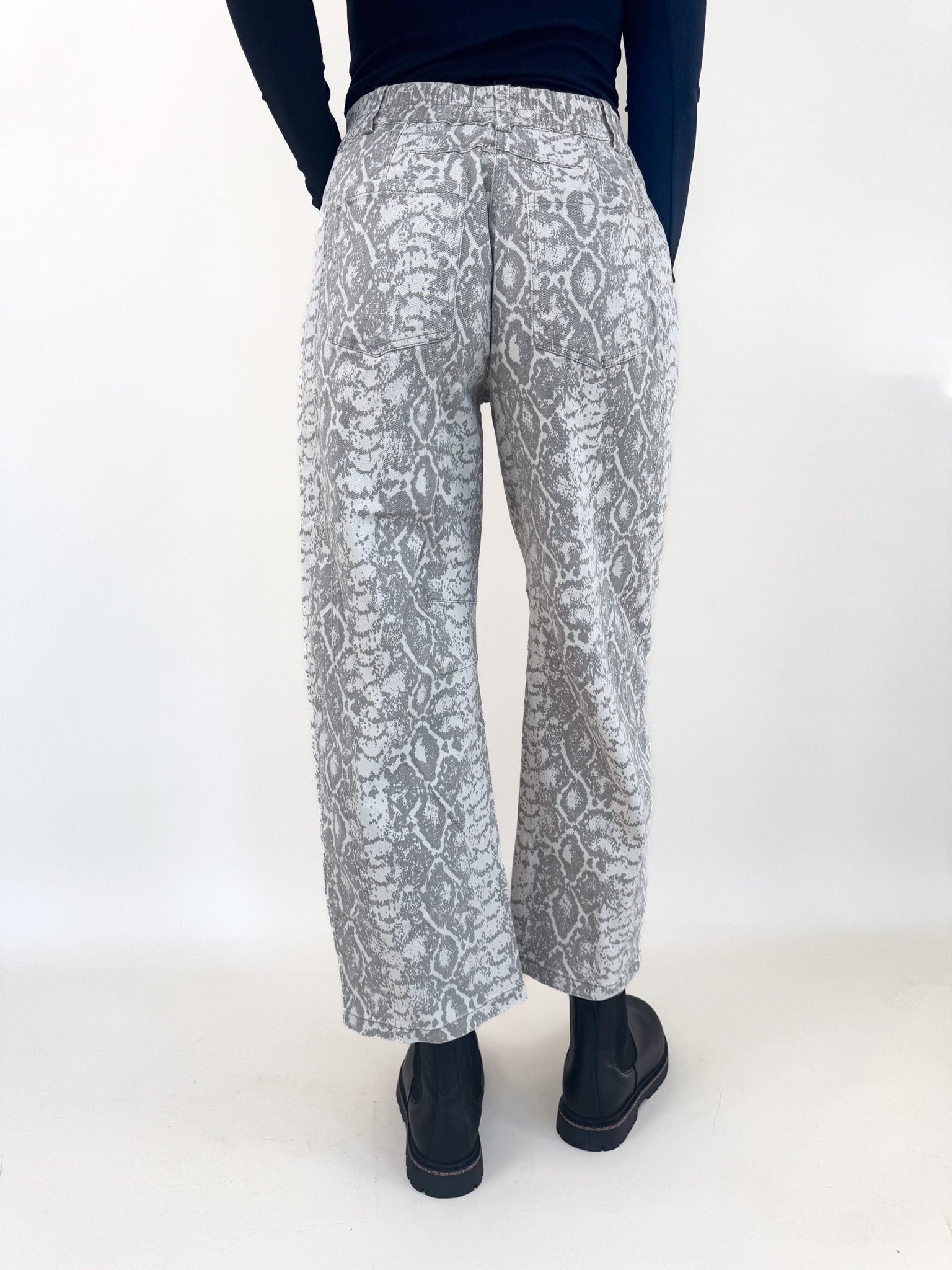 Make a statement in these python snake print barrel pants — bold, sleek, and endlessly versatile. The structured barrel-leg silhouette gives them a modern edge while keeping things comfortable and flattering.