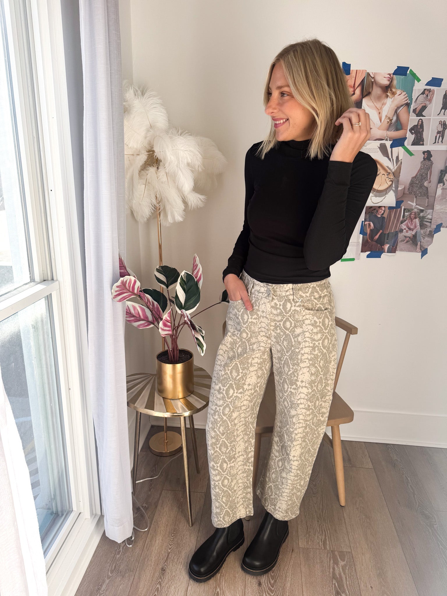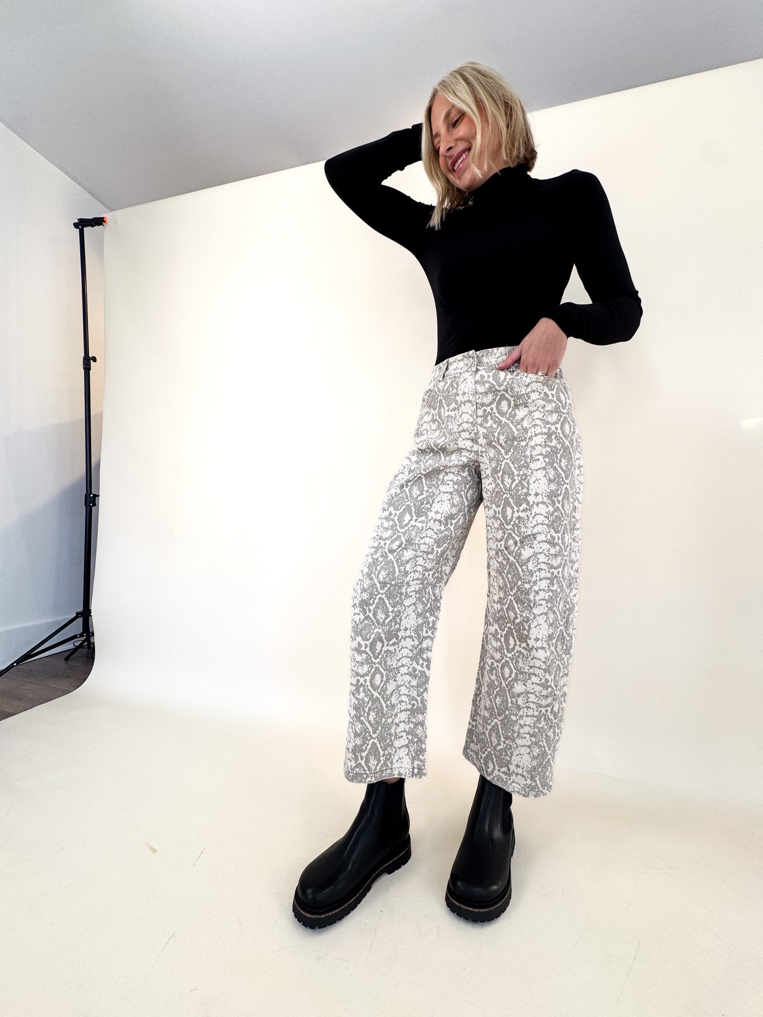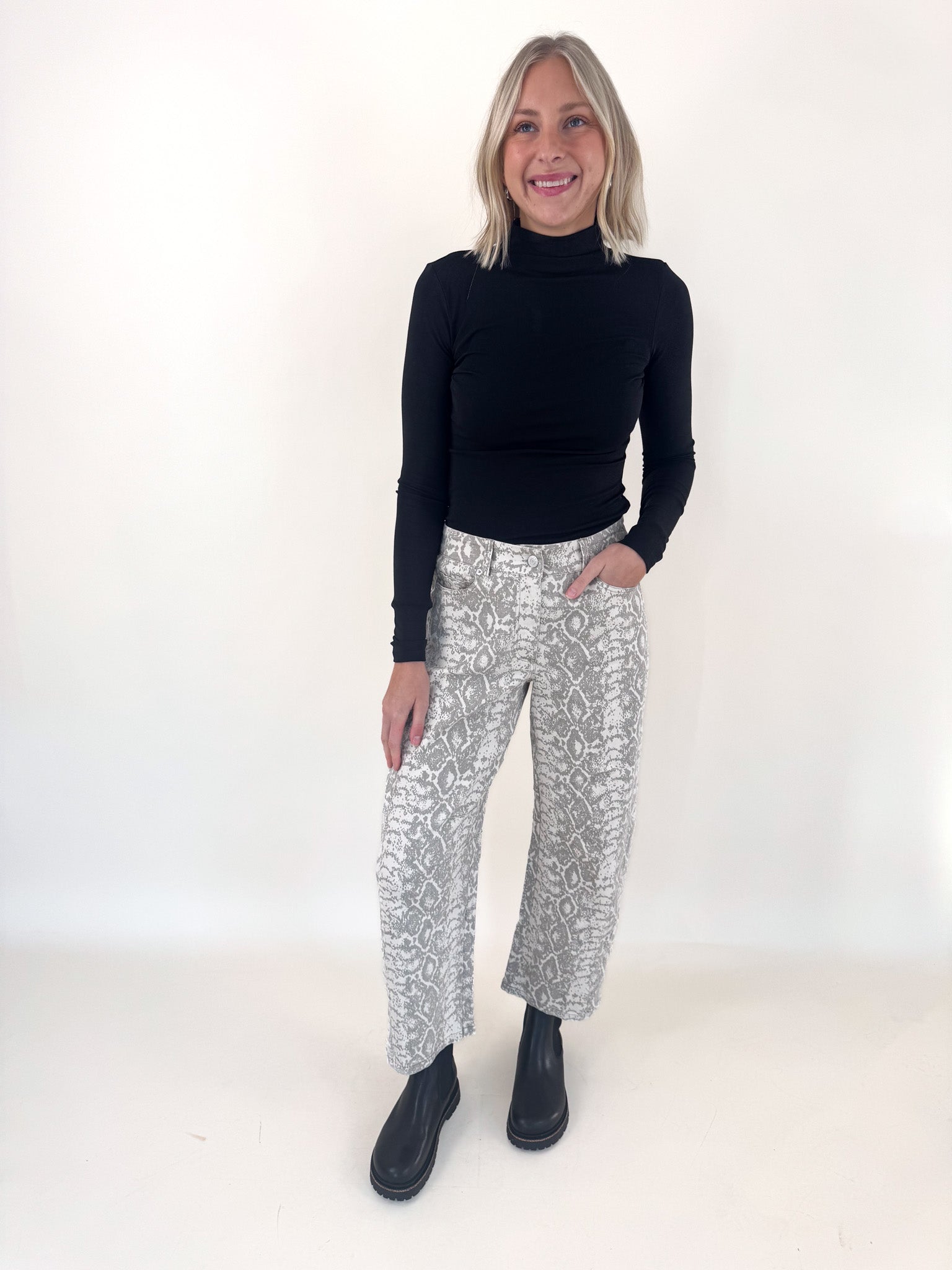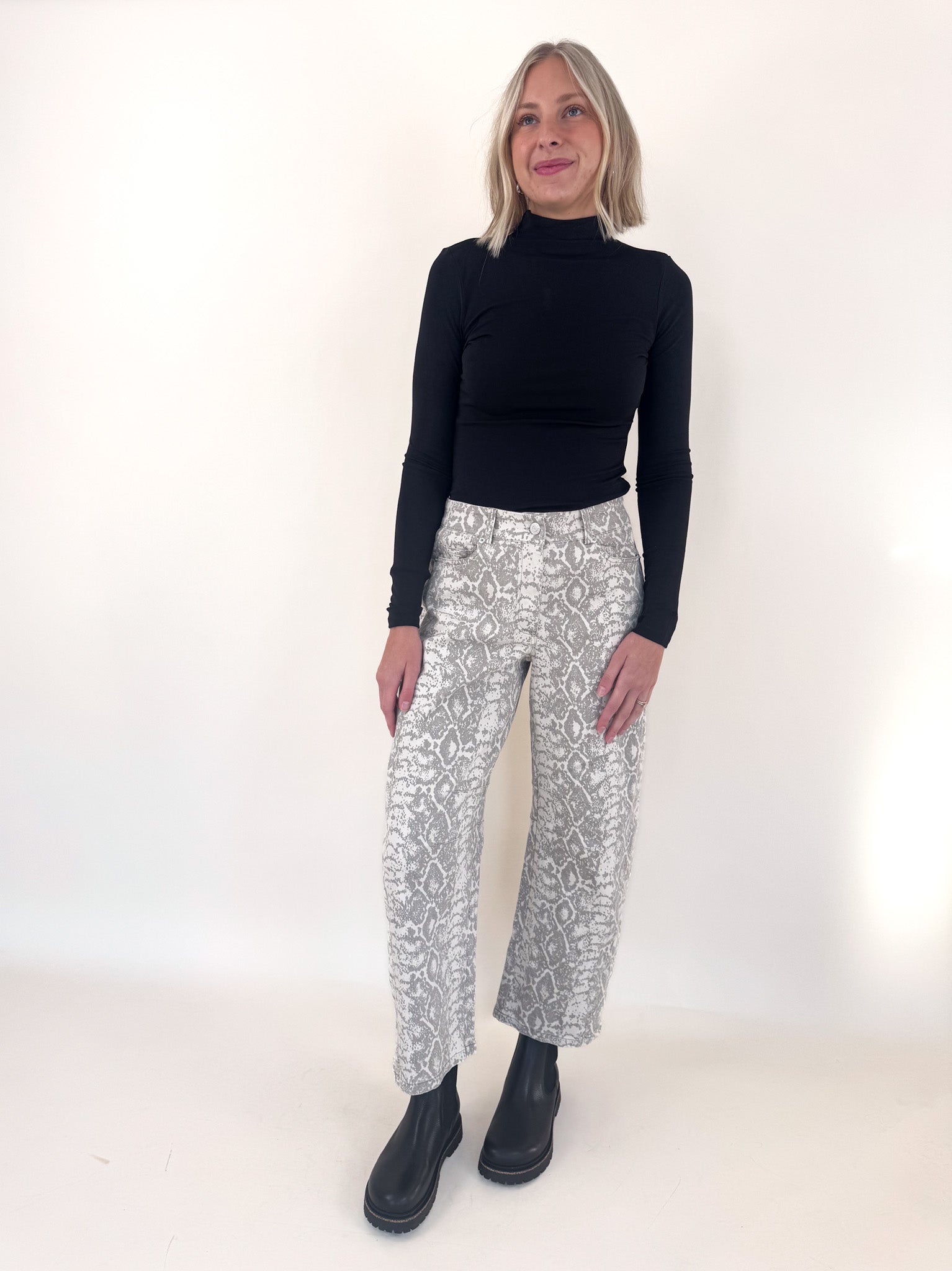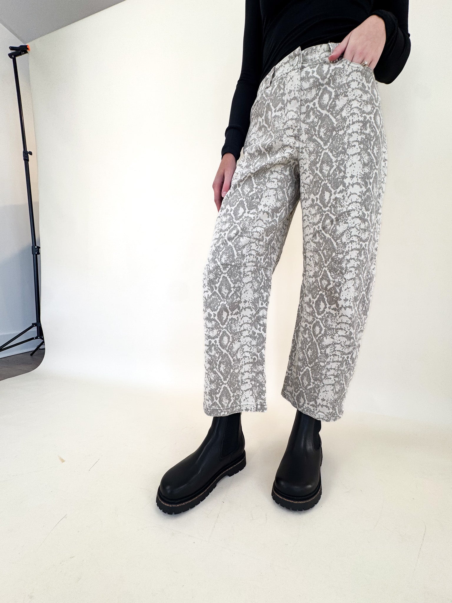 Make a statement in these python snake print barrel pants — bold, sleek, and endlessly versatile. The structured barrel-leg silhouette gives them a modern edge while keeping things comfortable and flattering.
