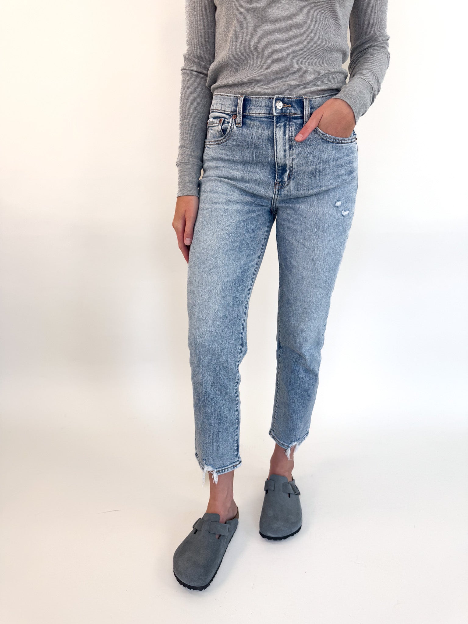 The Straight Up is a high rise straight leg jean in a classic light blue wash with highs and lows throughout. Frayed hems make this pair feel like an authentic vintage score, while the "Just Right" fabric is the perfect mix of rigid and stretch that keeps the structure of the pant but leave room for comfortable give.