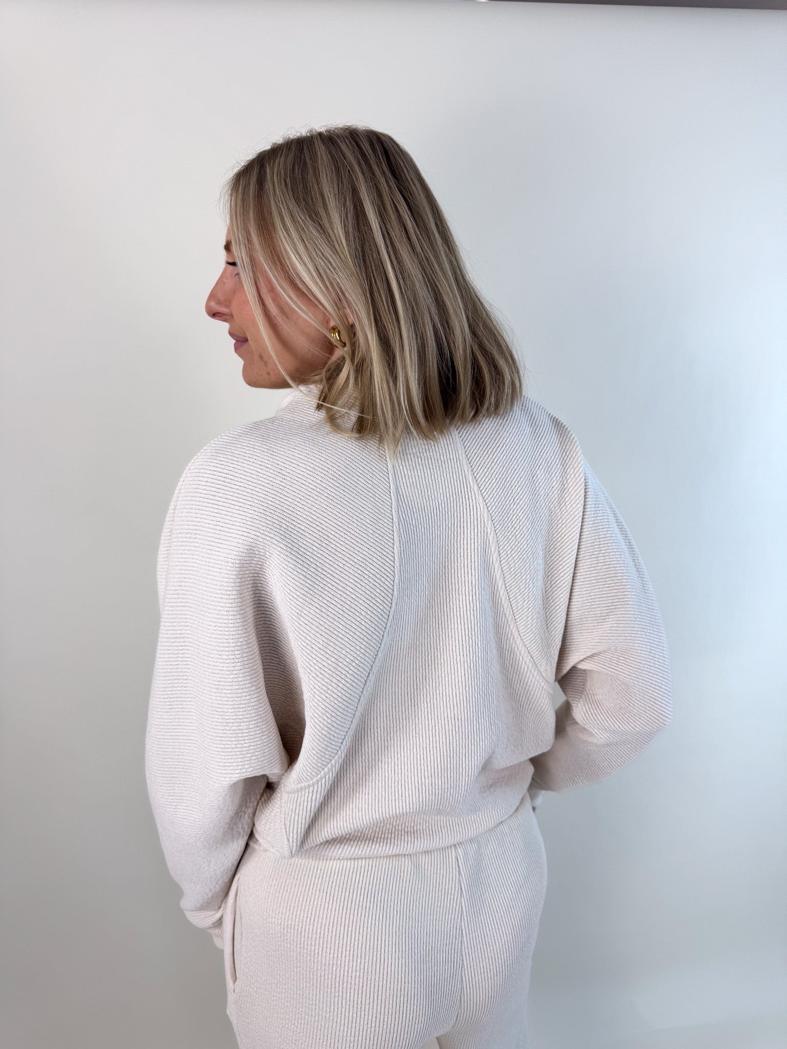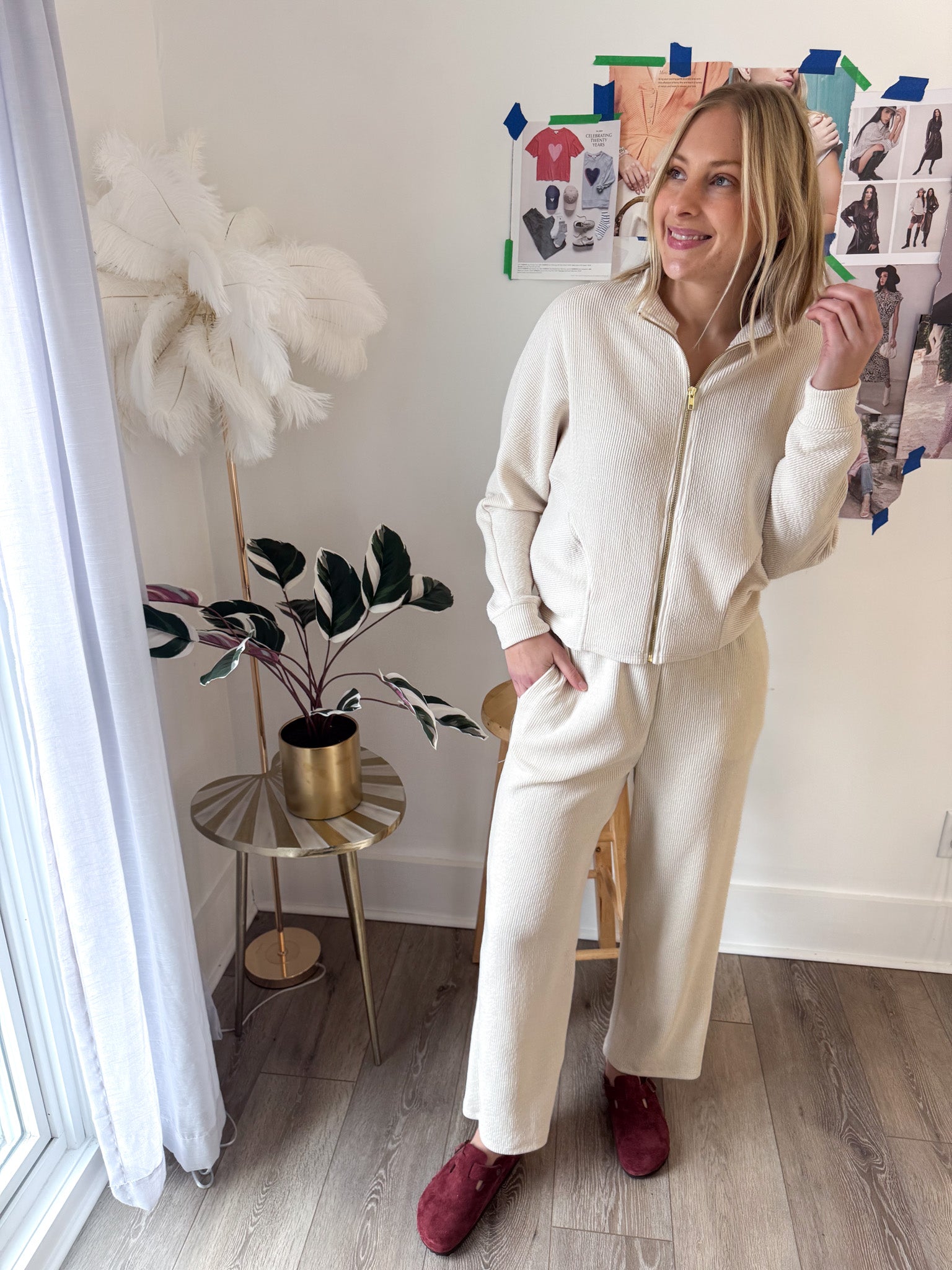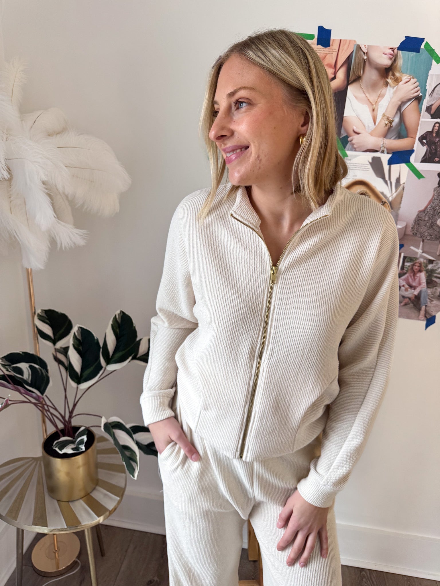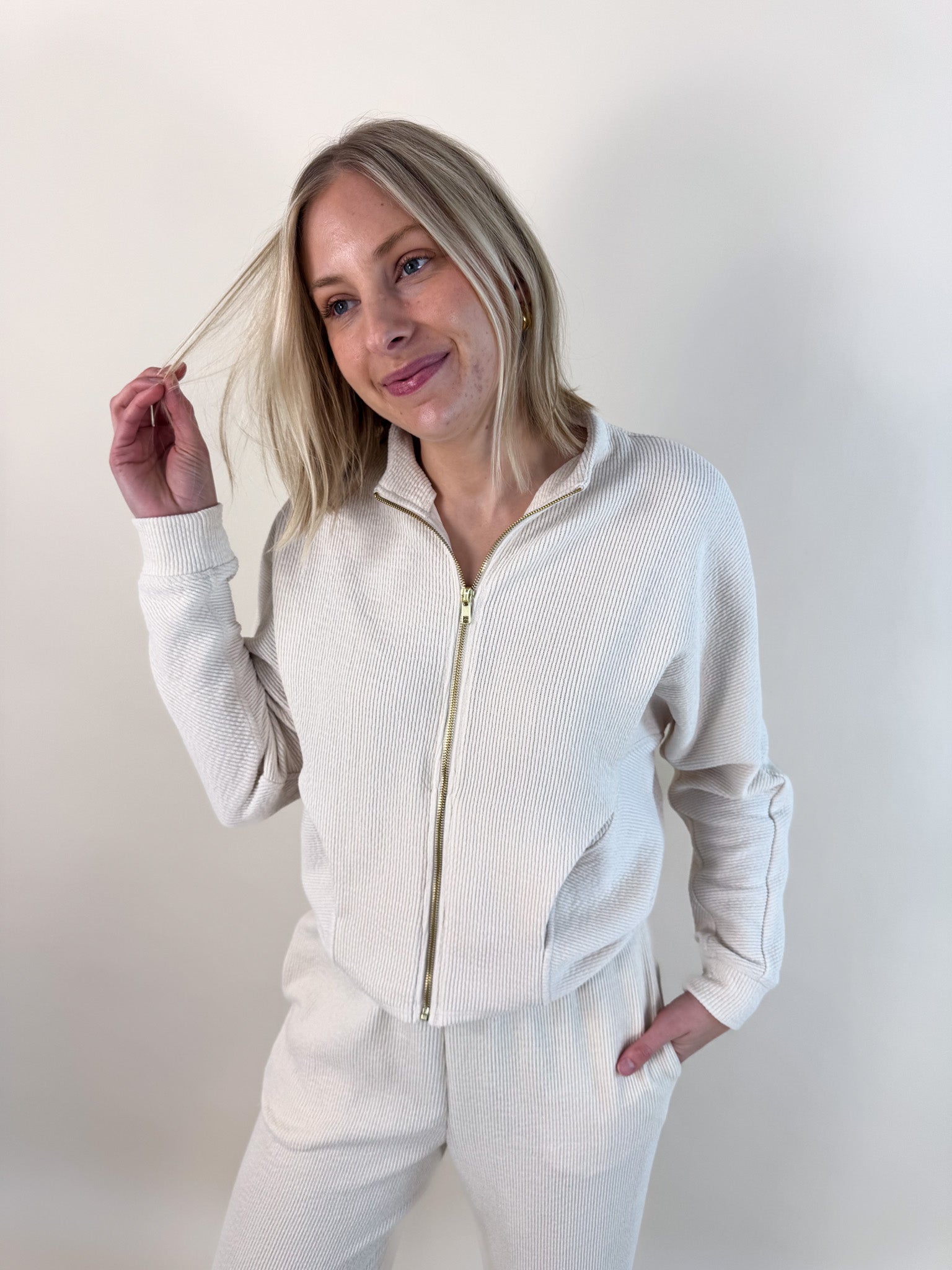 Effortless comfort meets modern minimalism. Crafted in our soft waffle-textured knit, this zip-up bomber features a relaxed silhouette with drop shoulders, side pockets, and a sleek gold zipper for a subtle touch of polish.