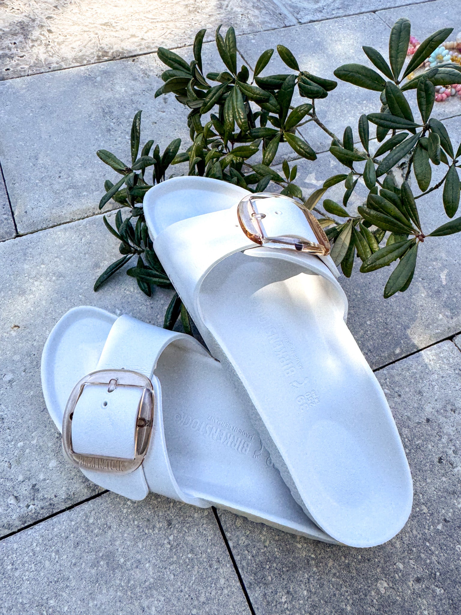 This is a new and modern interpretation of the BIRKENSTOCK classic Madrid. This version features our popular Big Buckle made from a stainless synthetic material and makes an impression with its durability and minimalist design. Modeled on the cork sandal, it is made from the ultra-lightweight and highly flexible synthetic material EVA. The high-quality, odor-neutral EVA has been tested for harmful substances and combines numerous positive attributes: it is very light, highly elastic, shock-absorbent, water-resistant, and skin-friendly.