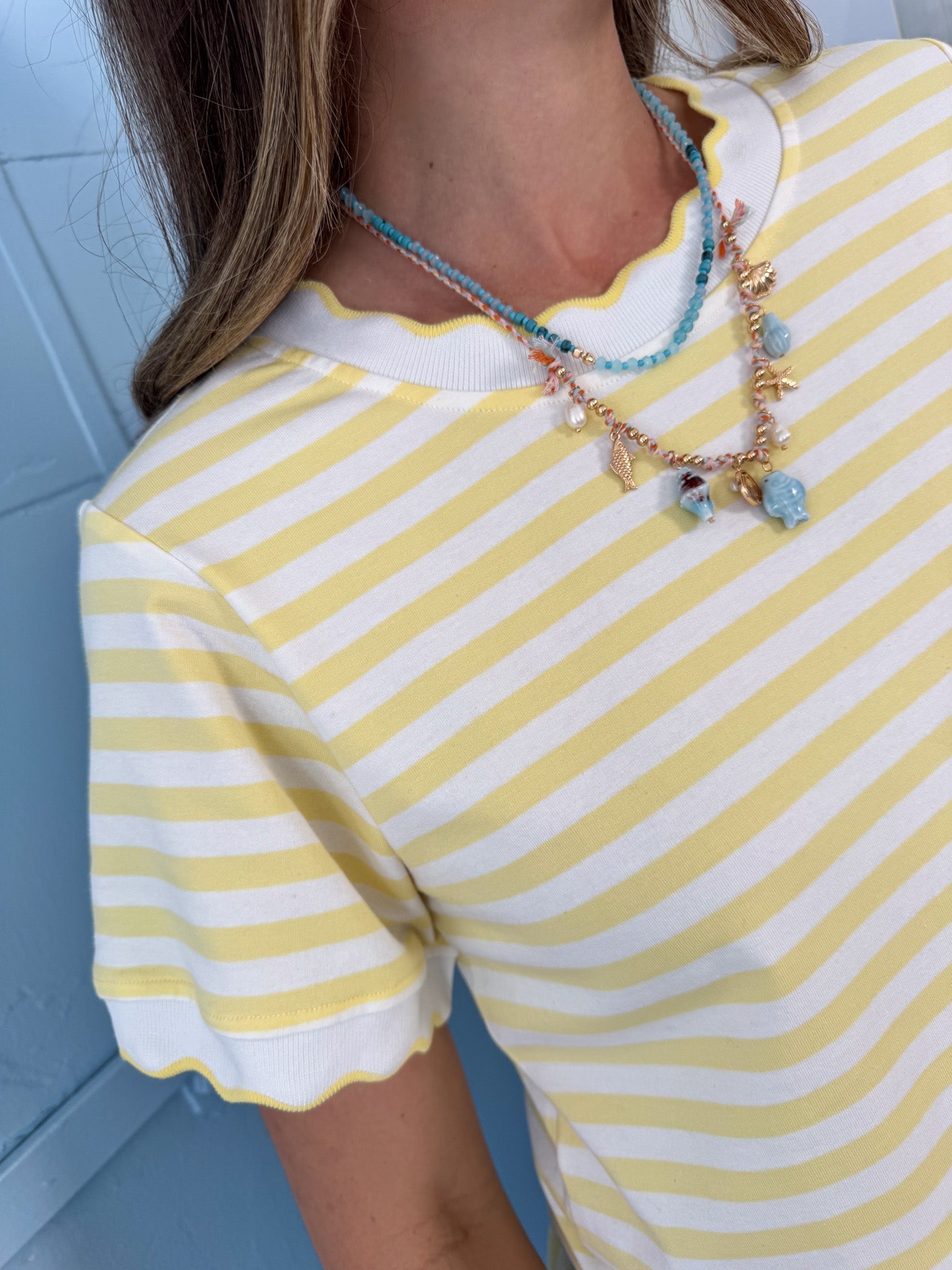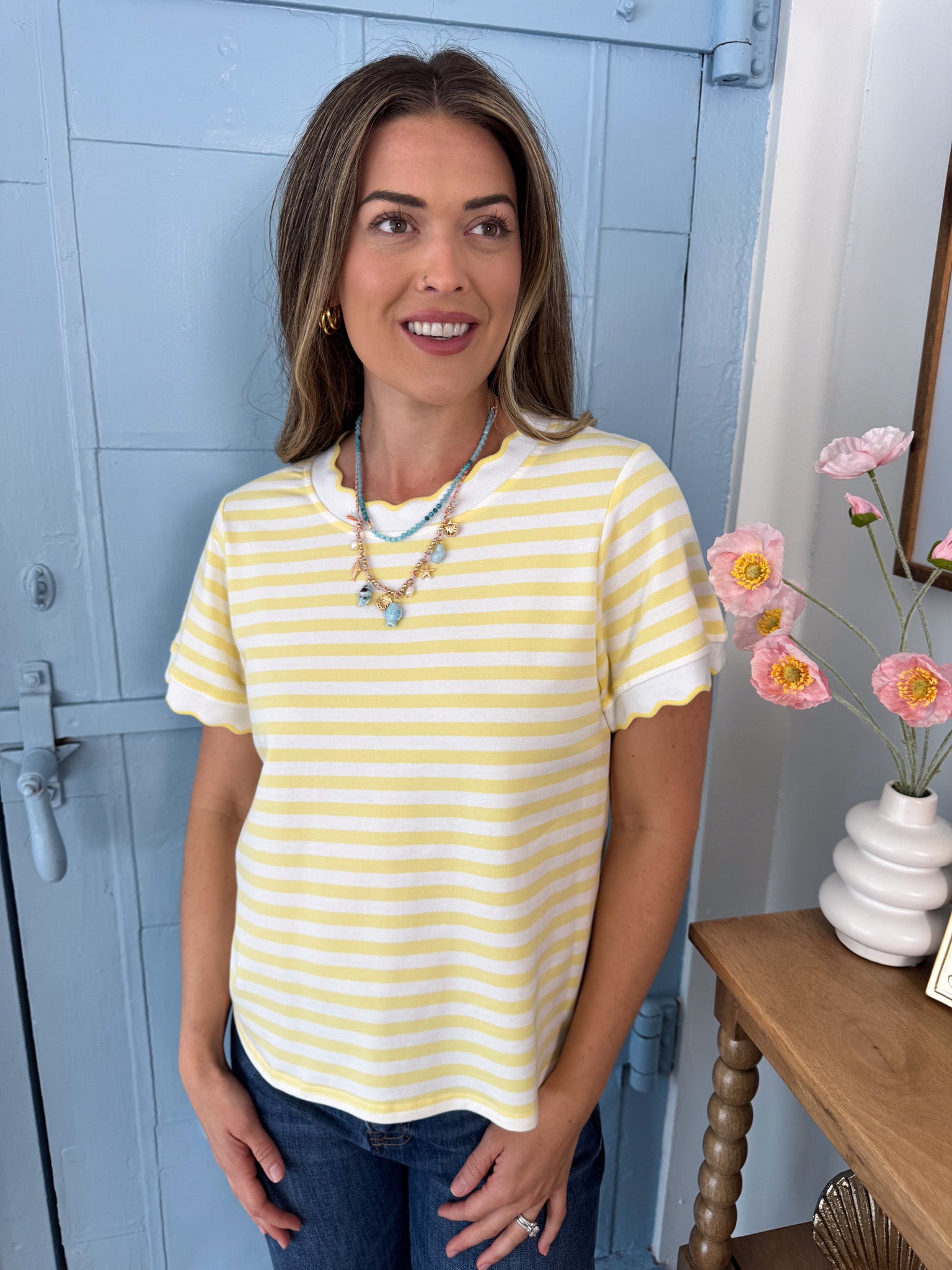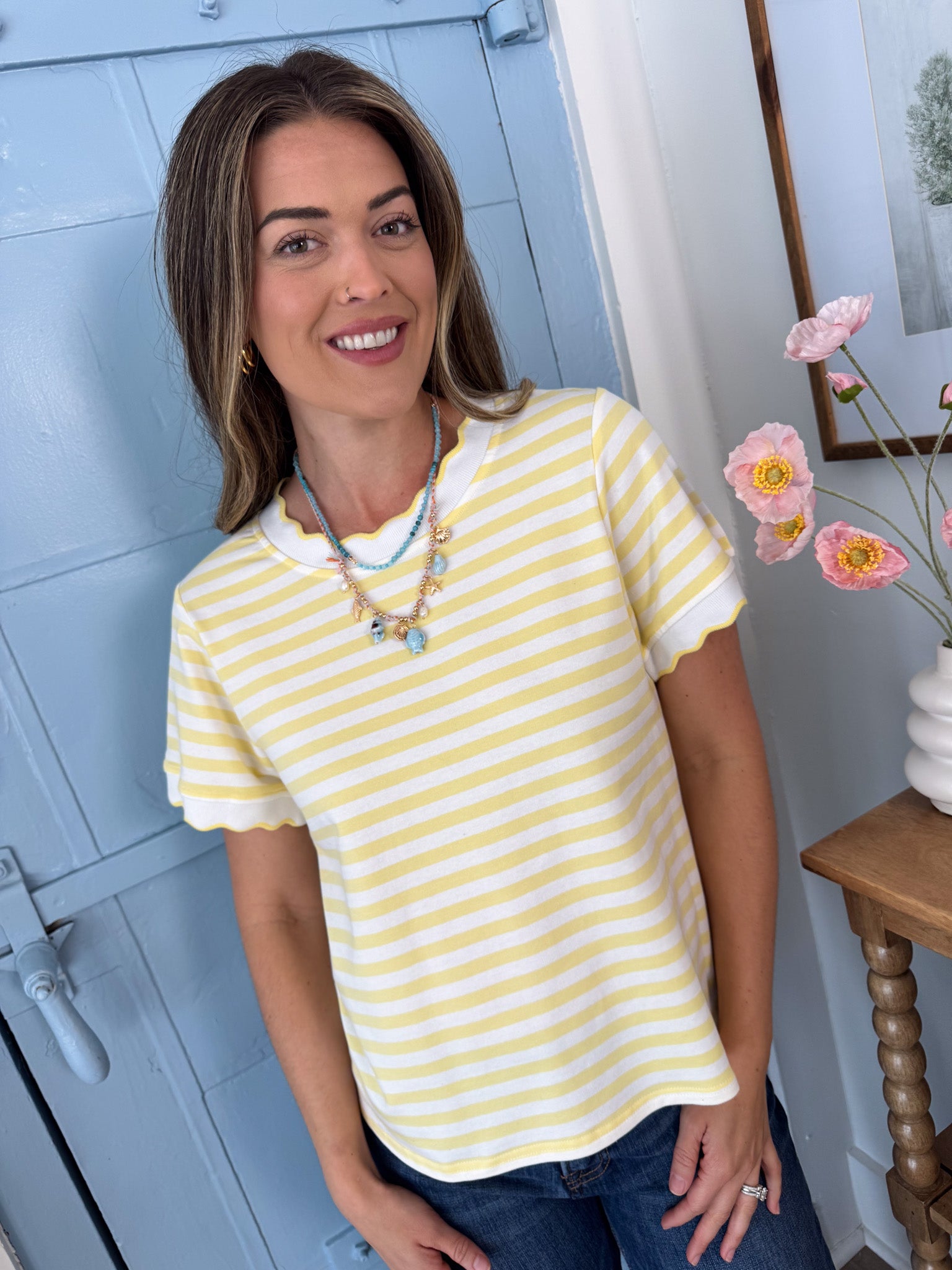 Soft, sunny, and effortlessly cute—this butter yellow striped tee is made for easy, everyday style.