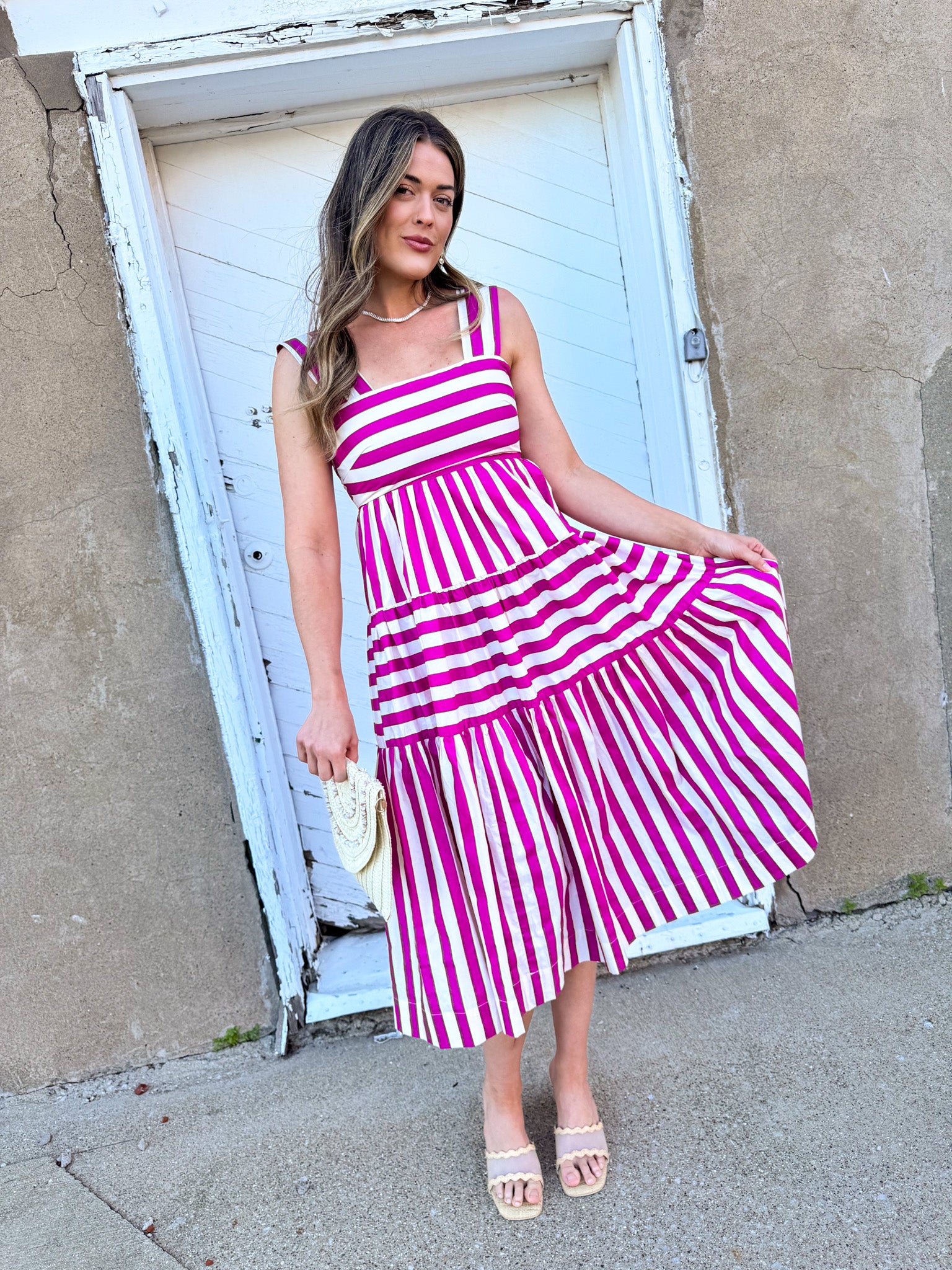 Turn heads in this effortlessly feminine striped midi dress, designed to make a statement while keeping things light and playful.