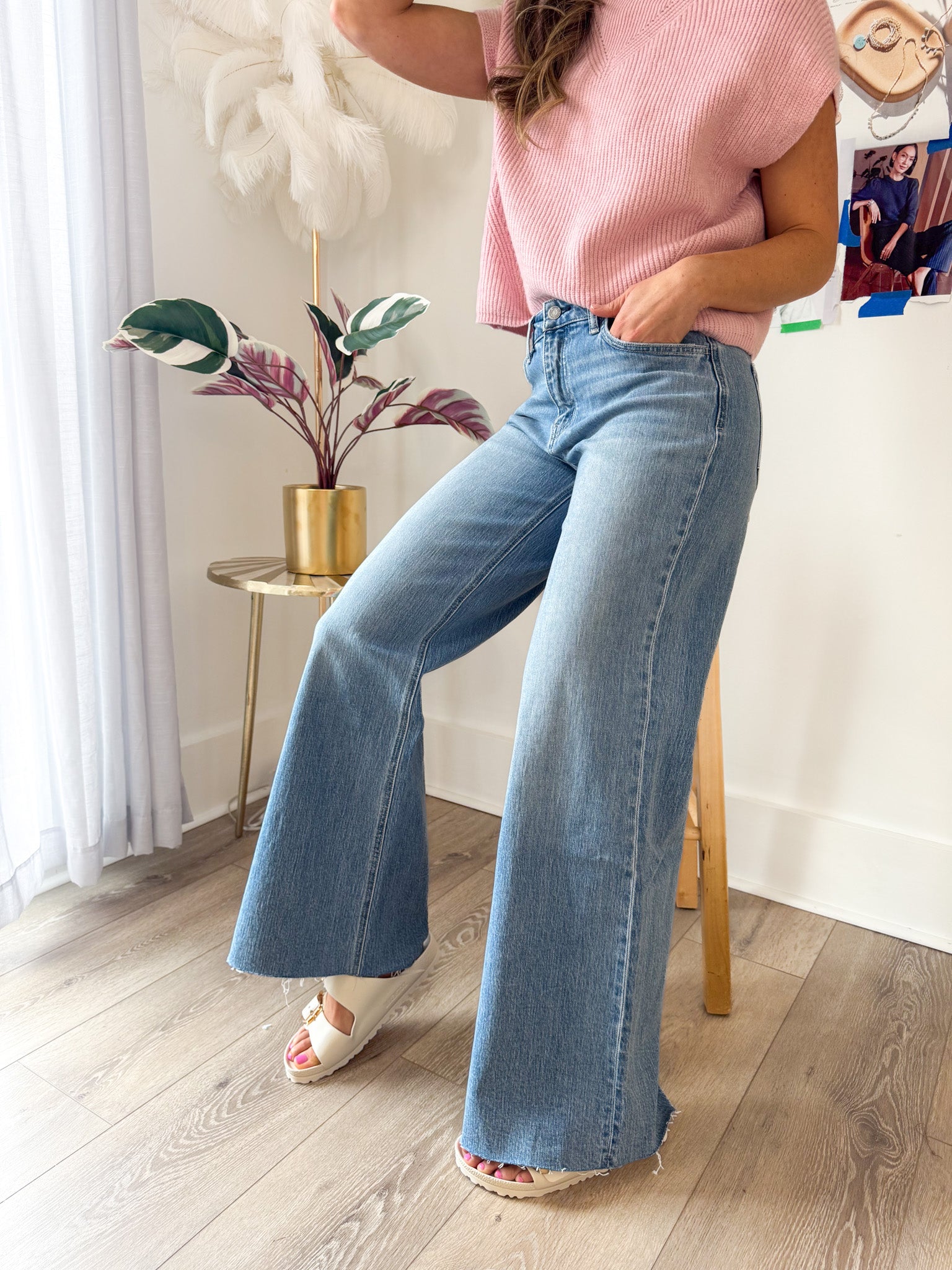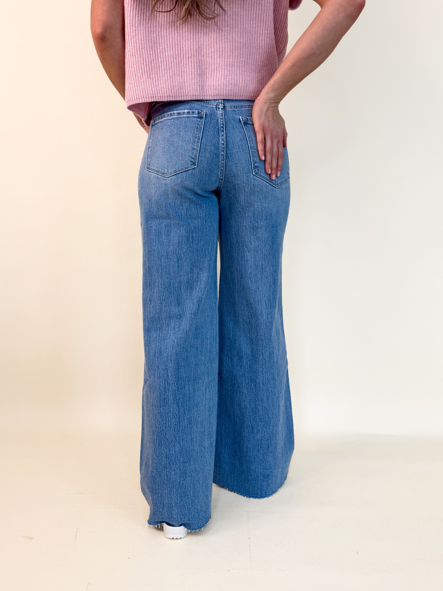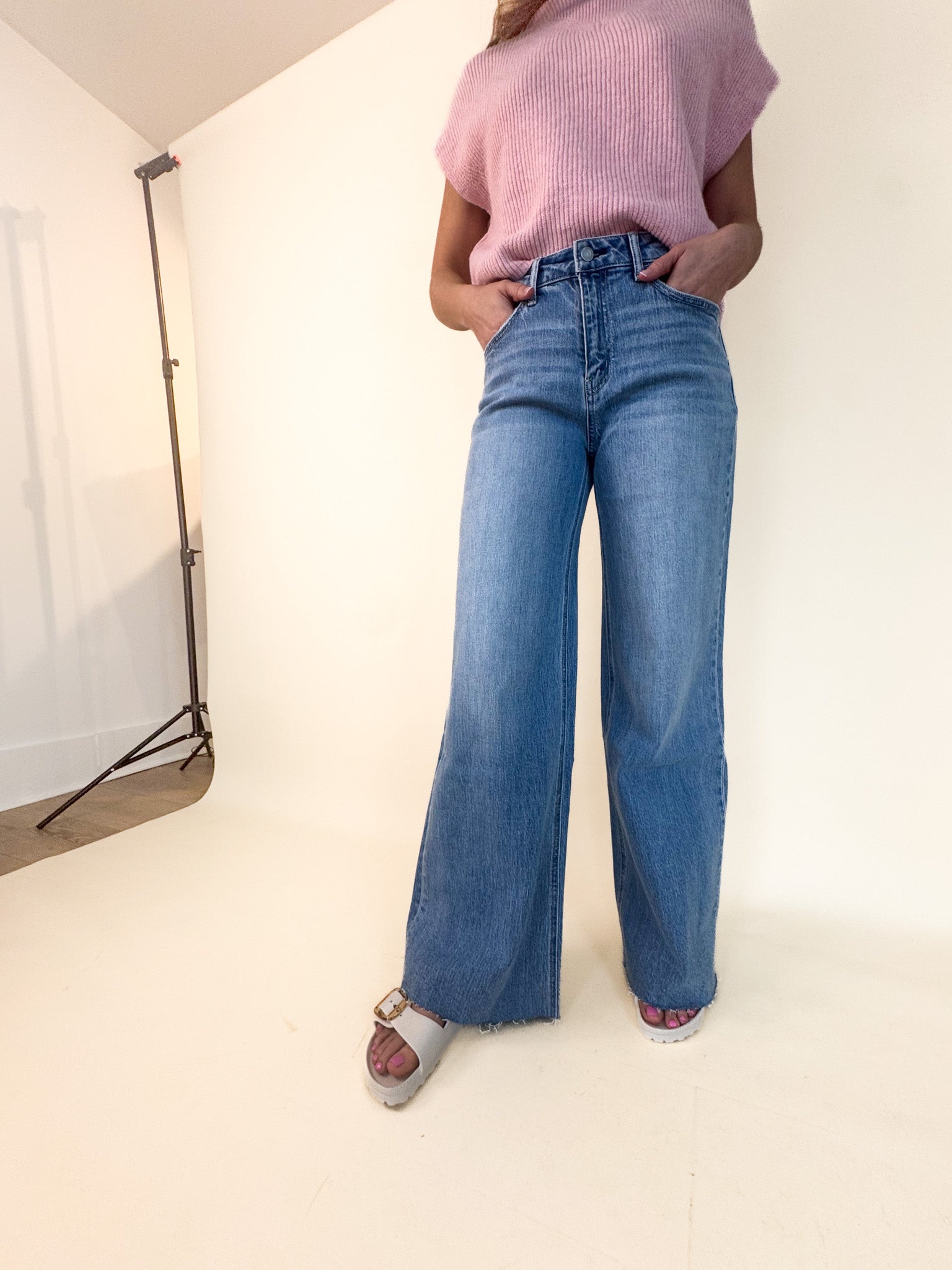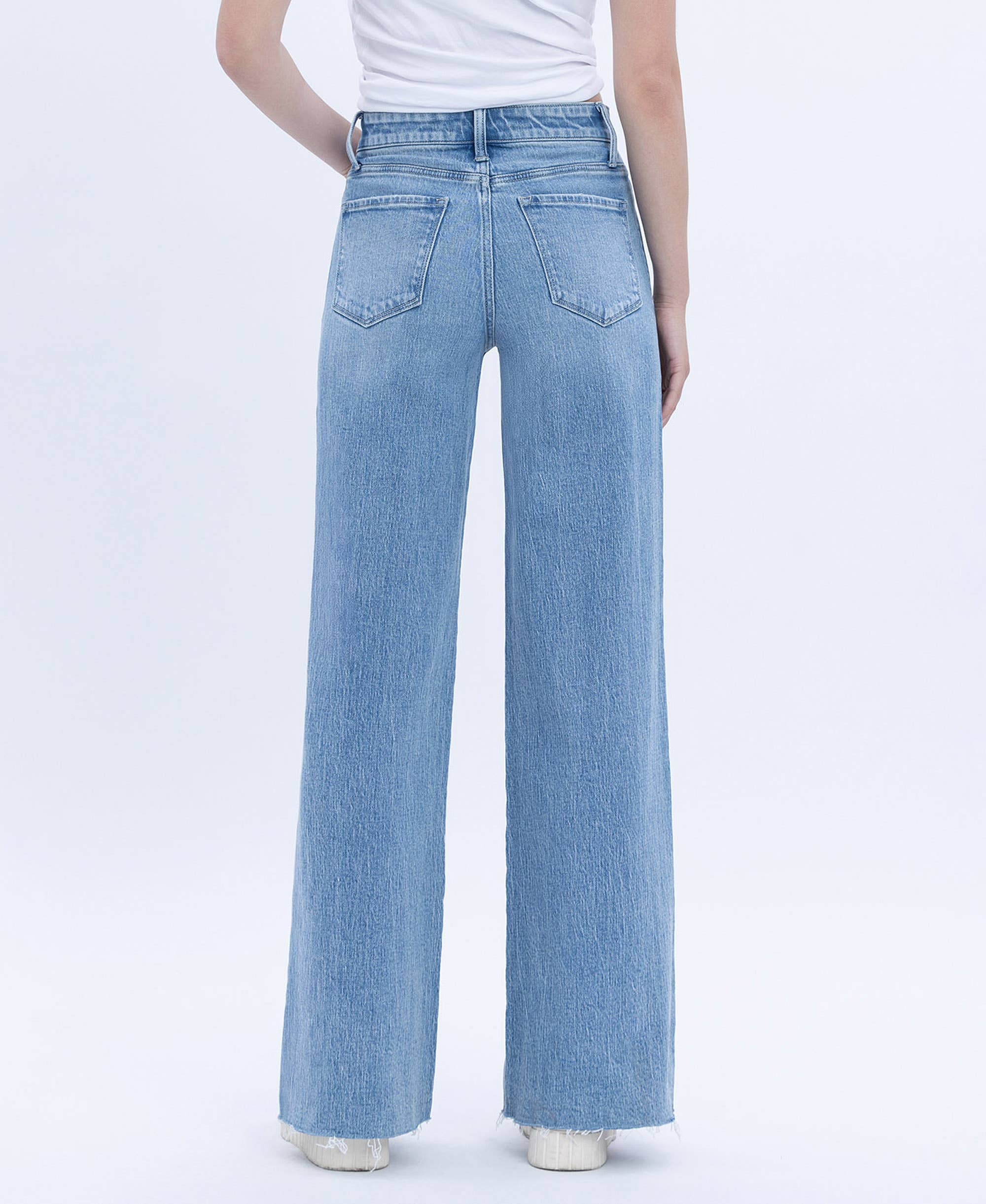 Classic high-rise silhouette with a clean-cut aesthetic and raw hem finish. Crafted from comfort stretch denim for all-day wearability. Wide leg cut delivers a timeless, versatile look that pairs effortlessly with any wardrobe.