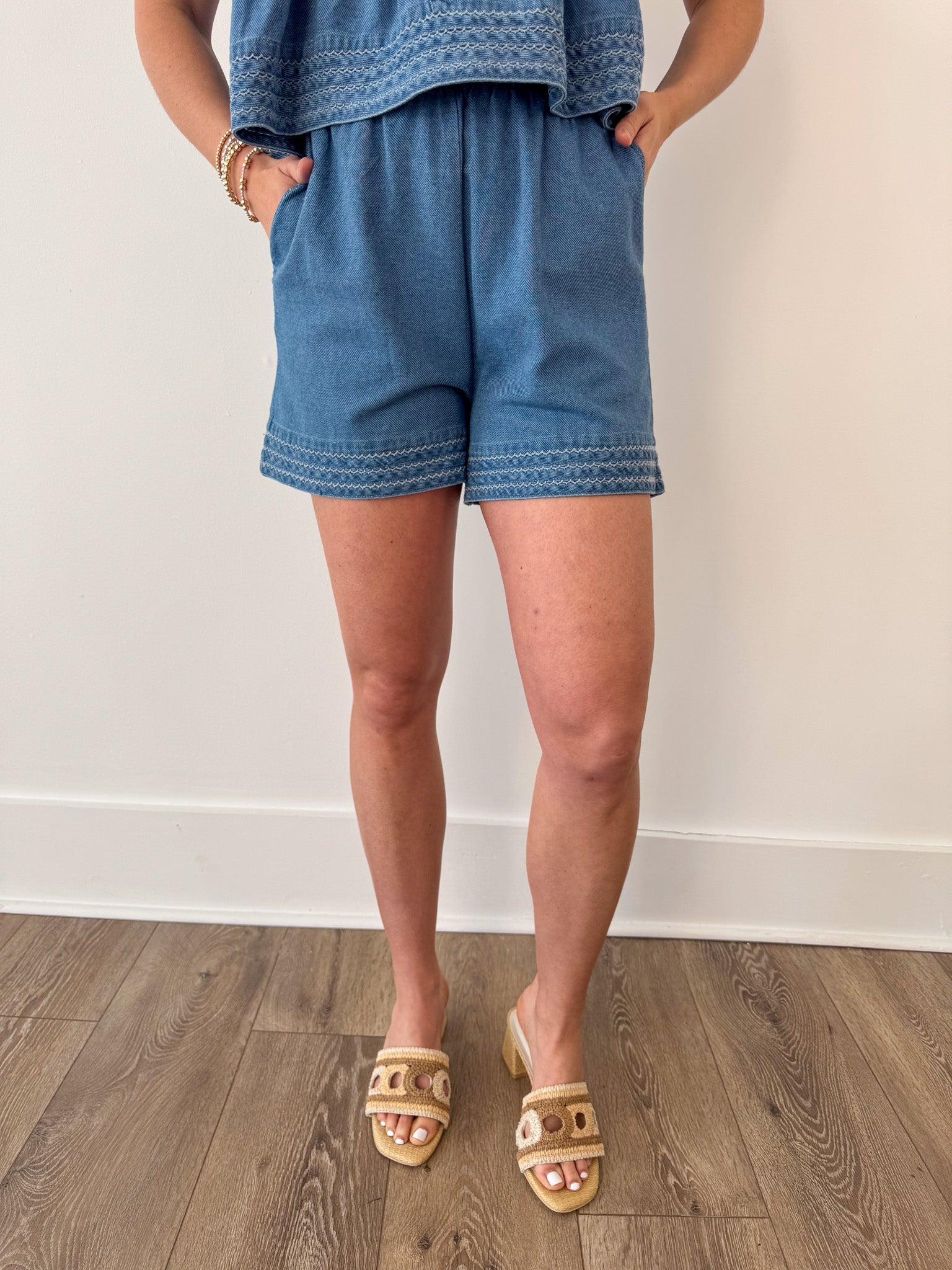 Effortless denim shorts with a subtle ruffle hem that brings just enough edge to your everyday look. Designed with a comfortable elasticated waistband, practical side pockets, and a lightweight woven construction that moves with you