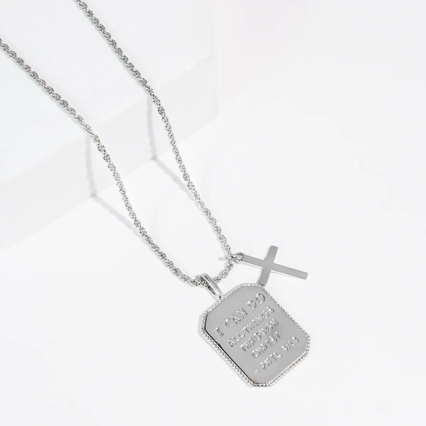 A powerful reminder of strength through Christ ✝️ This gold-tone necklace features a scripture-engraved tag pendant with the inspiring words from Philippians 4:13: * “I can do all things through Christ.” Paired with a delicate cross charm, this meaningful piece represents faith, confidence, and unwavering trust in God’s strength. *