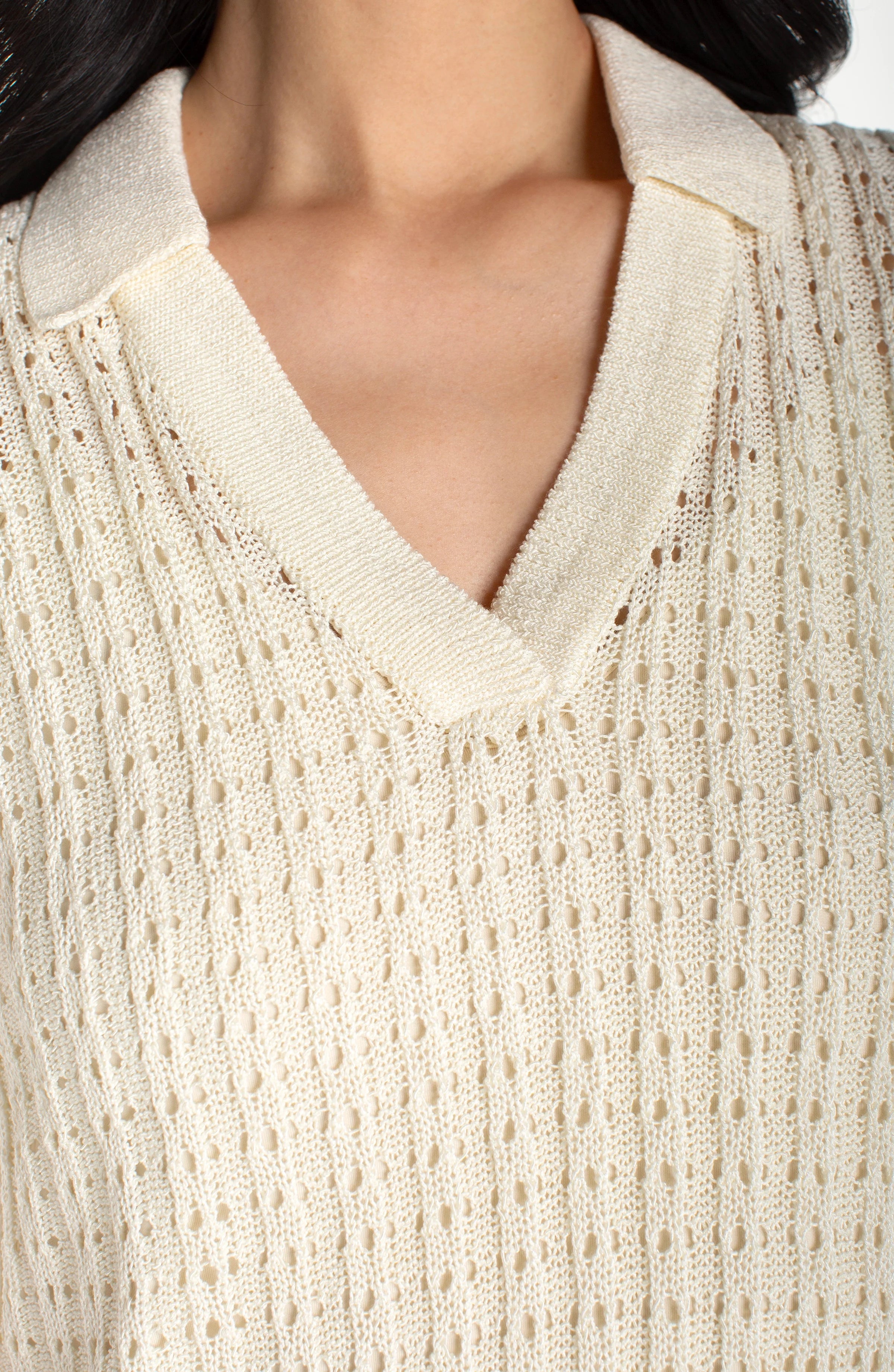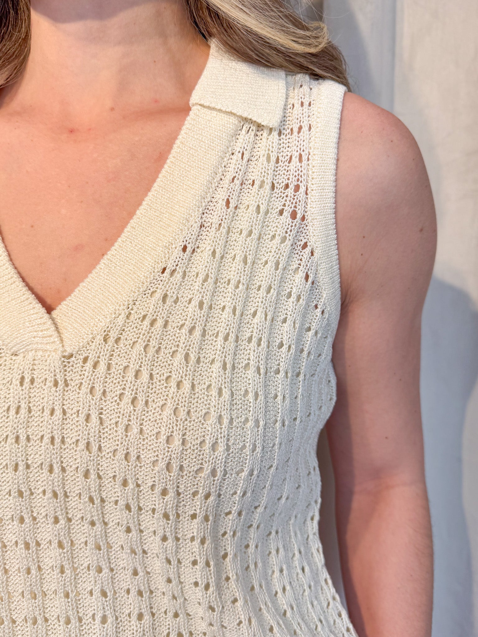 Defined by its open weave knit and modern Johnny collar, this sleeveless sweater delivers lightweight texture and dimension. An effortless piece designed to elevate everyday styling.