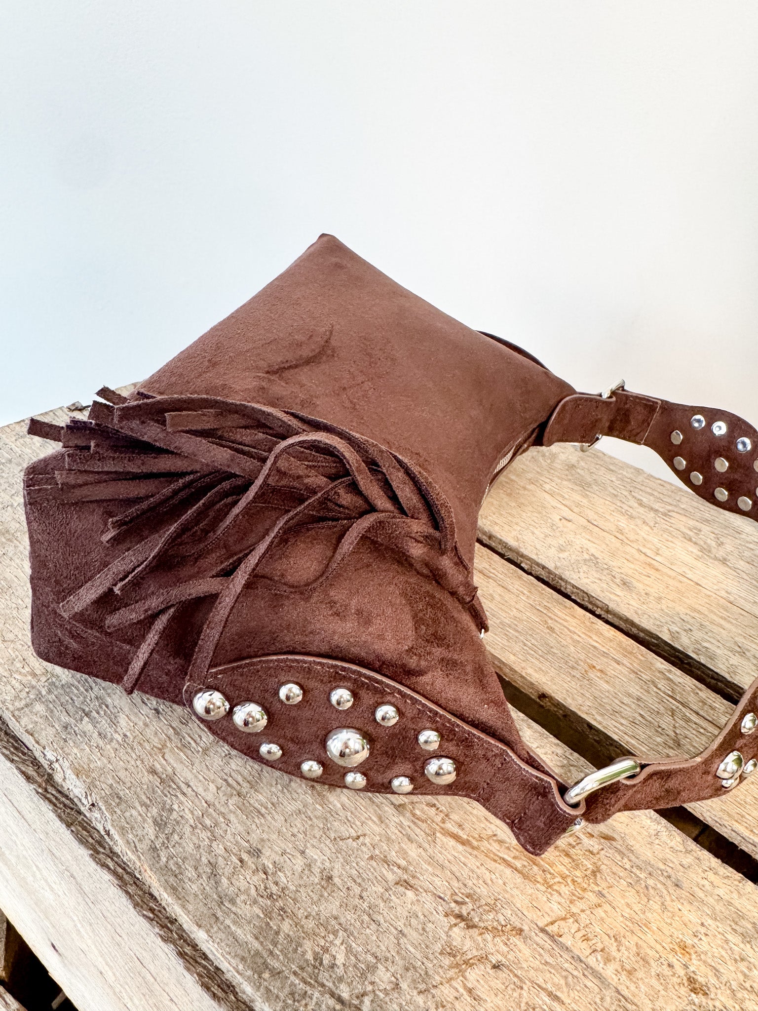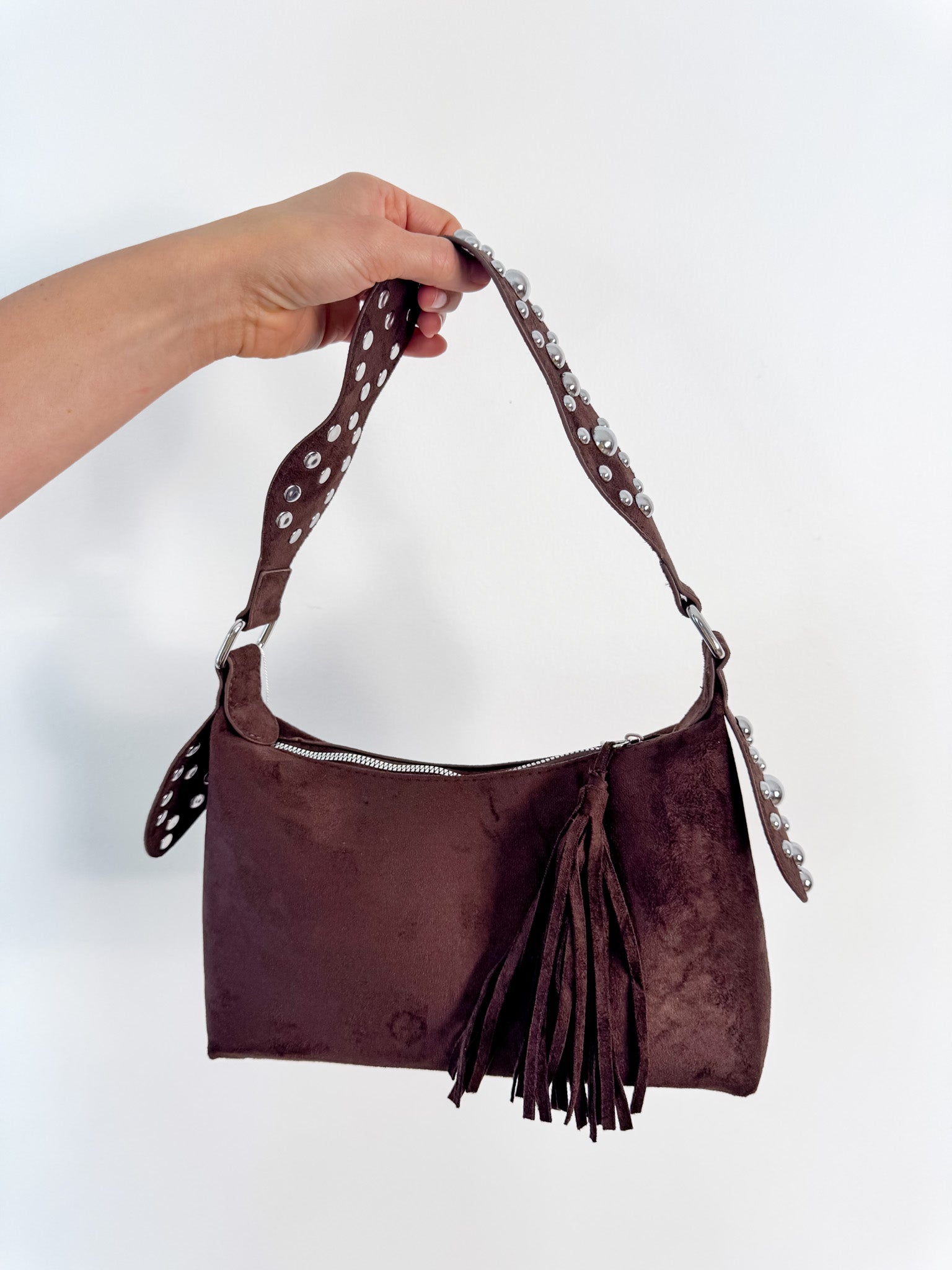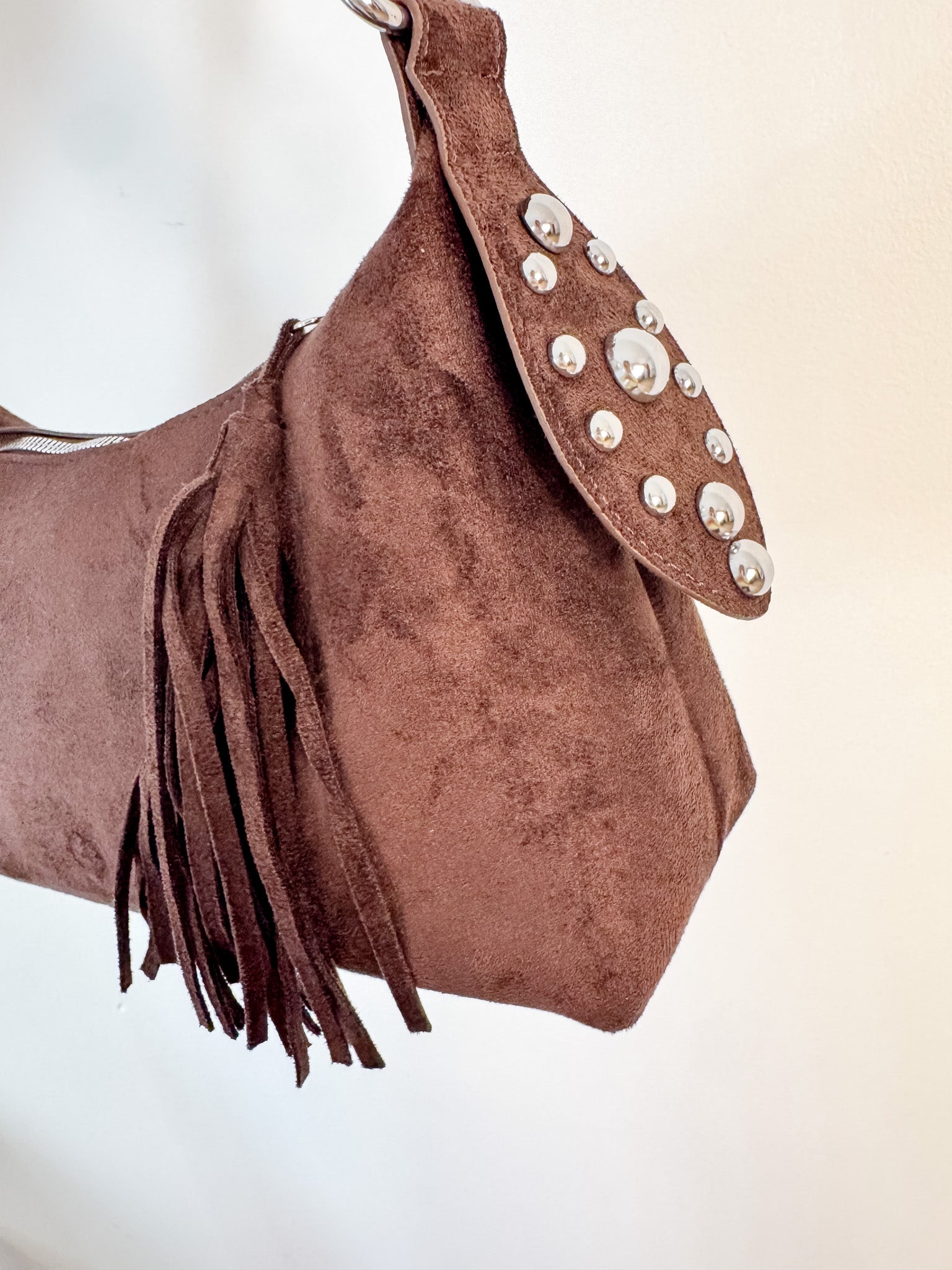 A contemporary shoulder bag featuring metallic dome studs on soft suede, designed for those who embrace modern accessory trends. This piece combines understated elegance with bold detailing, making it an effortless addition to any wardrobe.