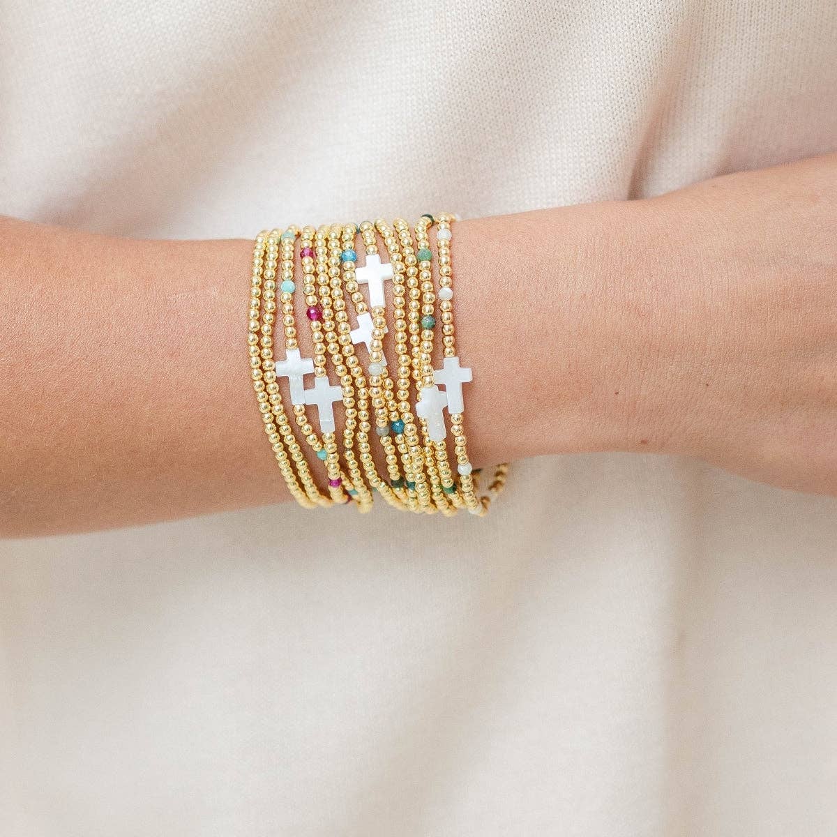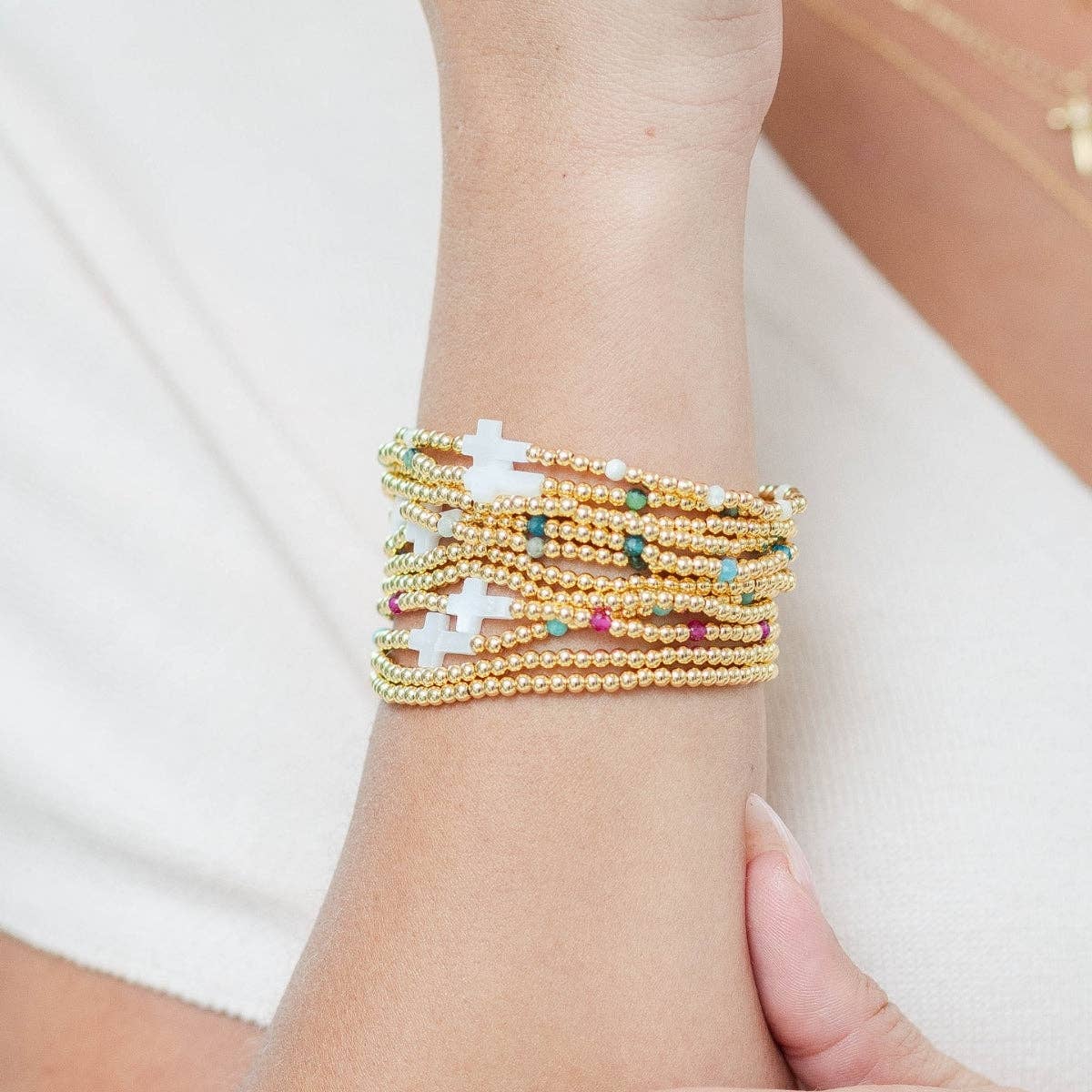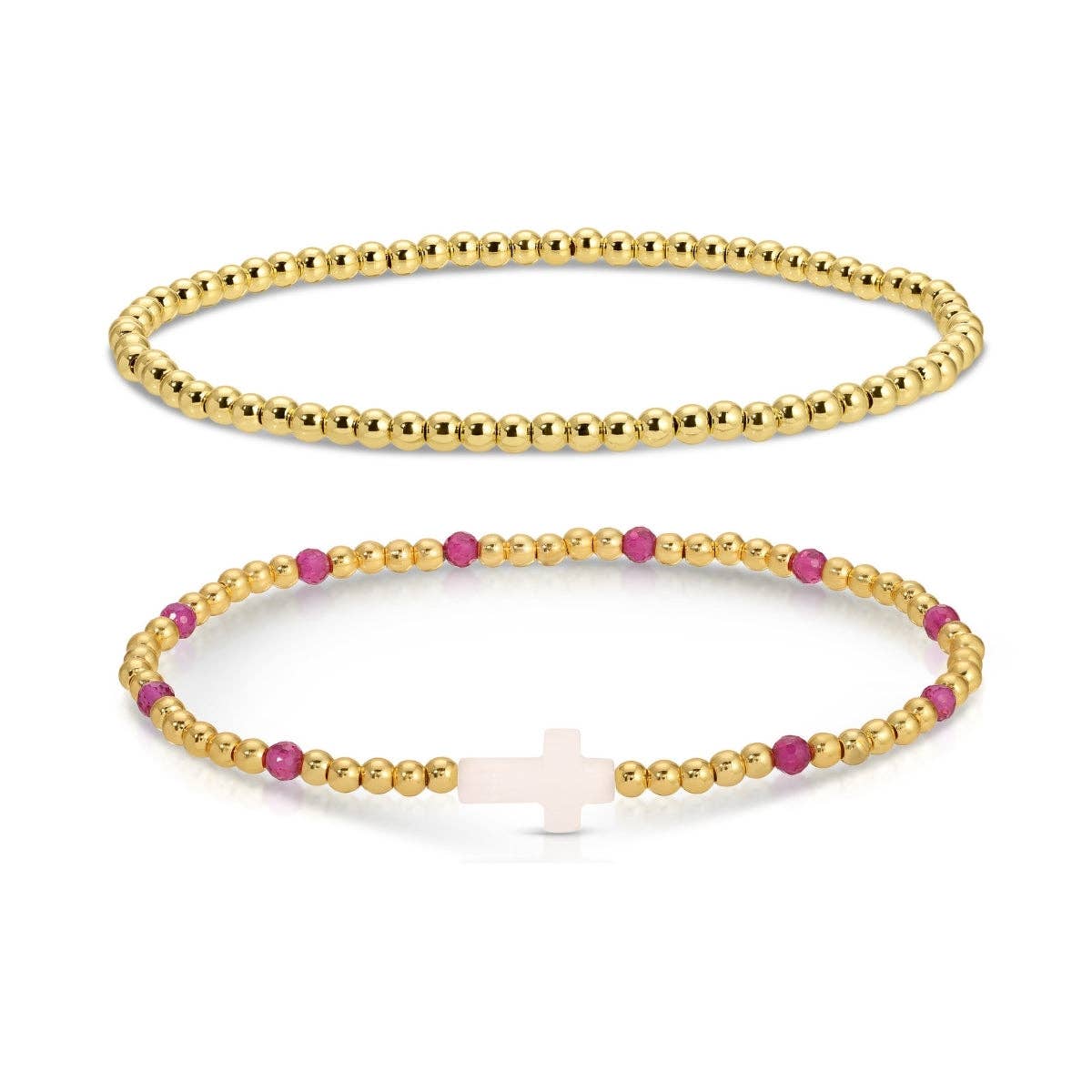 Elevate your everyday stack with the Cross Beaded Bracelet Charm Set. This 18K gold plated bracelet set pairs a simple gold plated beaded bracelet with a vibrant colorful stone accented cross beaded bracelet. Designed with comfortable stretch styling, these bracelets are perfect worn together or mixed into your favorite stack for effortless elegance.