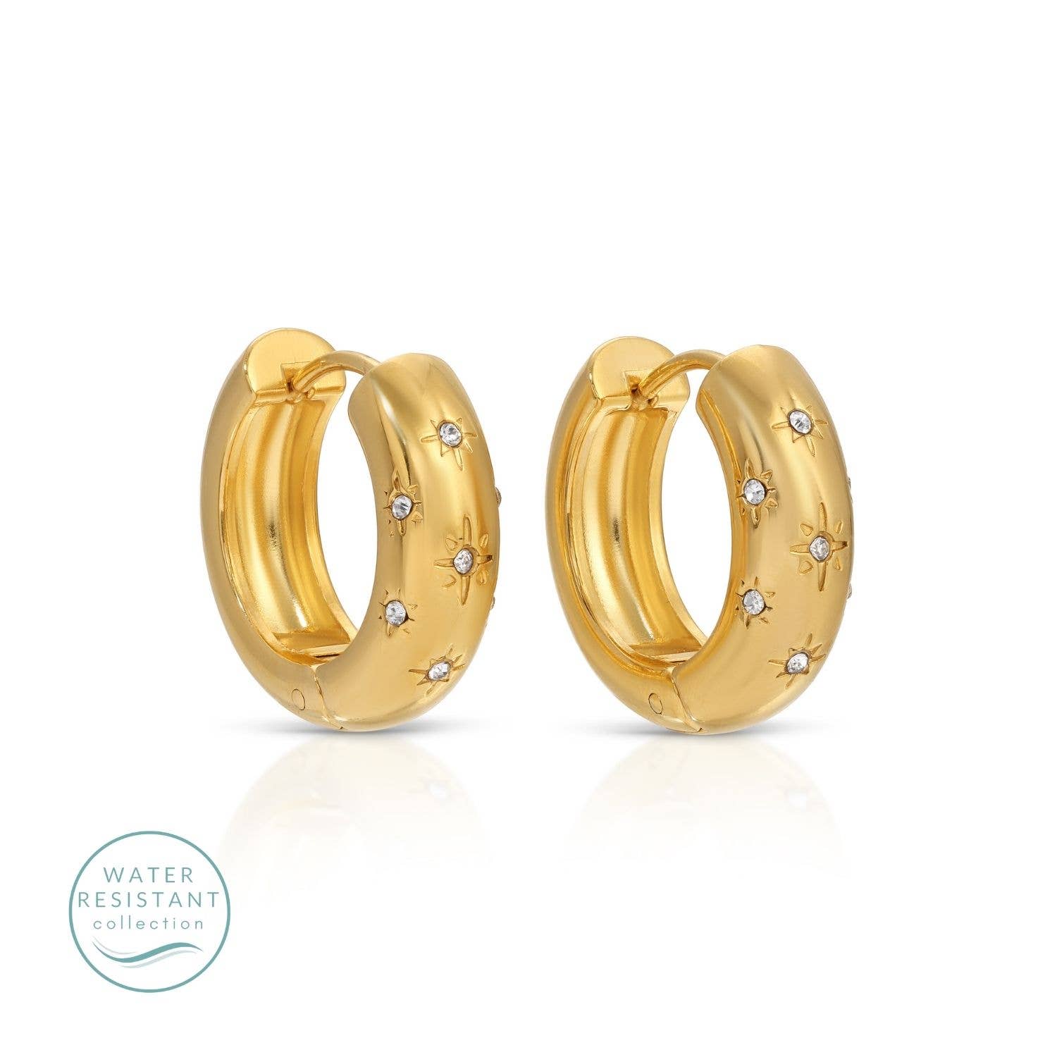 Add a celestial sparkle to your everyday look with our dazzling CZ Burst Water Resistant Huggies! These enchanting earrings are designed for continuous wear, offering brilliant shine and exceptional durability for any adventure.