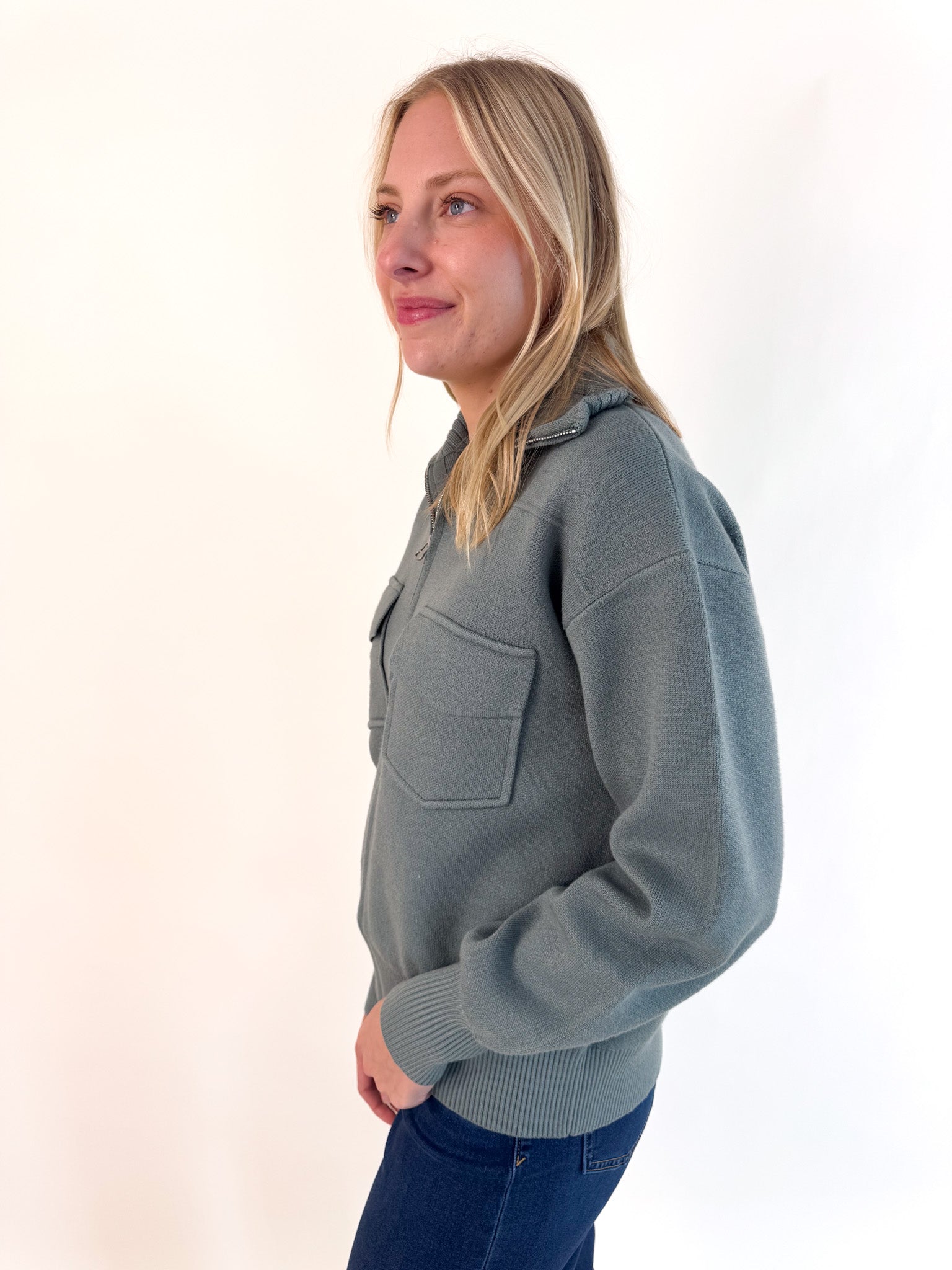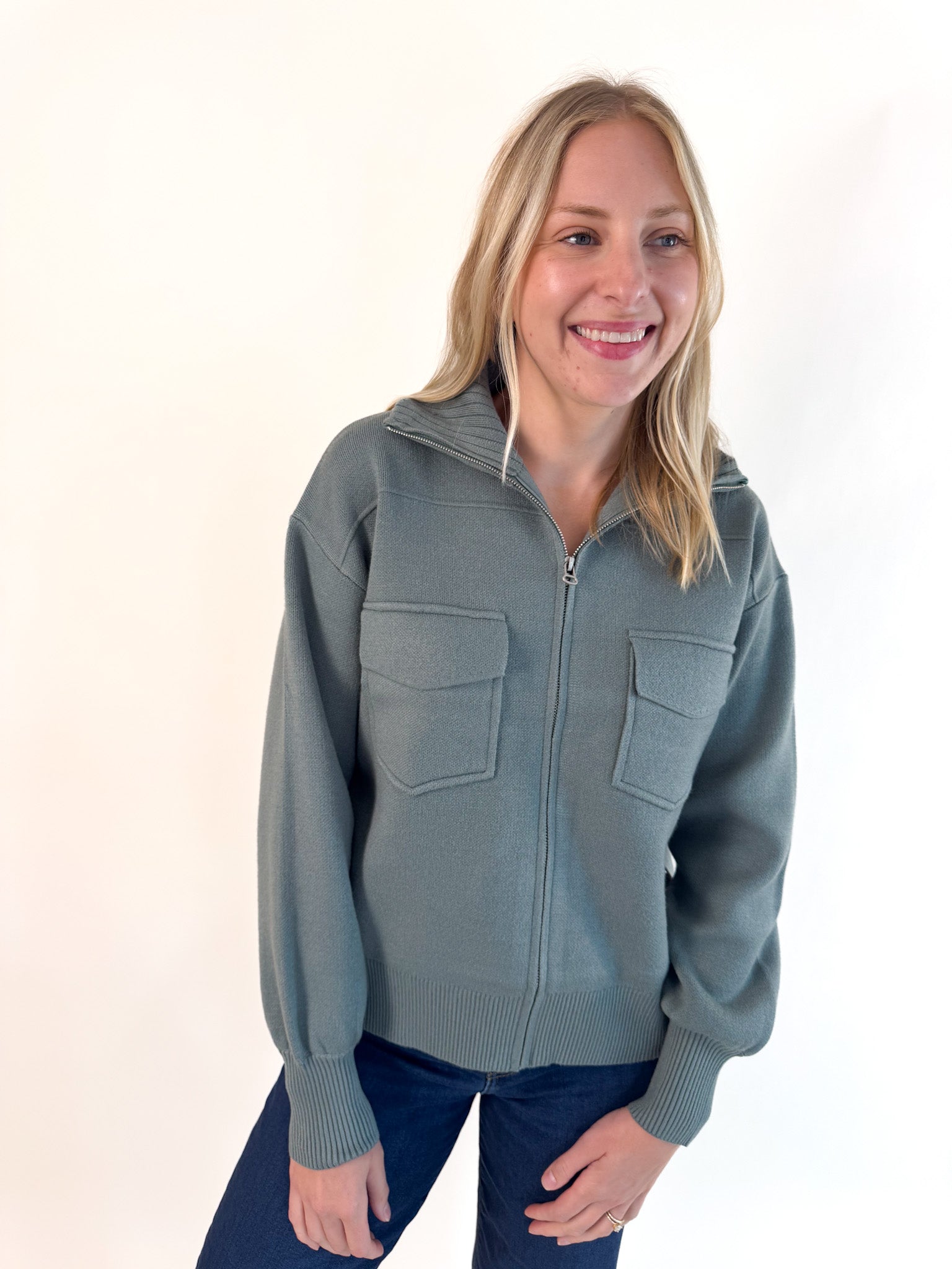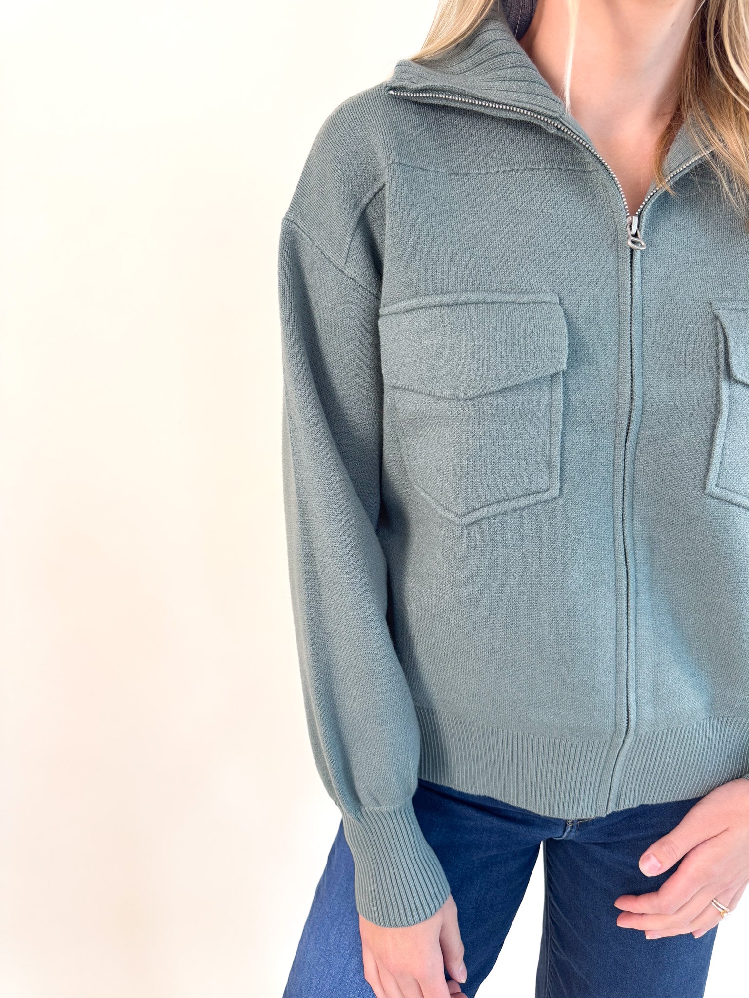 A fresh twist on a classic layer, this dusty jade zip-up jacket features an oversized collar and ribbed details that add modern structure and cozy appeal.