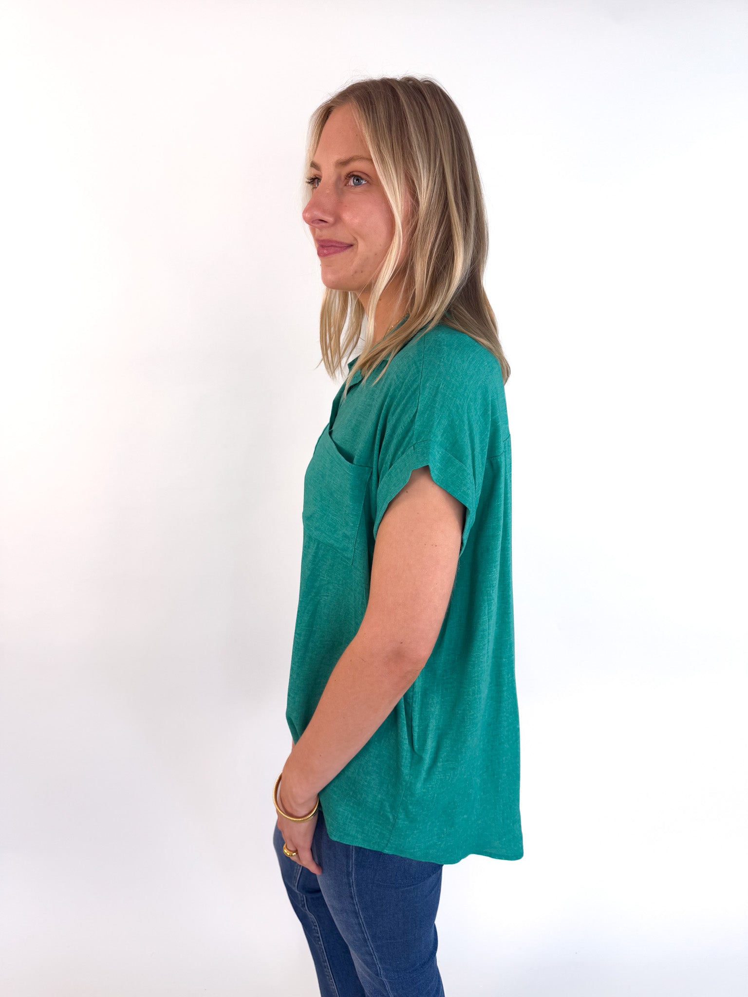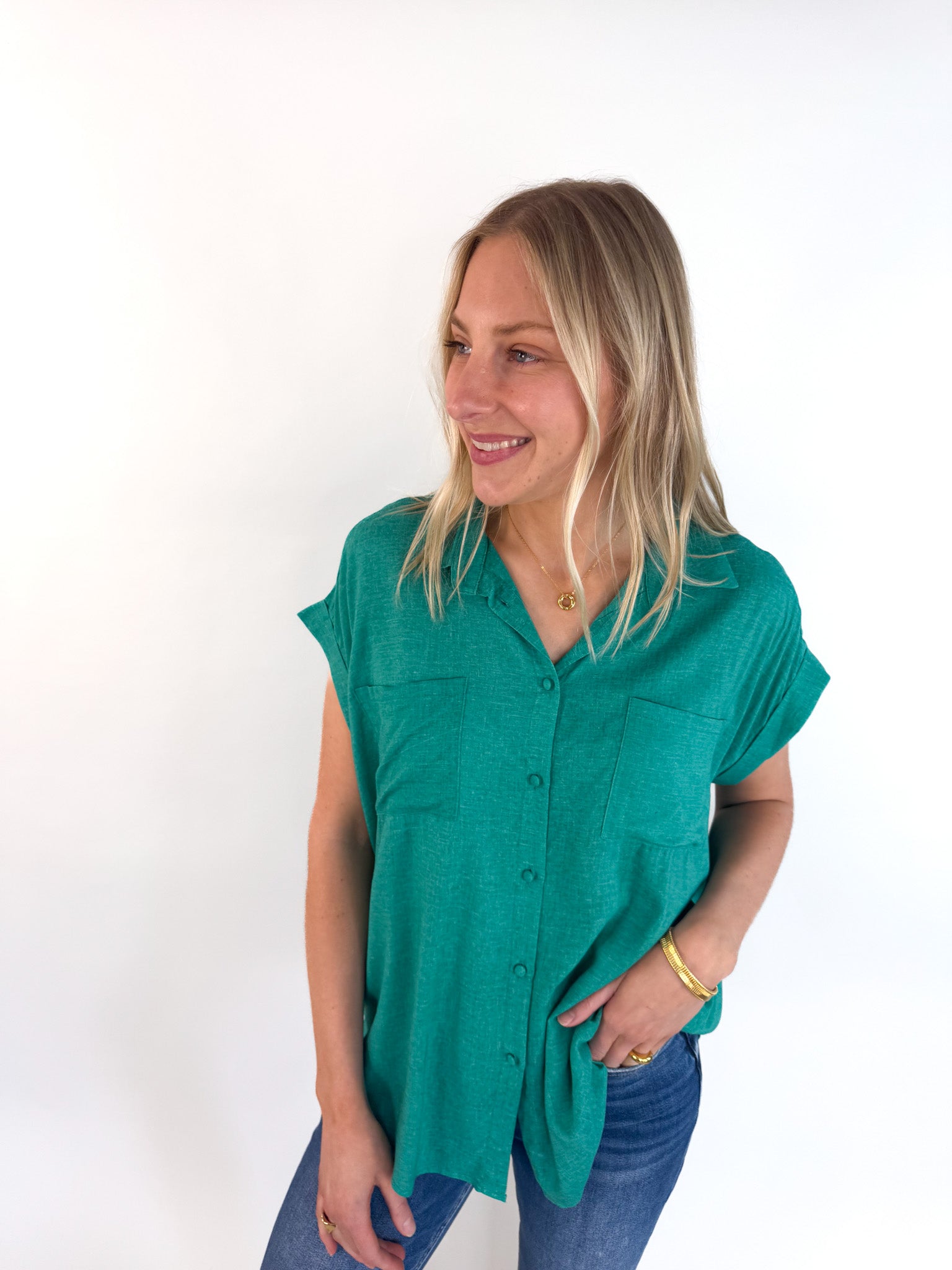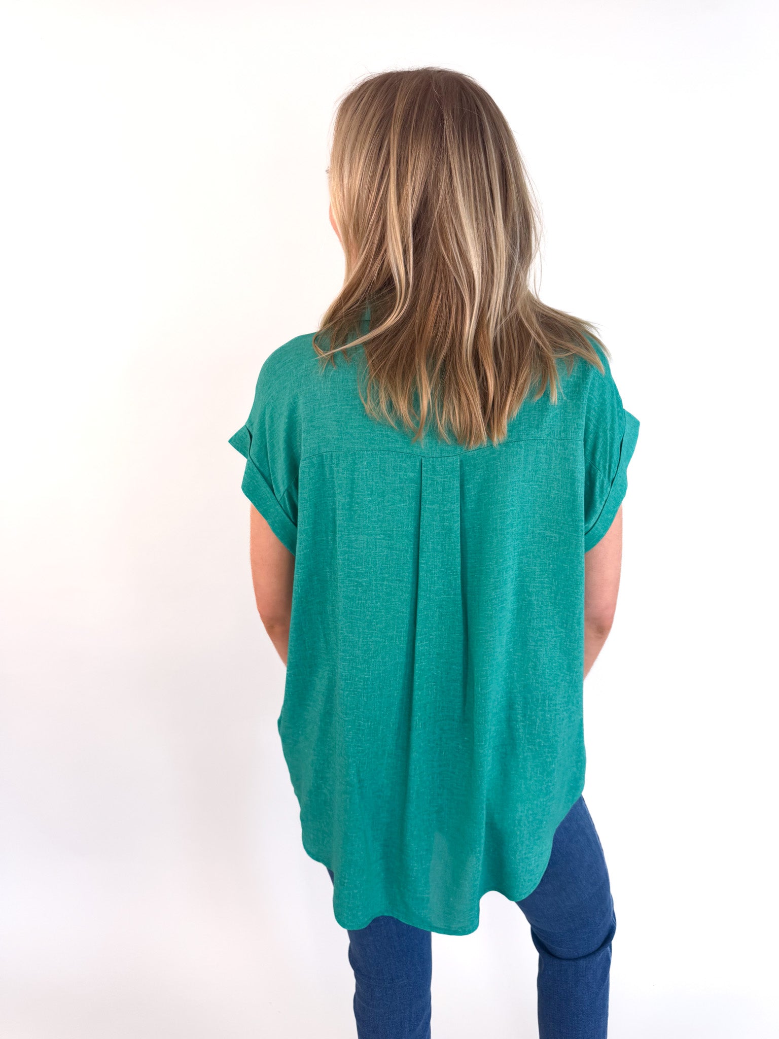 Bold color meets clean lines in the Emerald Woven Blouse—a modern take on a classic silhouette.