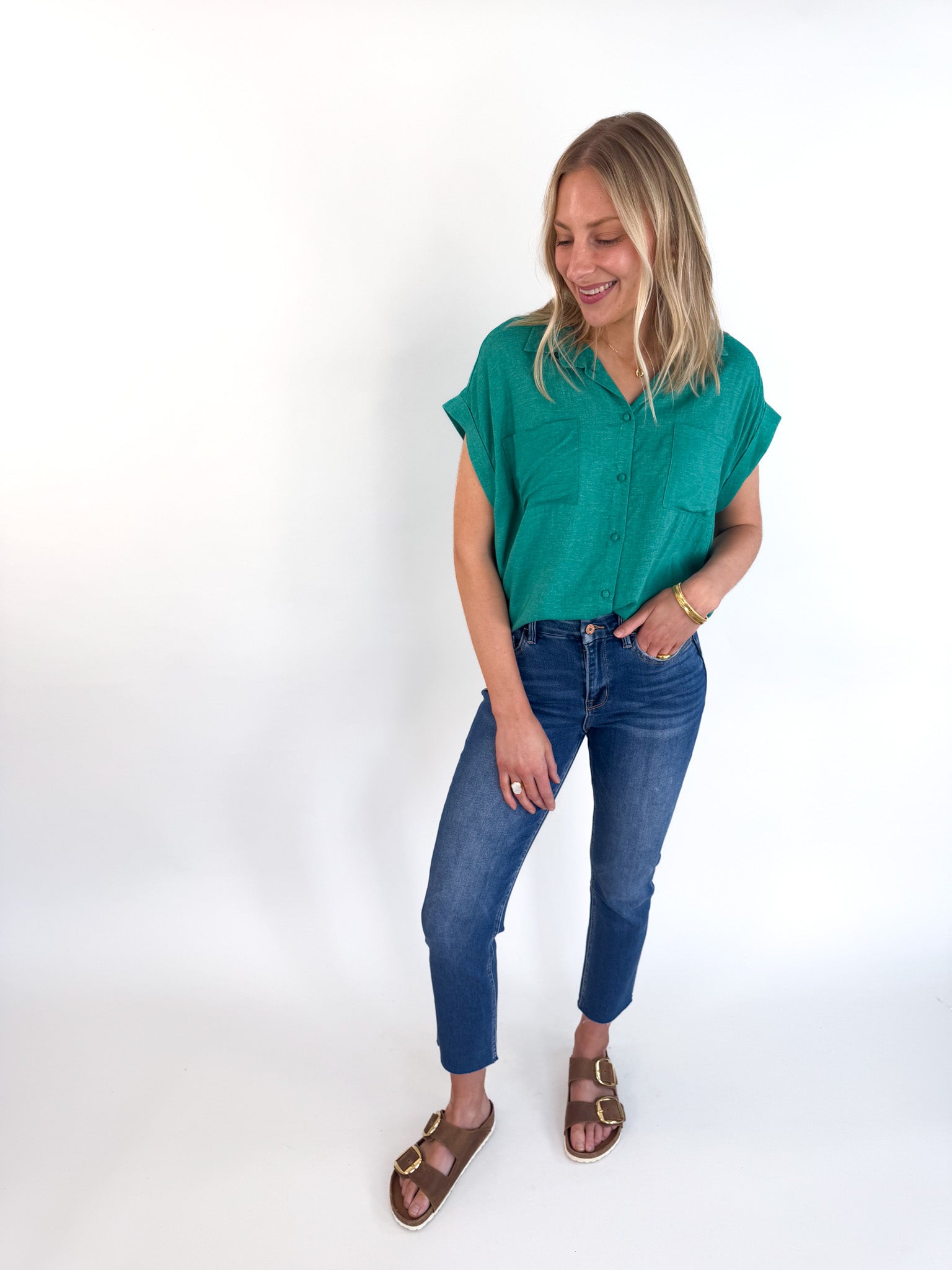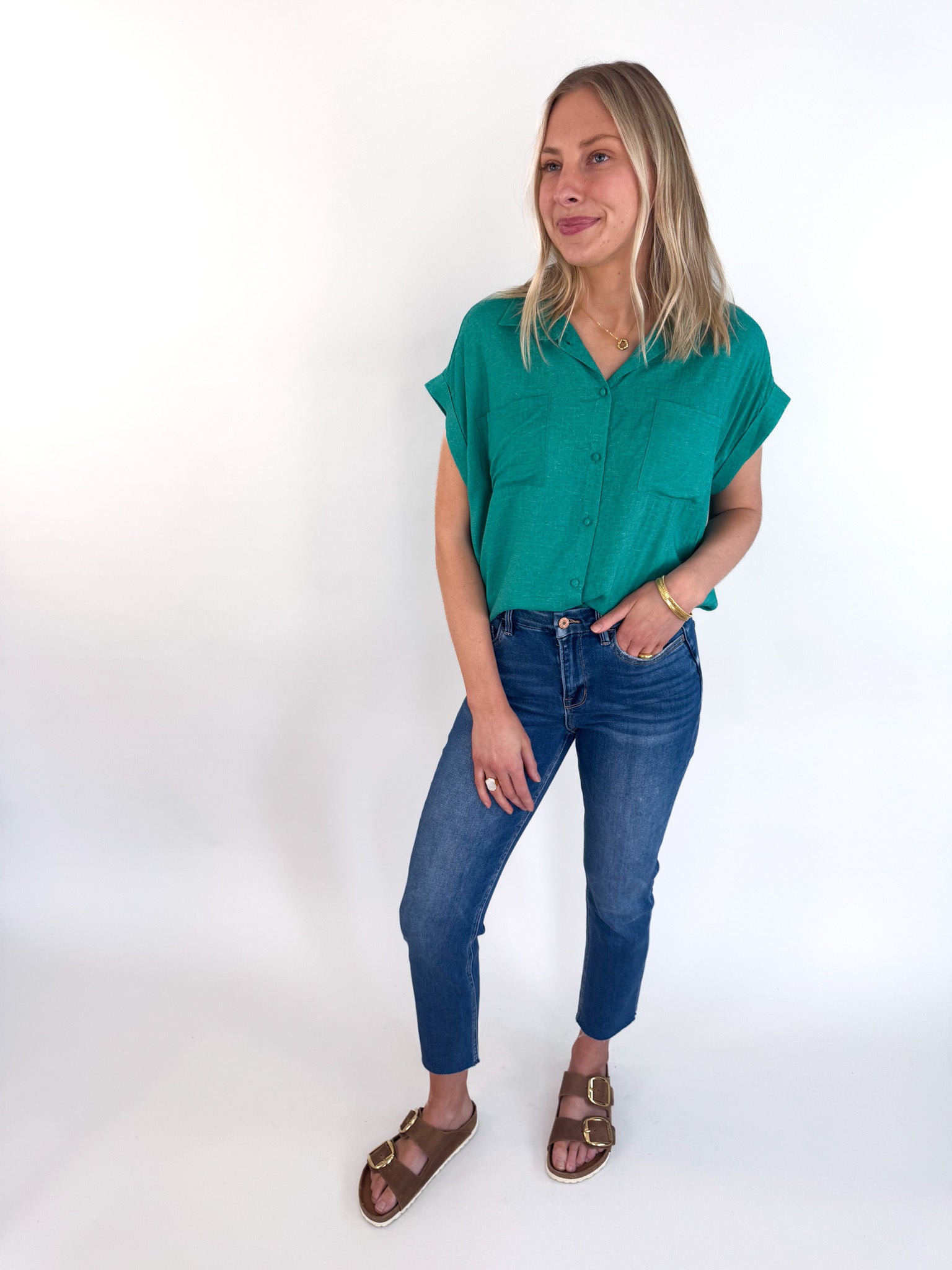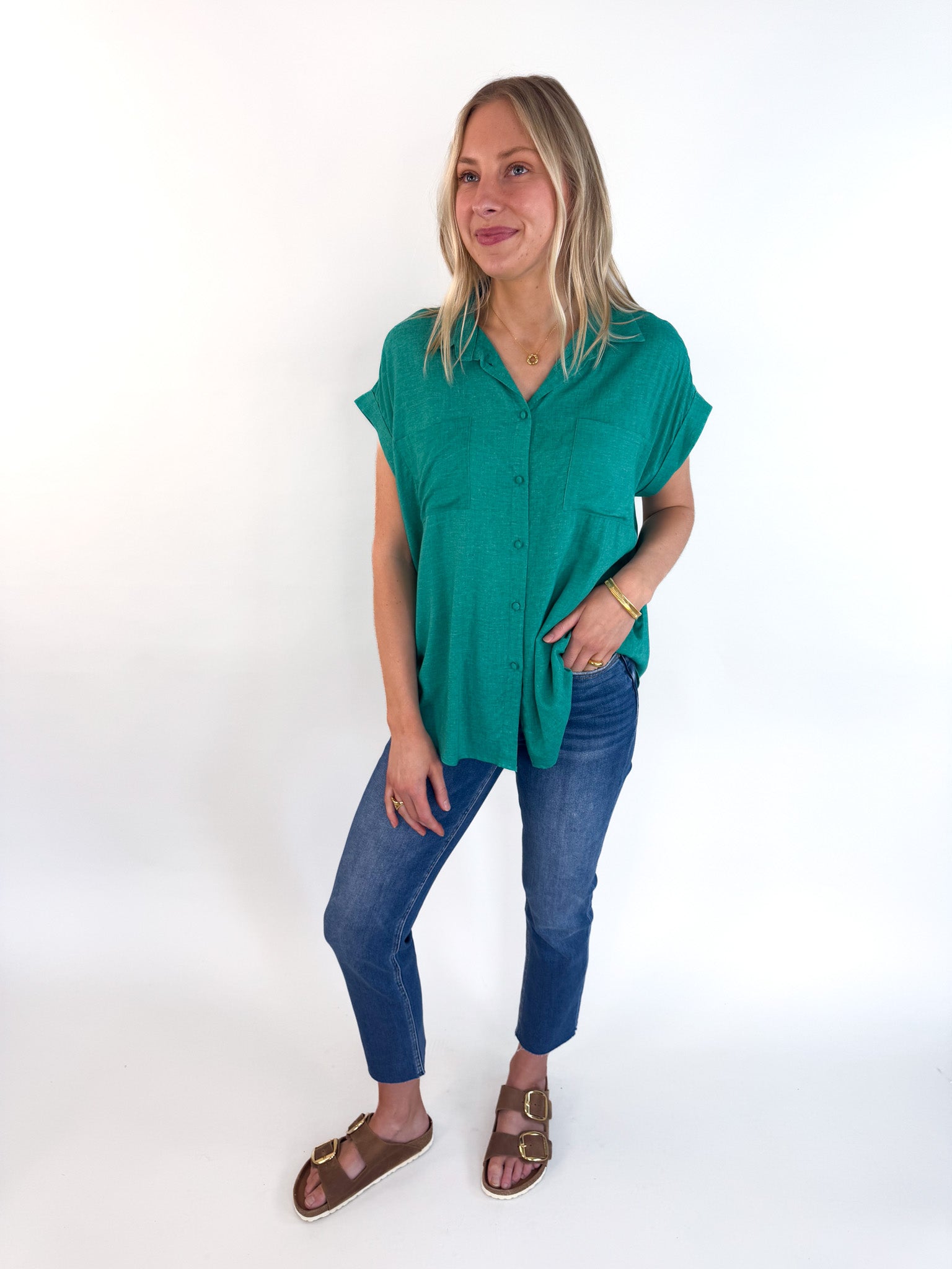 Bold color meets clean lines in the Emerald Woven Blouse—a modern take on a classic silhouette.