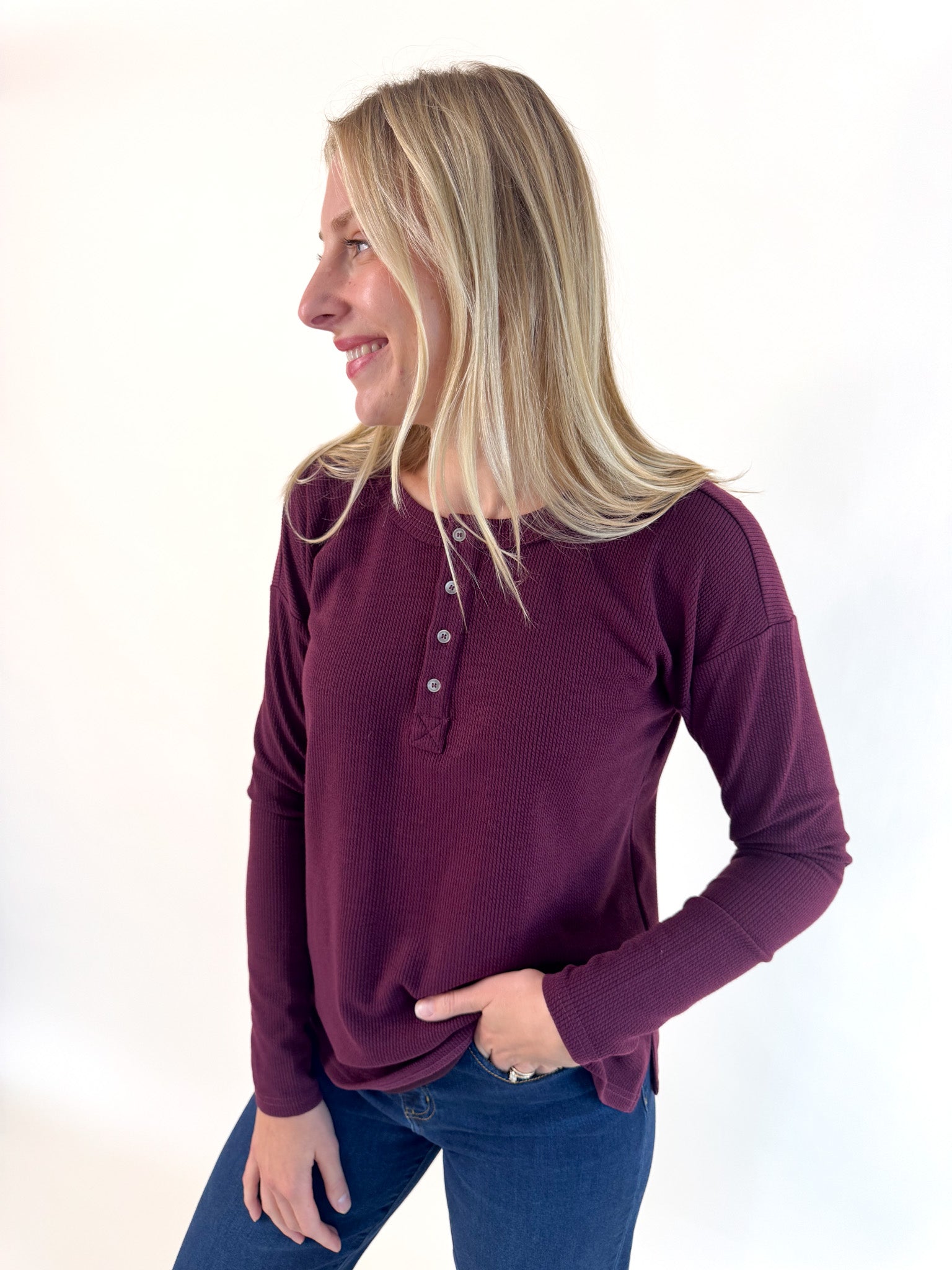 Easygoing and versatile, this long sleeve Henley is crafted in a rich plum hue with a soft waffle knit texture. The button-up neckline adds a classic touch, while subtle side slits give it a flattering, relaxed drape. Perfect on its own or layered under jackets and cardigans, this top is a cozy staple that transitions seamlessly from weekday casual to weekend laid-back style.