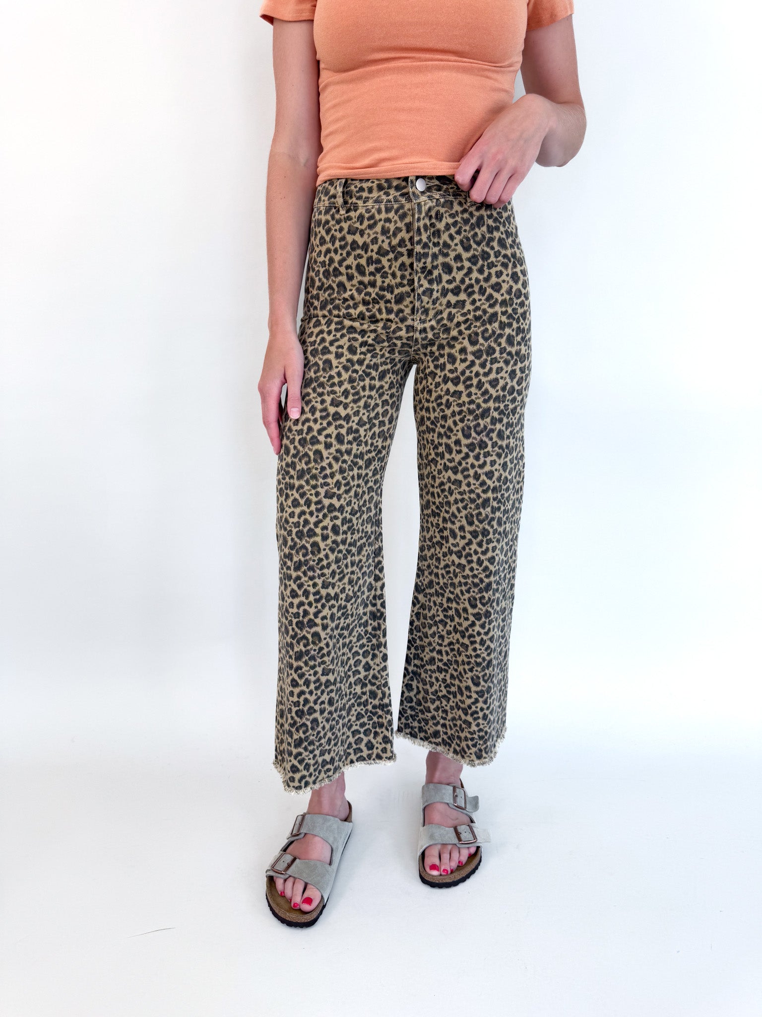 Unleash your wild side with these bold cheetah print denim pants. Crafted from soft twill denim with just the right amount of structure, they feature a flattering wide-leg silhouette and edgy frayed hems for a lived-in feel.