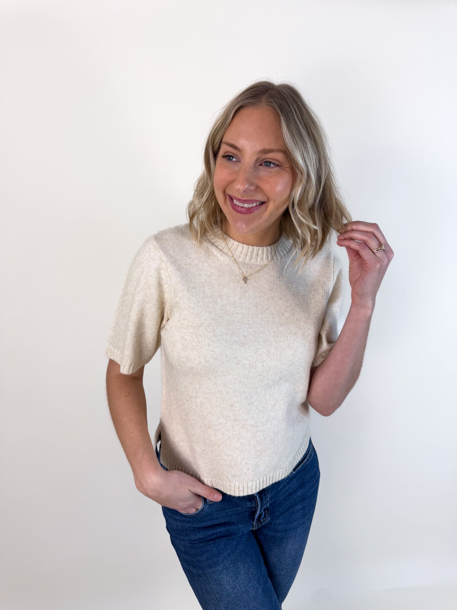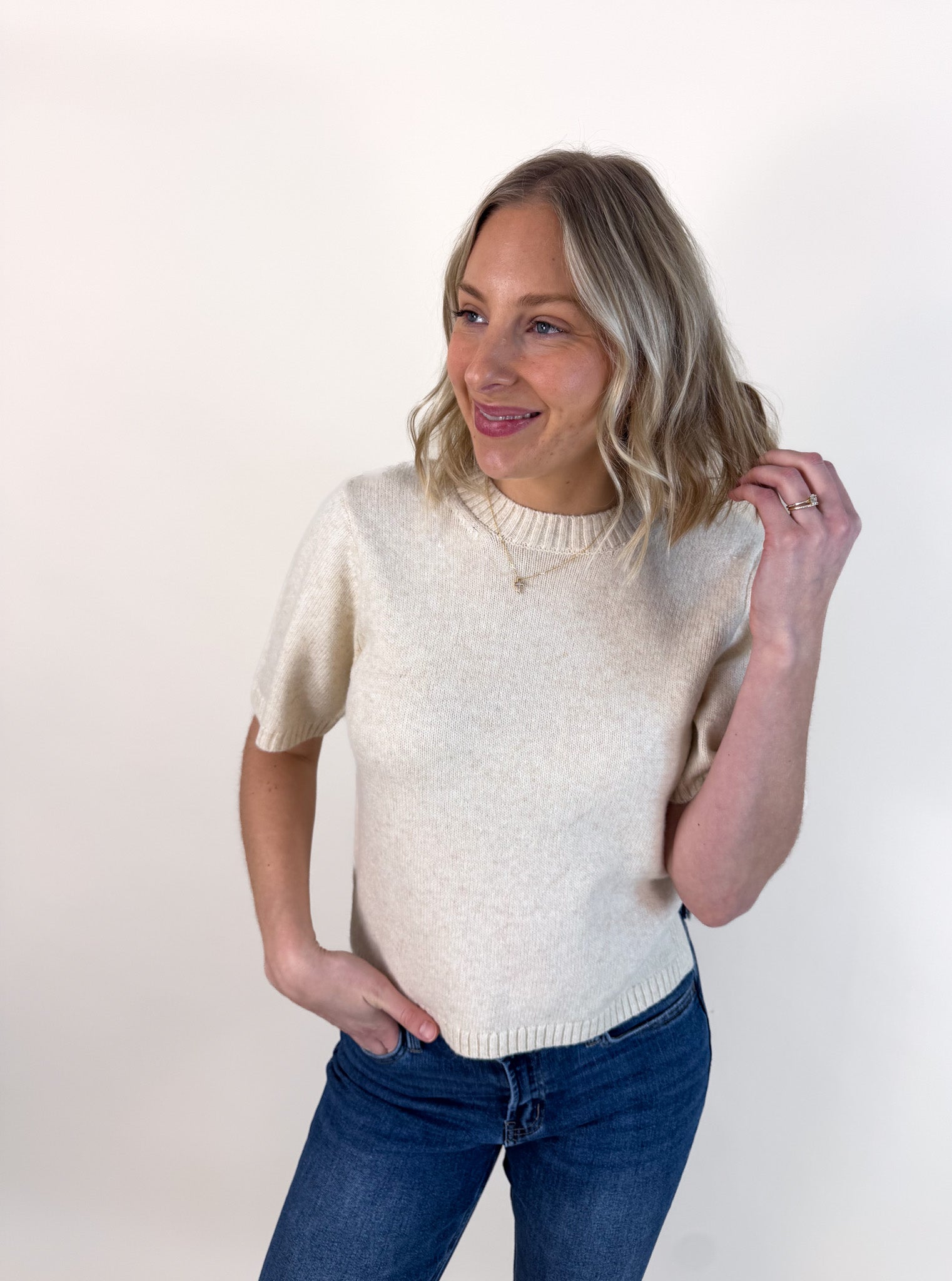 Soft, relaxed short sleeves meet elevated styling for that "dressed up but make it comfy" vibe.