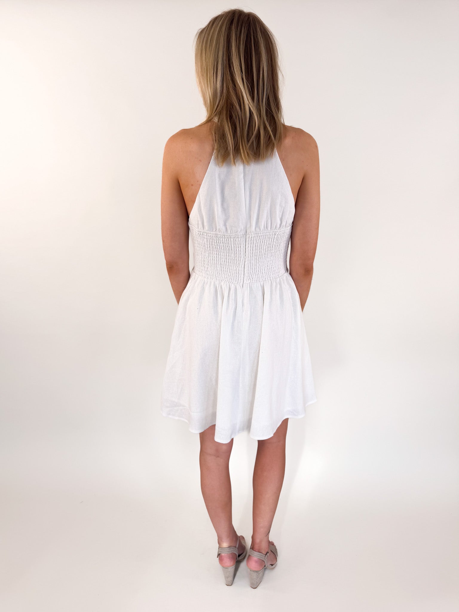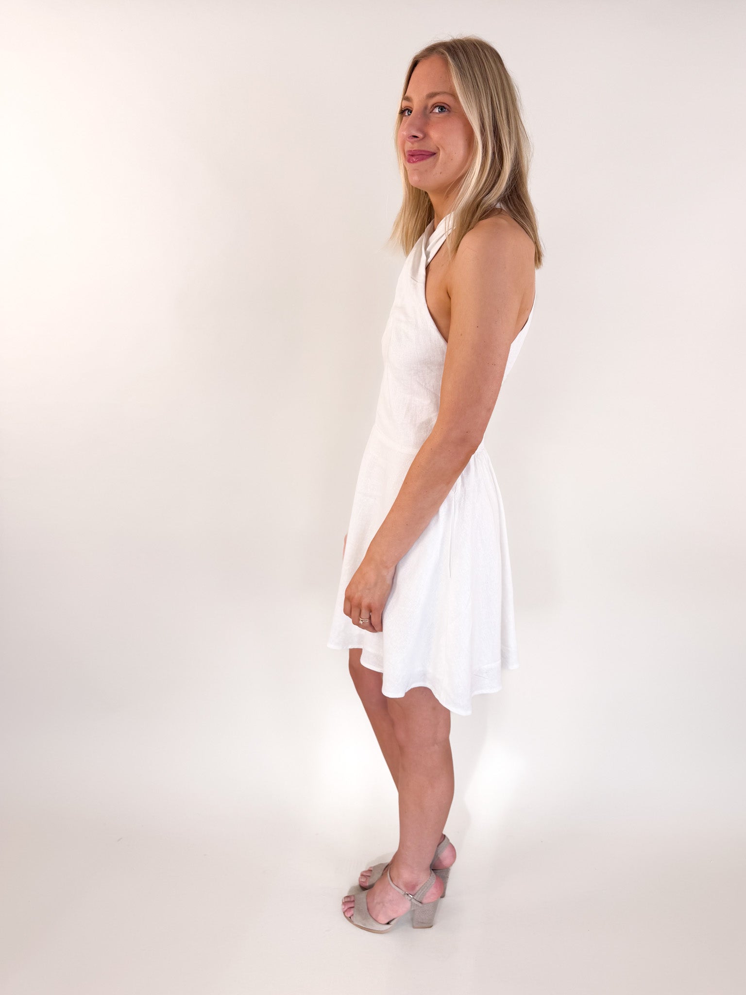 The KOSTA dress is a stylish mini dress with a cross-neck design and halter style, creating a flattering and elegant look. Perfect for any occasion, this dress is a must-have in your wardrobe.