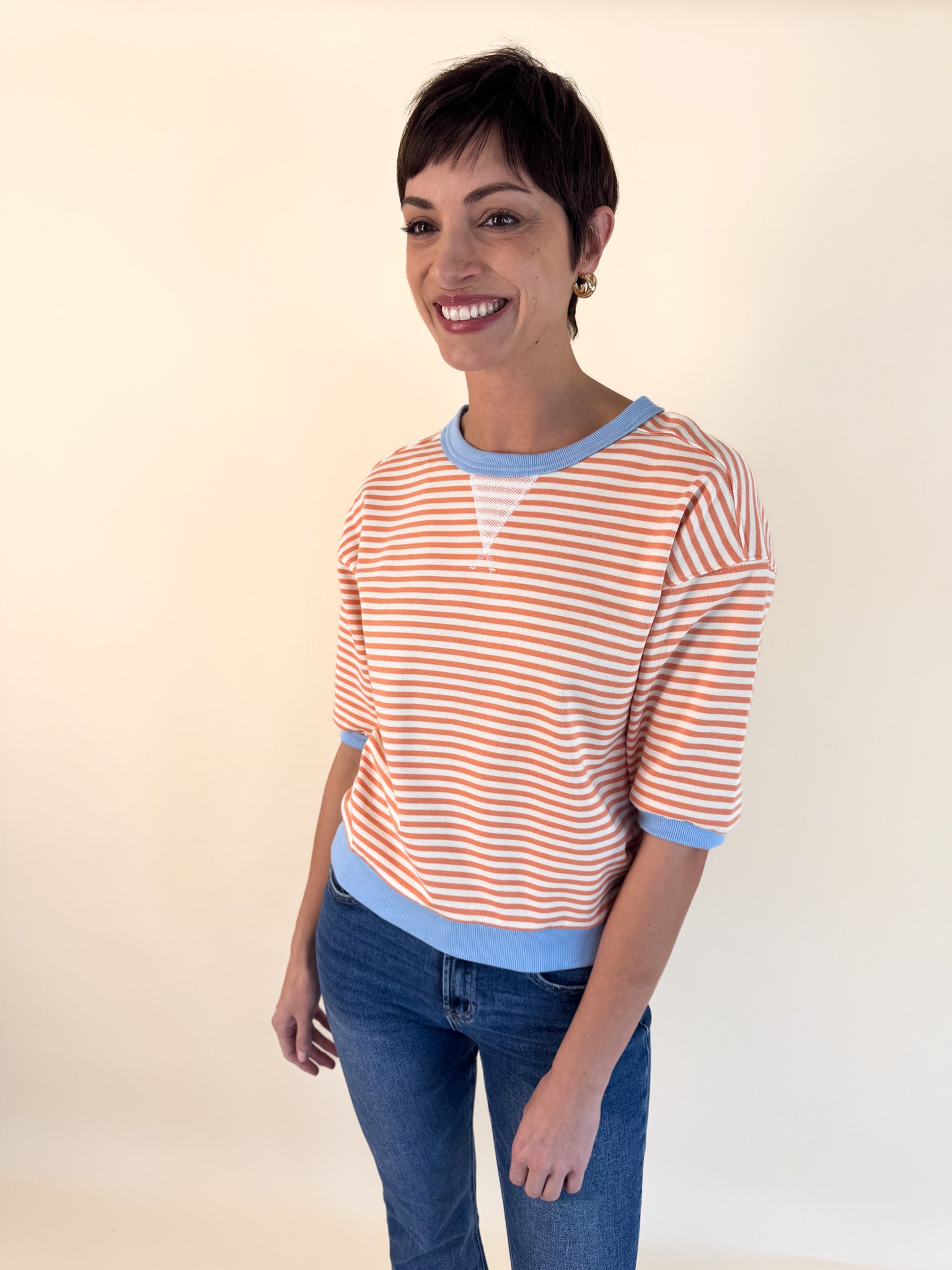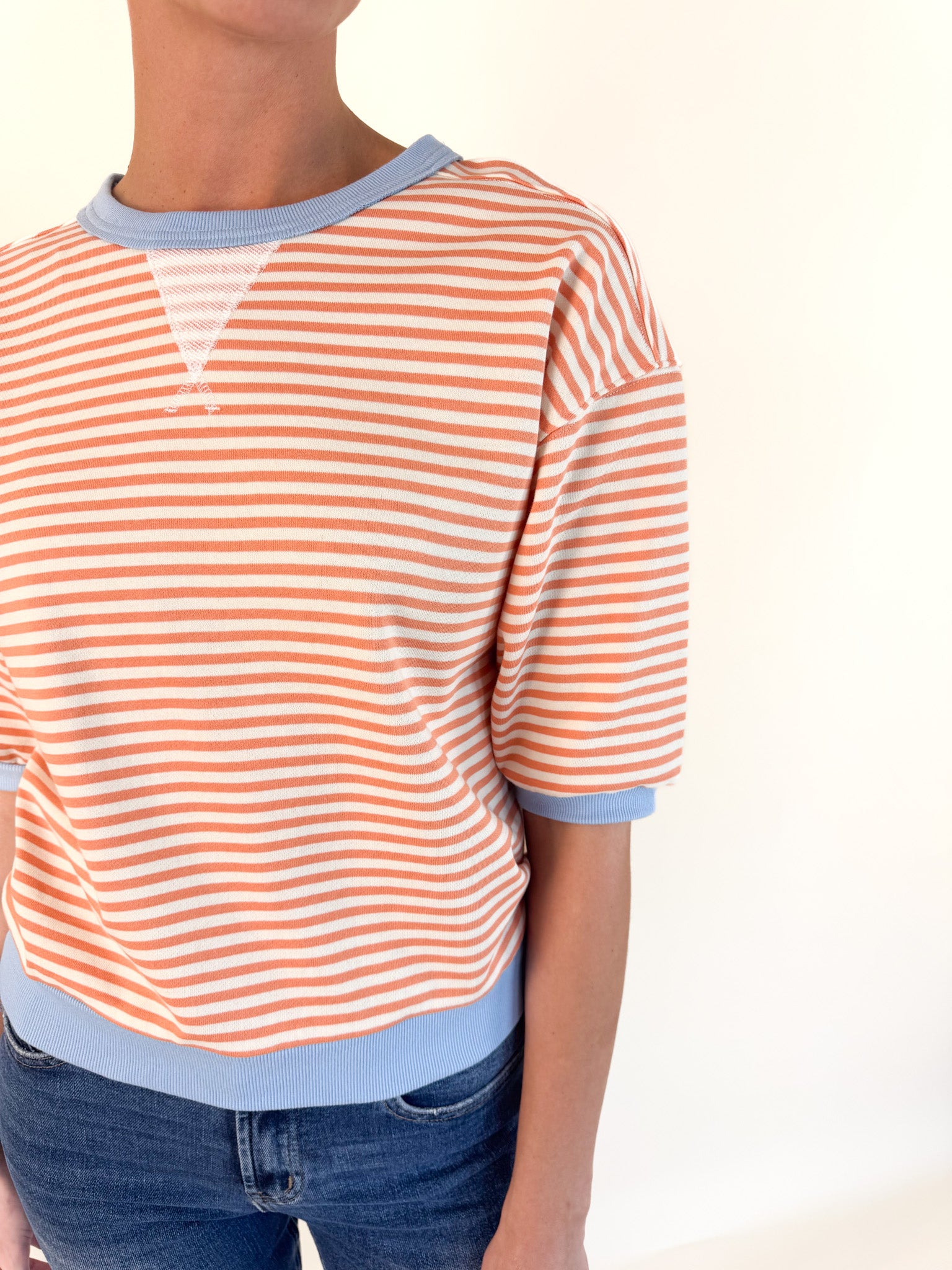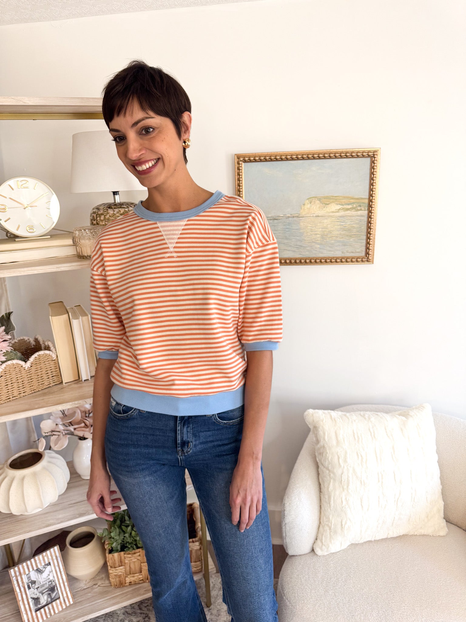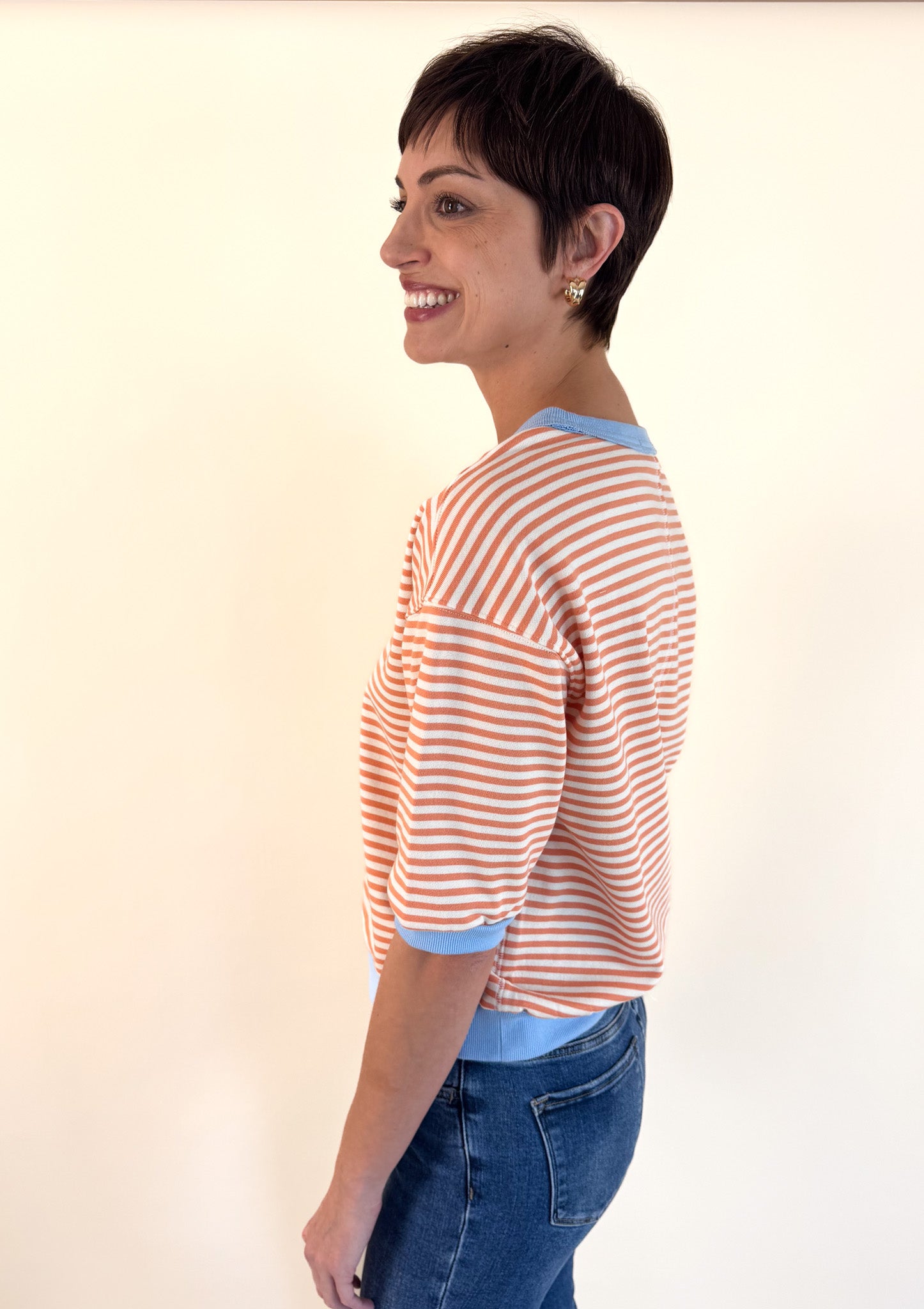 Peach stripes pop against a soft blue trim that frames the neckline and cuffs, creating a fun color combo that's equal parts bold and breezy.