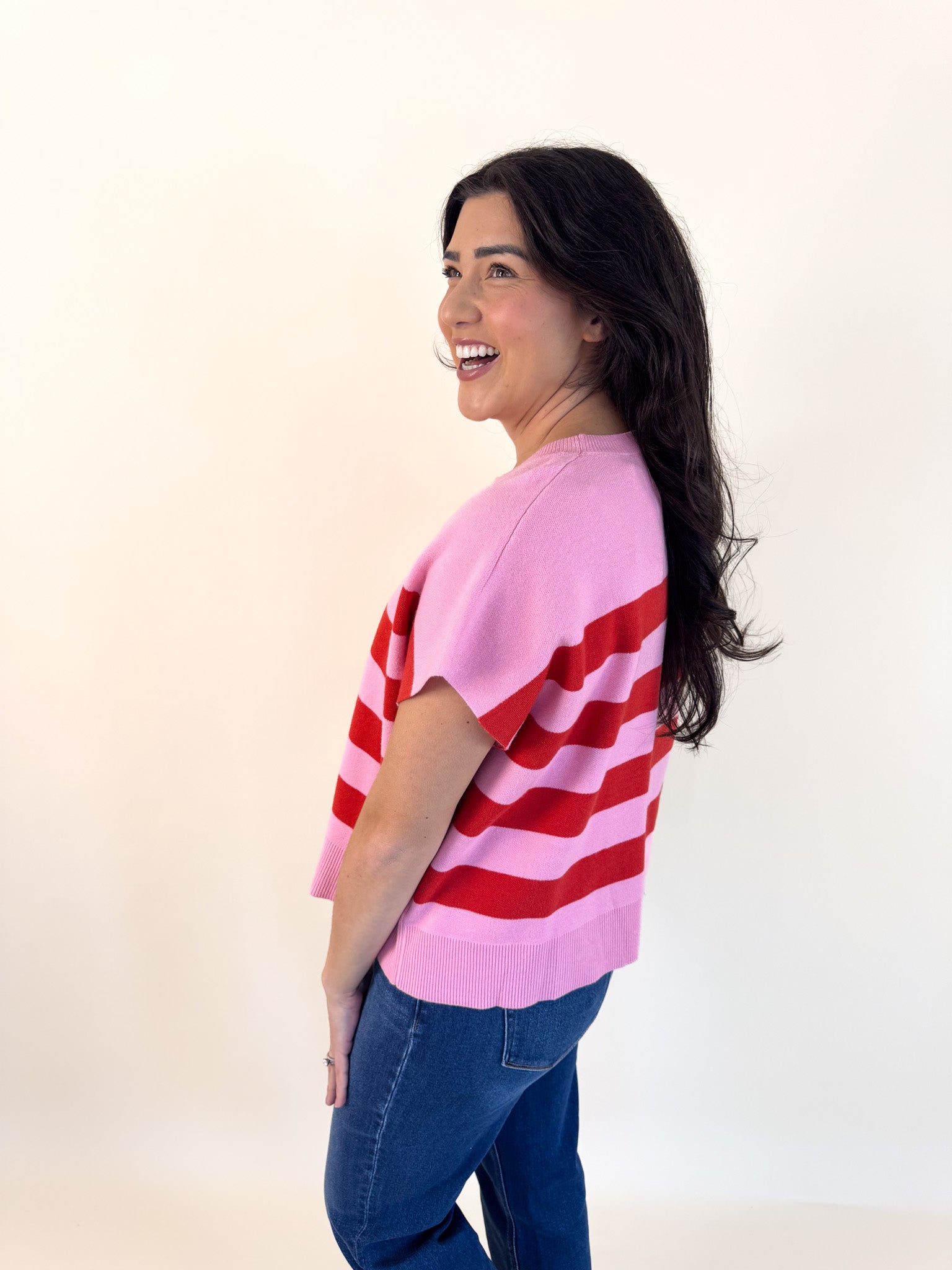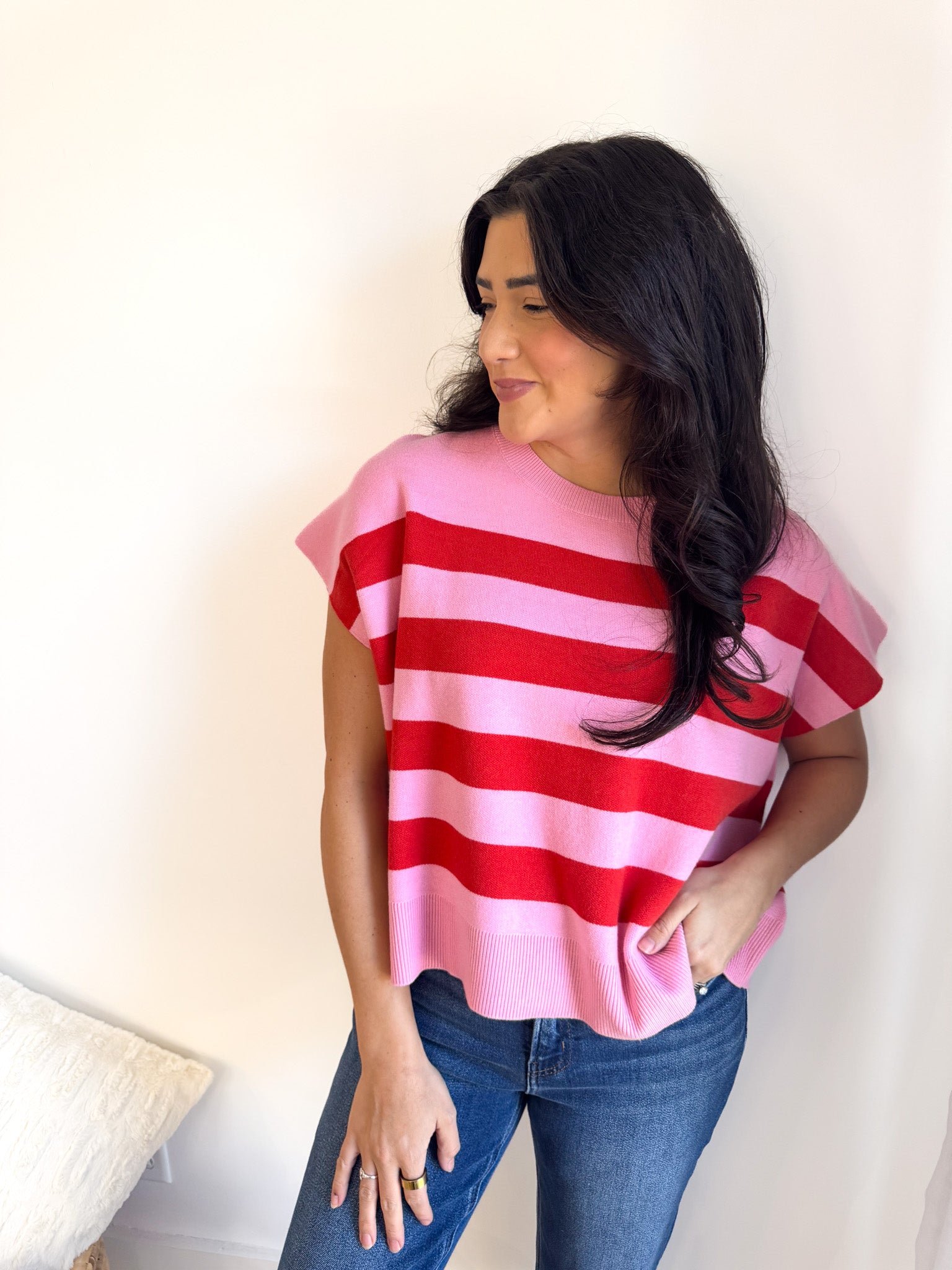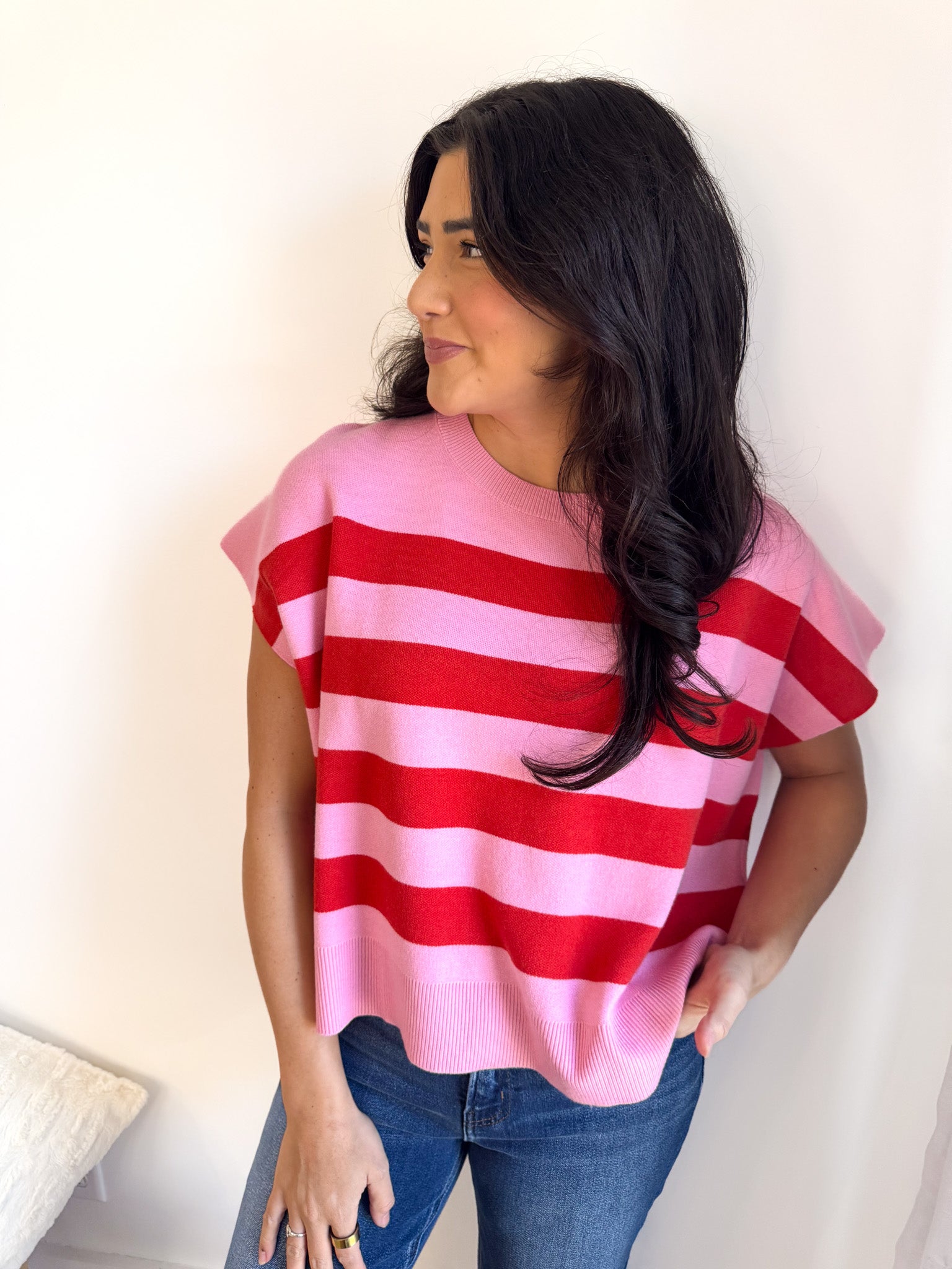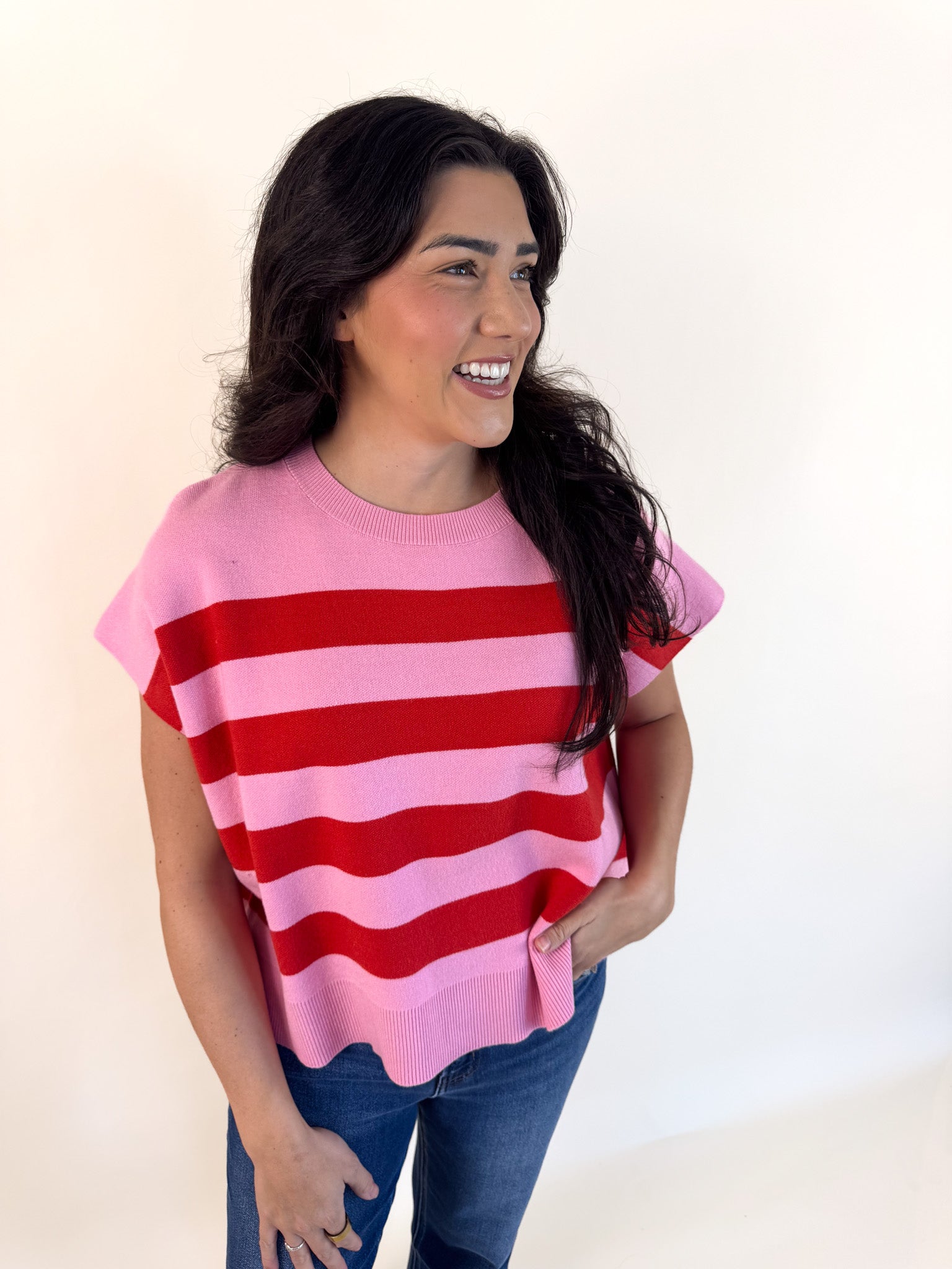 Soft and easygoing, this relaxed-fit sweater features charming capped sleeves and vibrant striped accents that add just the right pop of color.