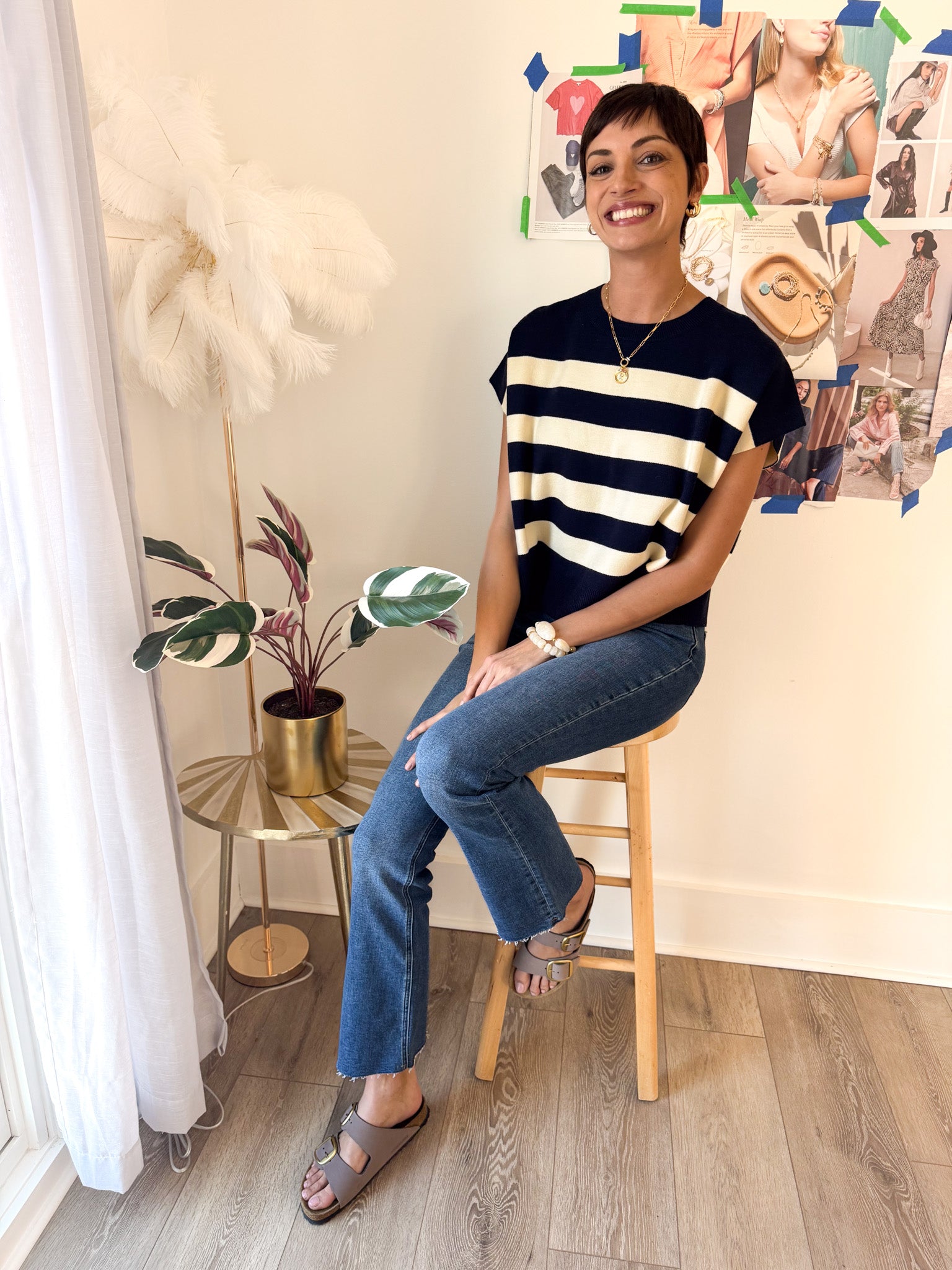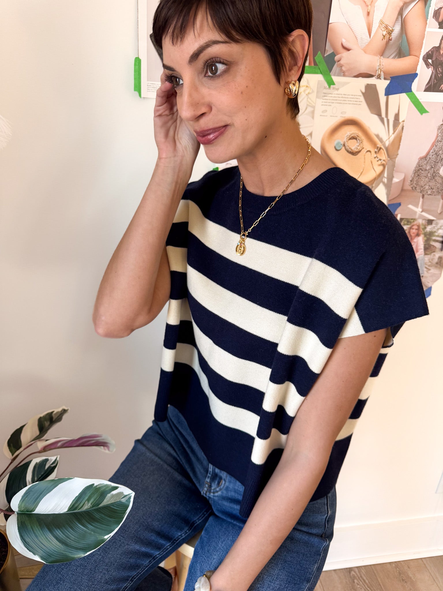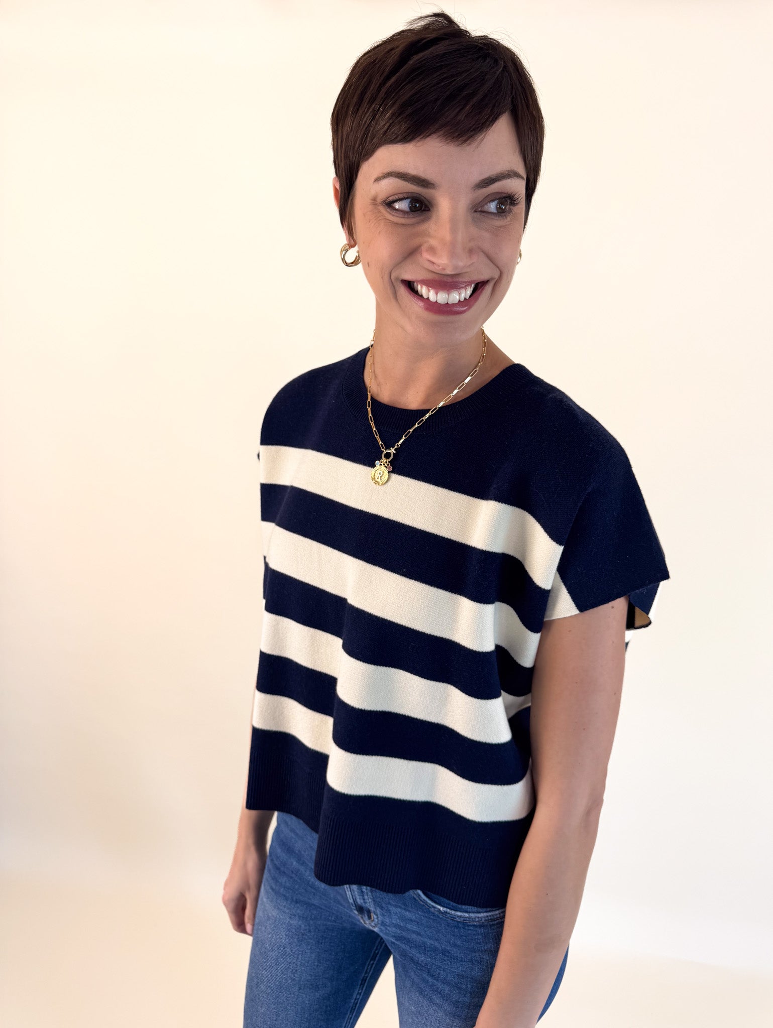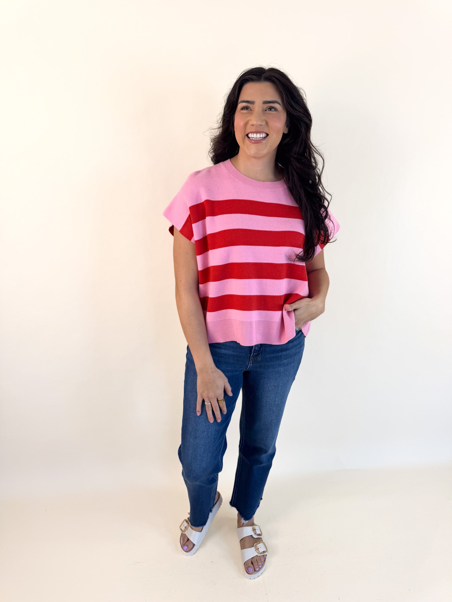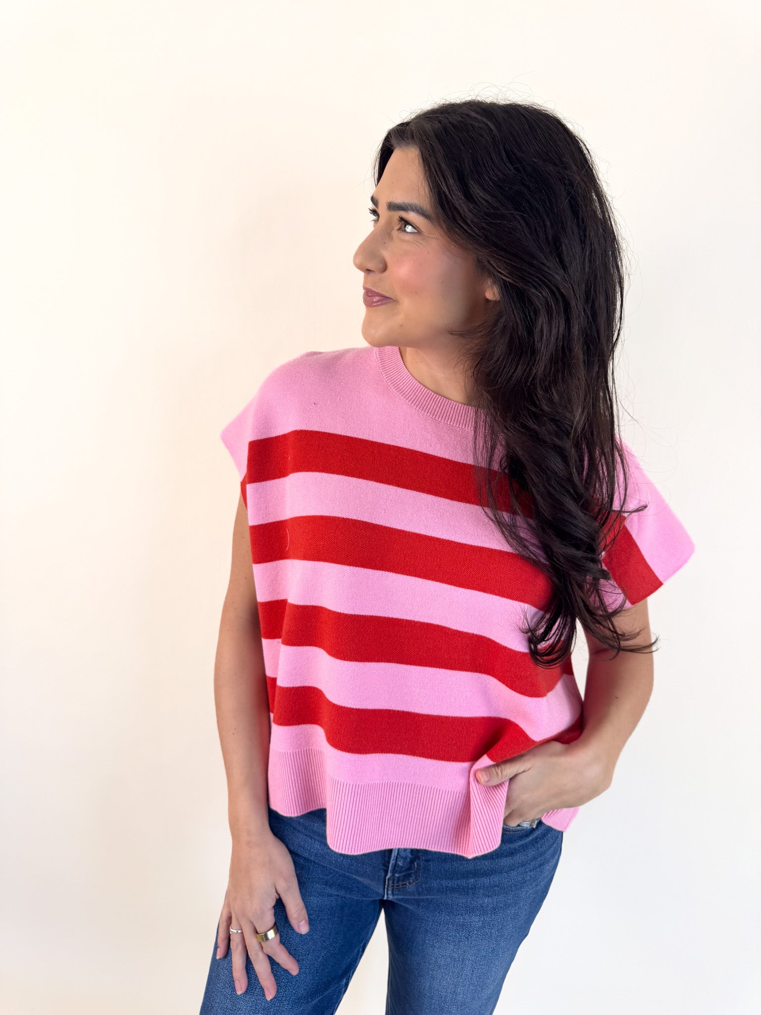 Soft and easygoing, this relaxed-fit sweater features charming capped sleeves and vibrant striped accents that add just the right pop of color.