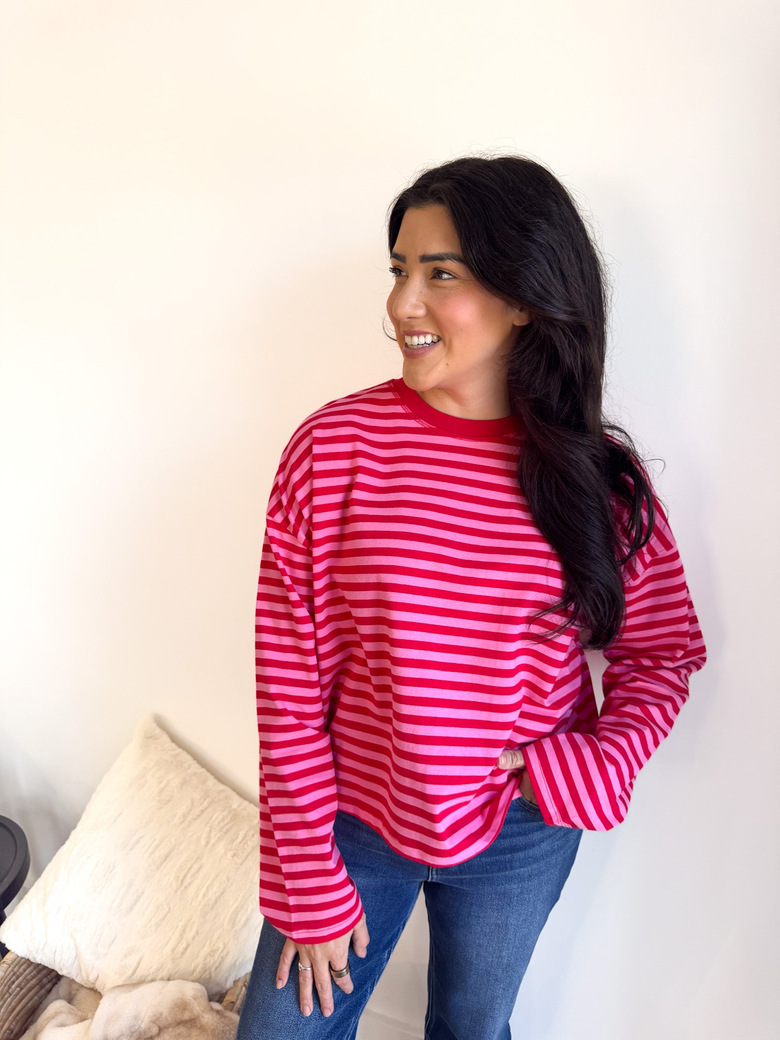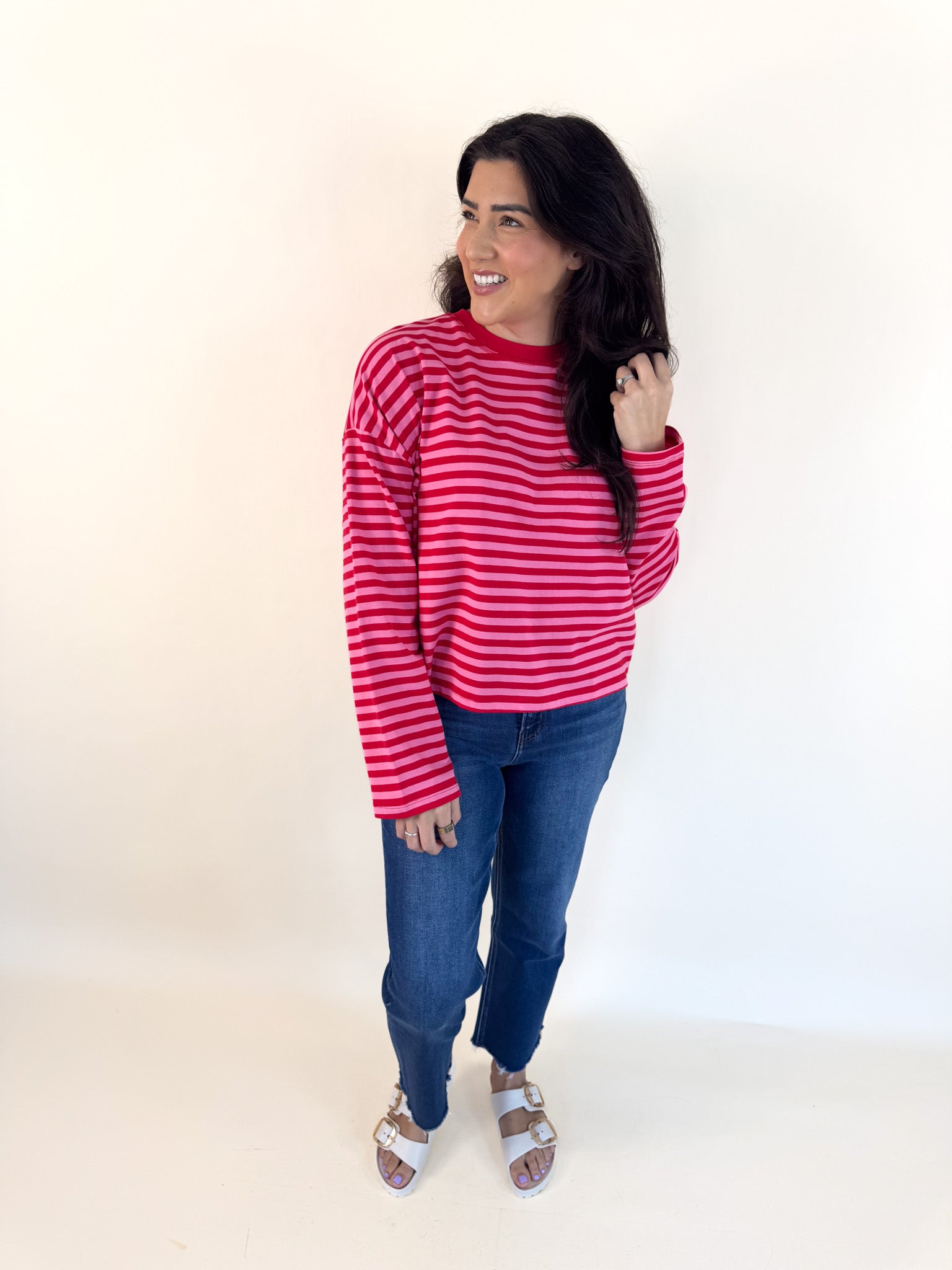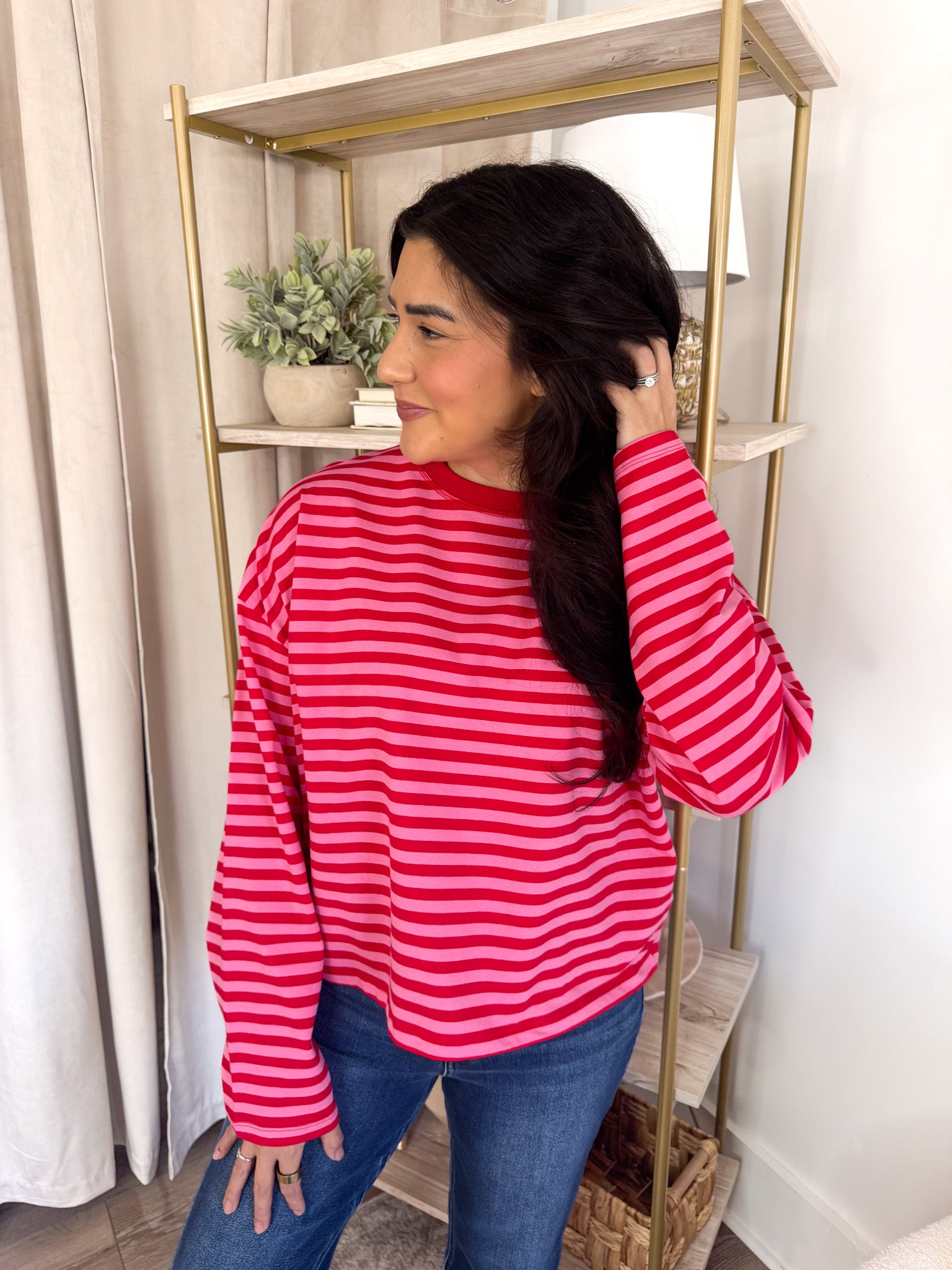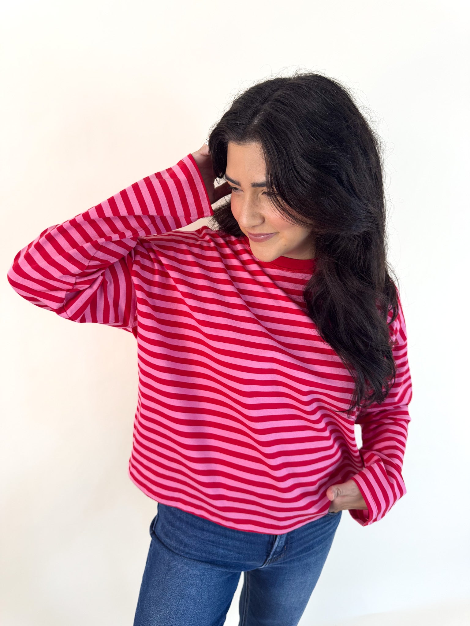 Mix two of our favorite hues in one effortless piece! This striped top pairs hibiscus and cherry for a vibrant pop of color that feels fresh and fun.