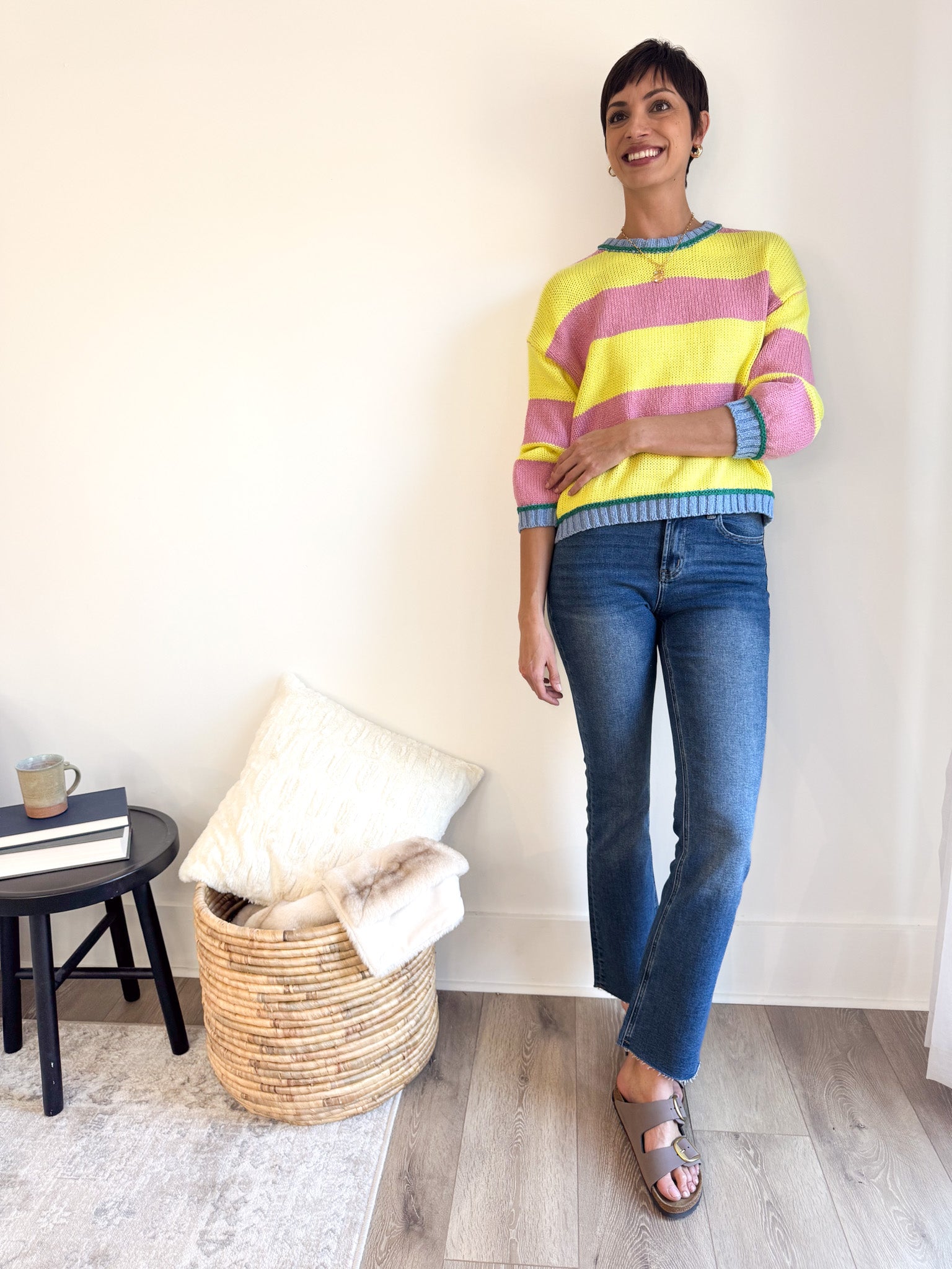 Forget matching—this season is all about color chaos, and the Lemonade Bold Striped Sweater is your ticket to the trend. Four vibrant hues collide in bold horizontal stripes, creating a statement piece that screams personality.