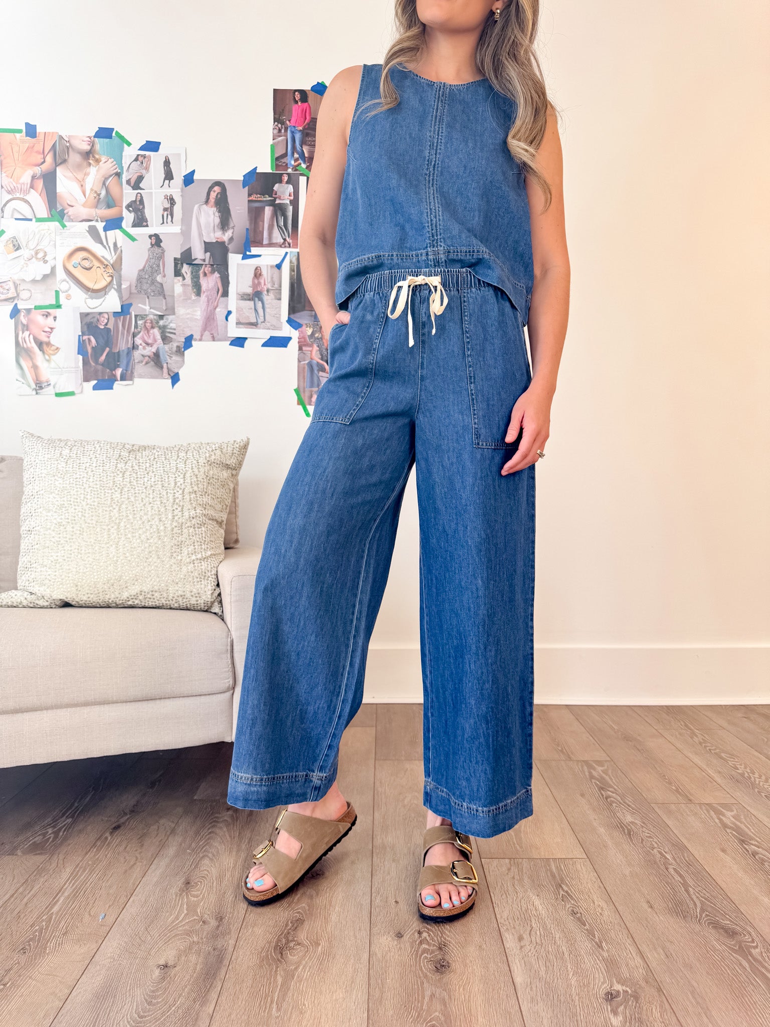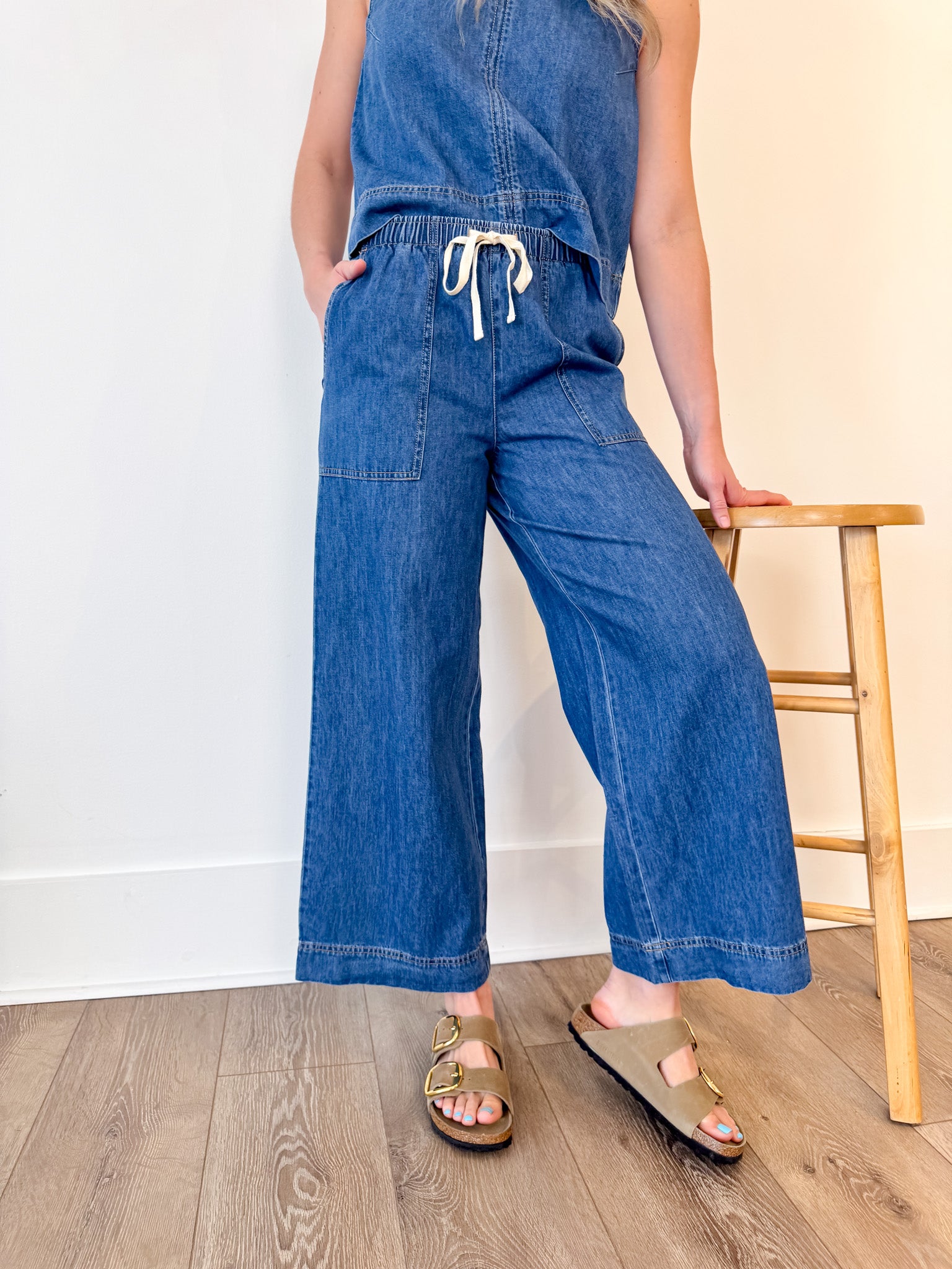 Count us in for ultra soft denim made of 100% cotton. These wide leg pants feature patch pockets, drawcord waistband and midweight feel to them. Dress it up or down with its matching top or a simple tank.