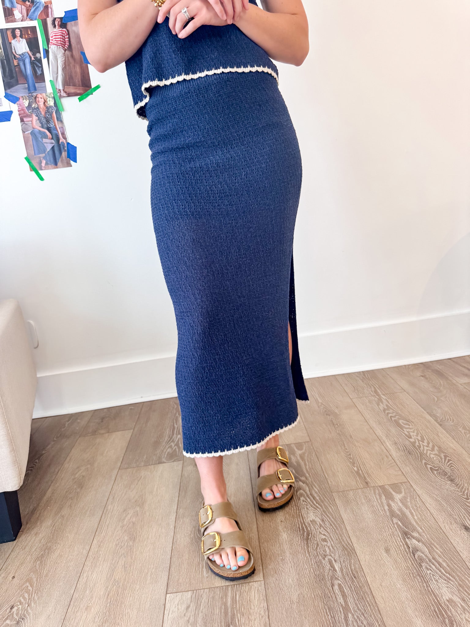This midi length skirt stands out with contrast color trim, yarn blend fabric, and a flattering relaxed silhouette. Make it a set with the Yessenia Whipstitch Tank.