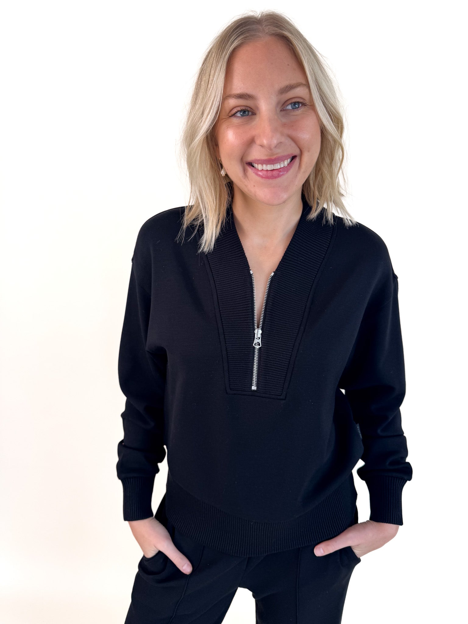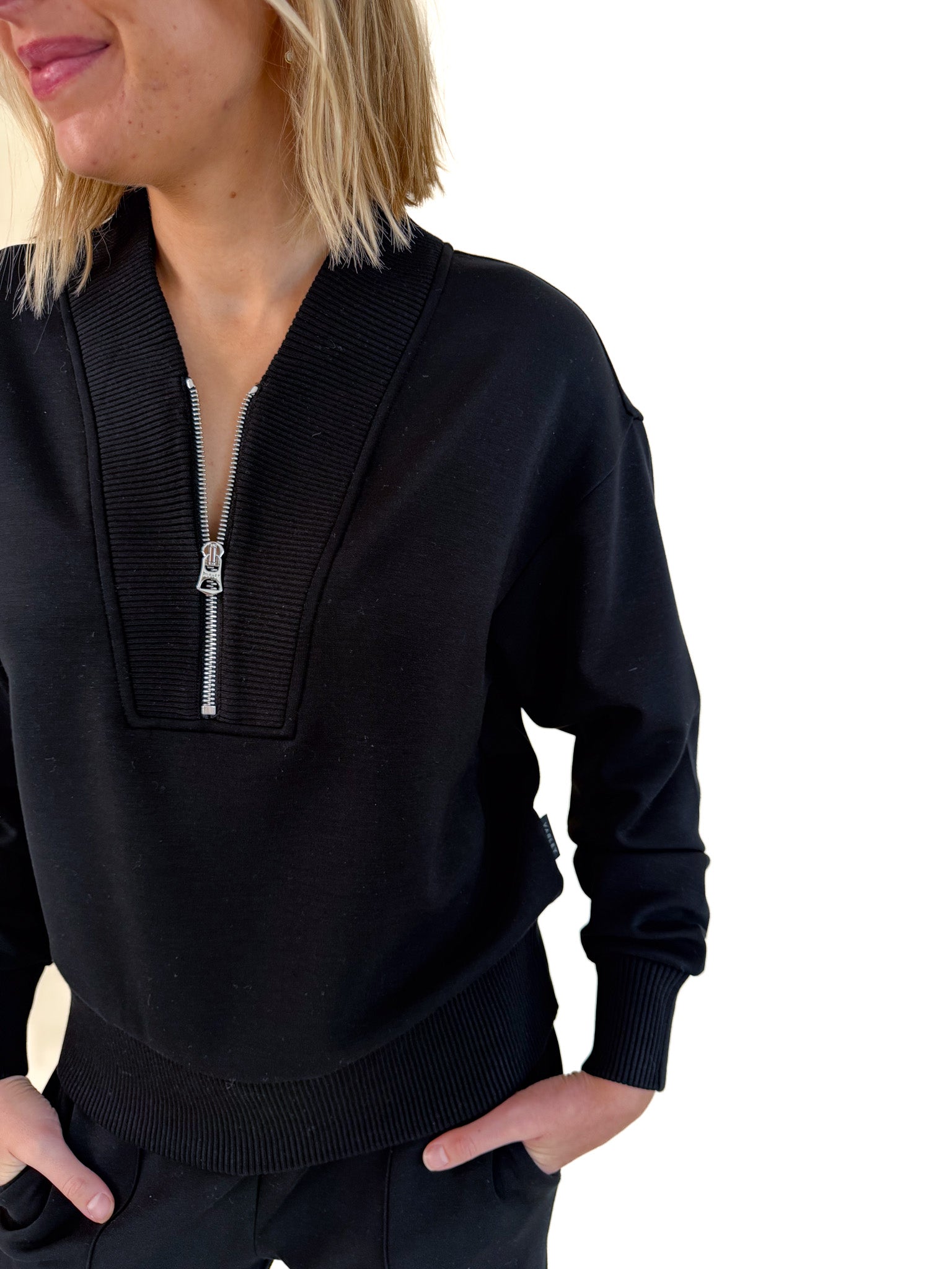 Perfect for everyday layering, the Sally half-zip sweat is a new take on our bestselling Davidson sweat. Crafted from our signature DoubleSoft® fabric, it is accentuated with chunky rib knit detailing on the V-neckline panel, the hemband, and the cuffs. Cut to a regular length, with long sleeves and a dropped shoulder, it is a versatile style for any day.