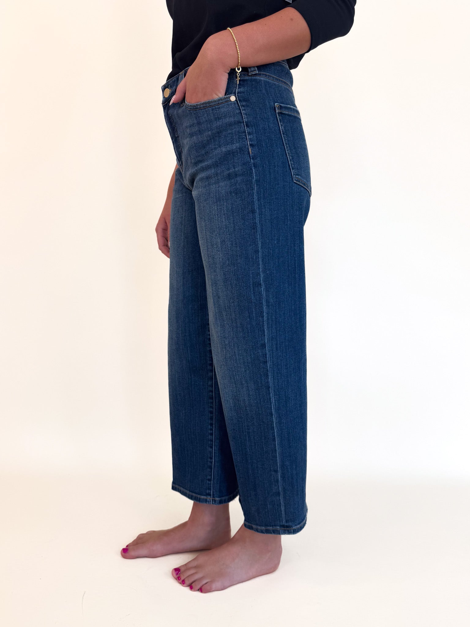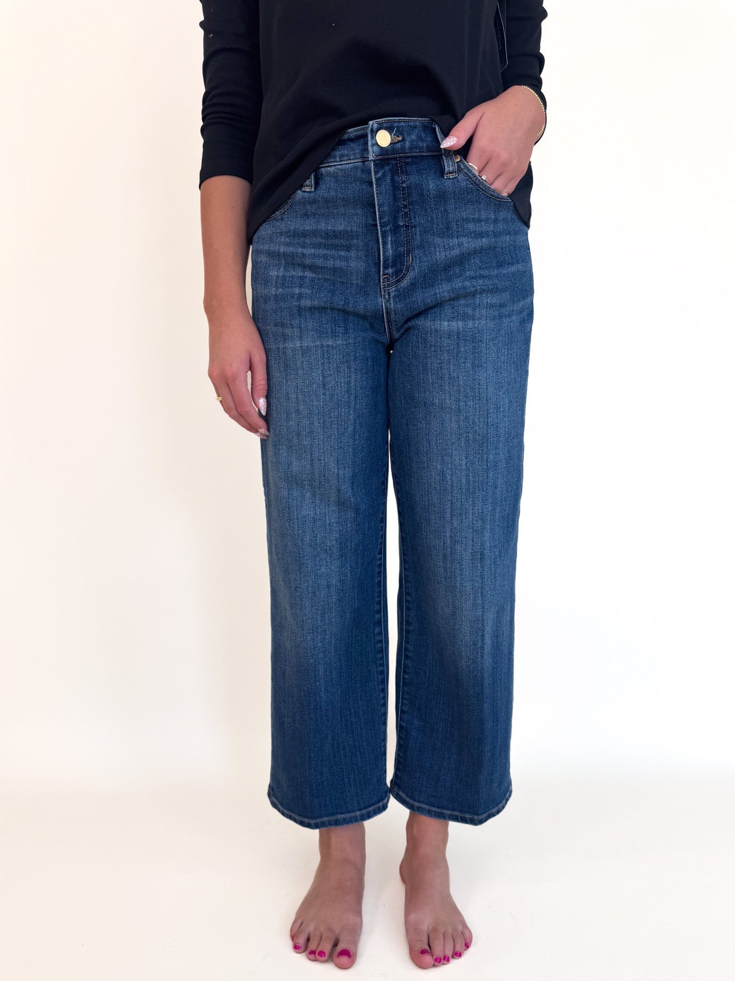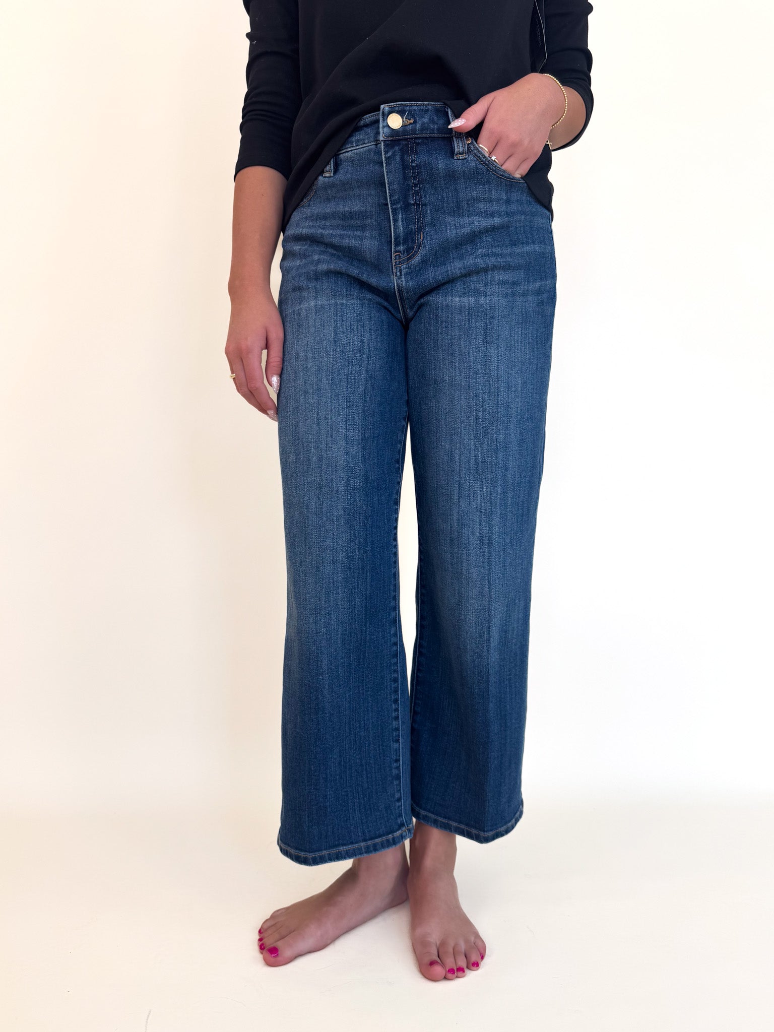 Cropped just above the ankle, it pairs effortlessly with knit tops, tailored layers, and sleek footwear. Crafted from soft, stretch-infused denim for a refined look and all-day ease.