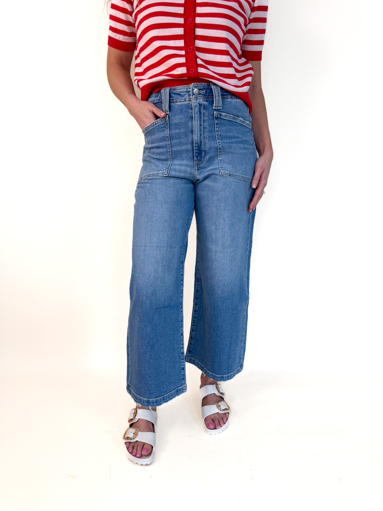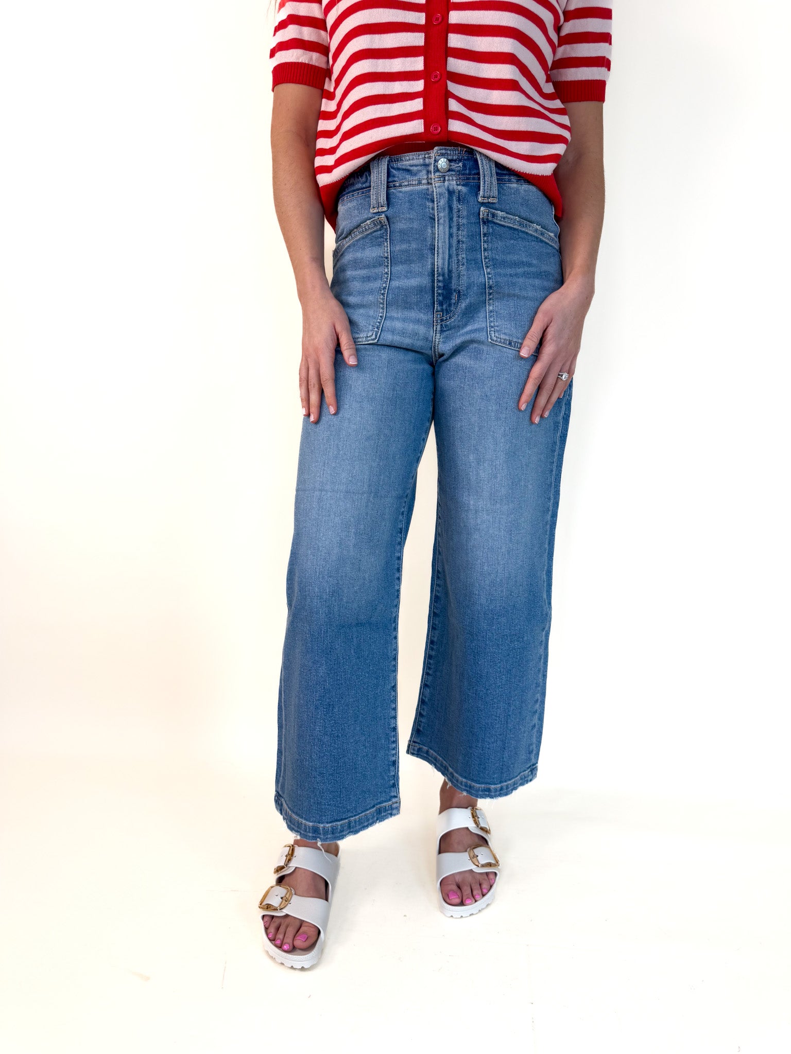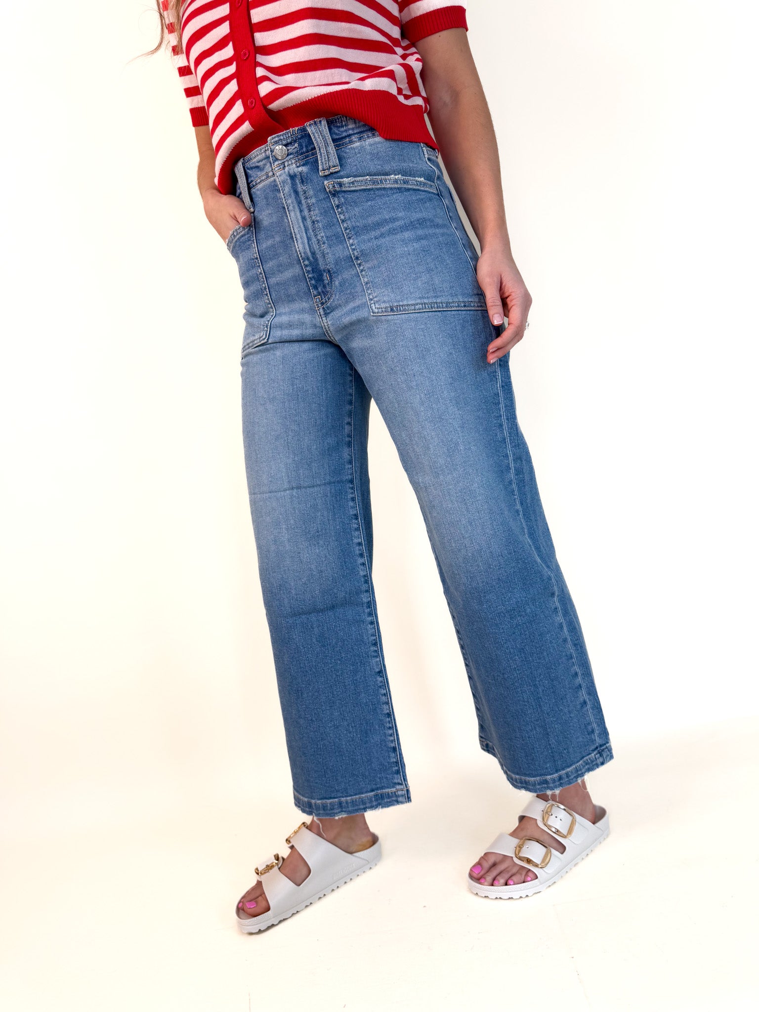 Channeling vintage LA vibes, these high-rise wide-leg jeans showcase statement patch pockets and crisp finishing. The perfect blend of retro charm and modern comfort for effortless style.
