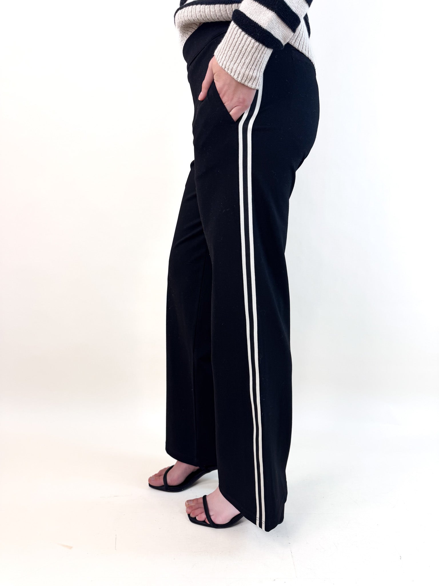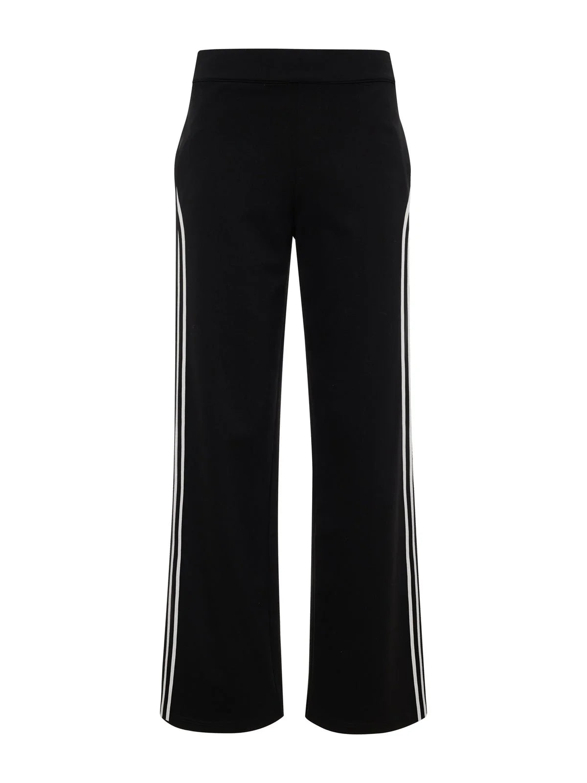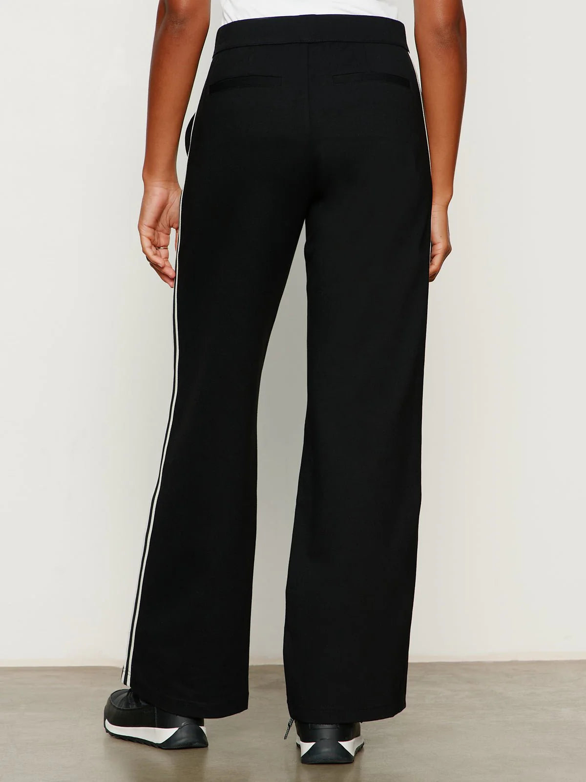 Crafted in a sleek black ponte fabric, these pull-on track pants feature a crisp white side stripe for a sporty–chic touch. The wide-leg silhouette offers effortless movement and a flattering drape, making them perfect for dressing up with a blouse and heels or keeping it casual.