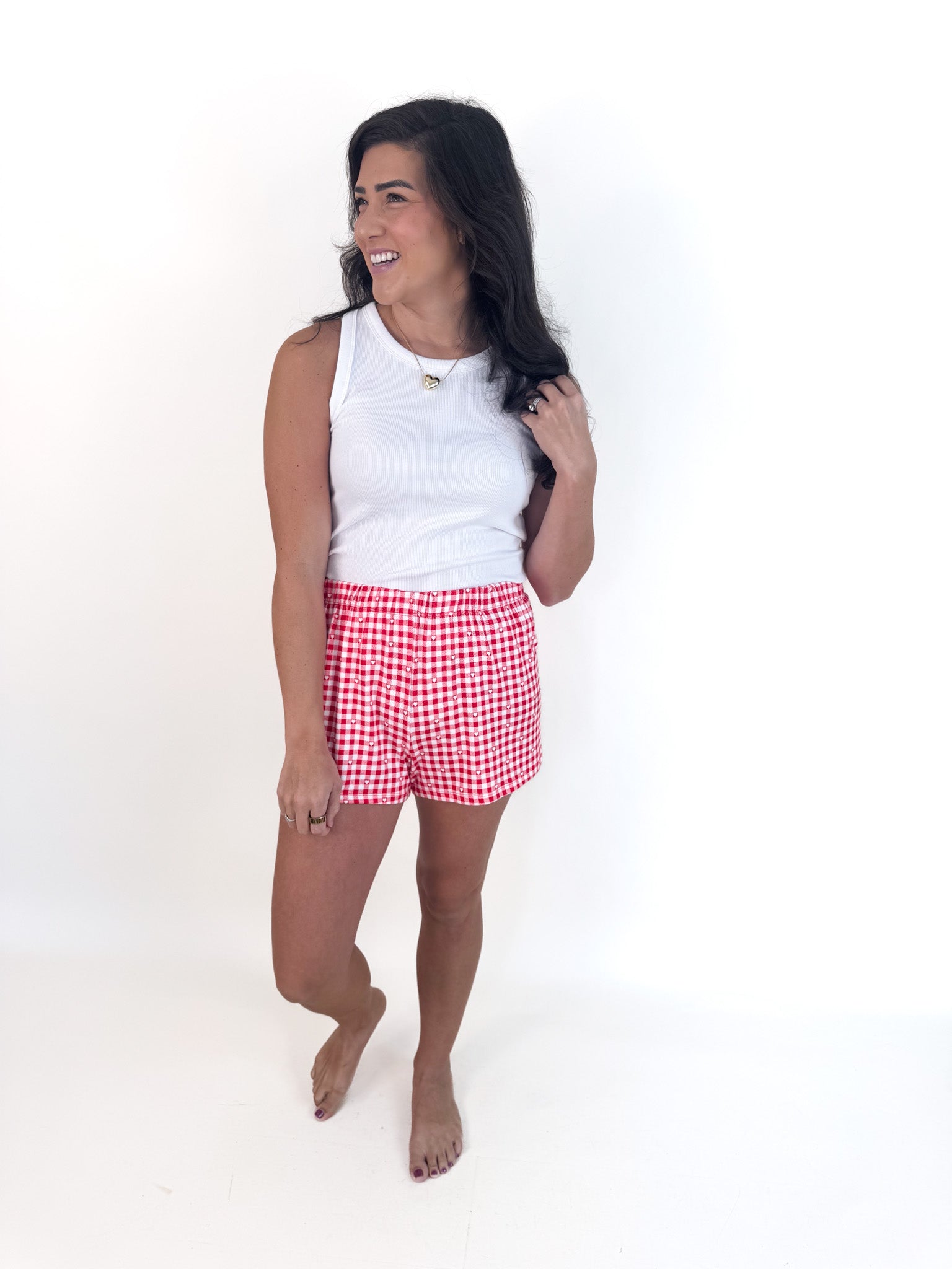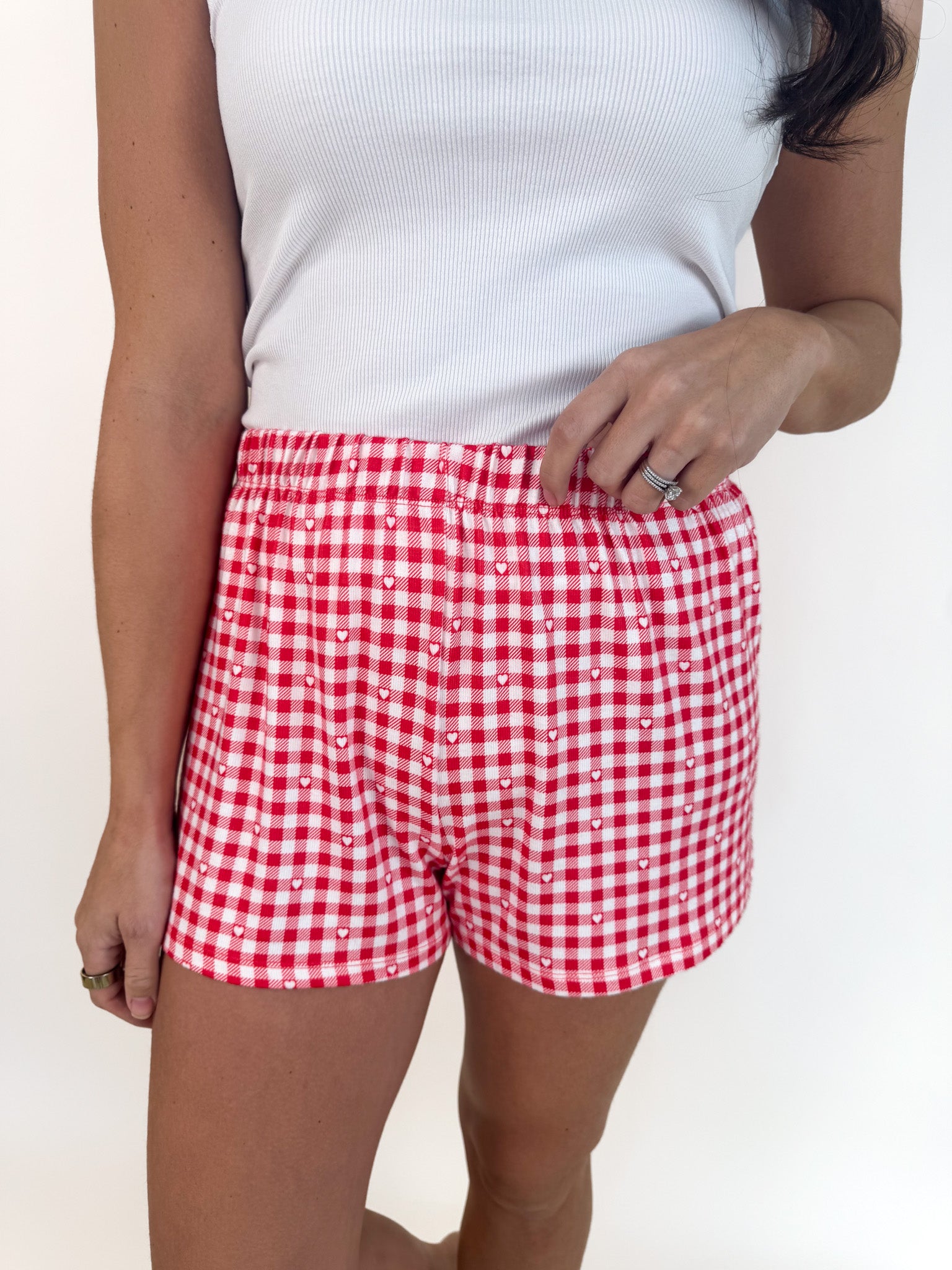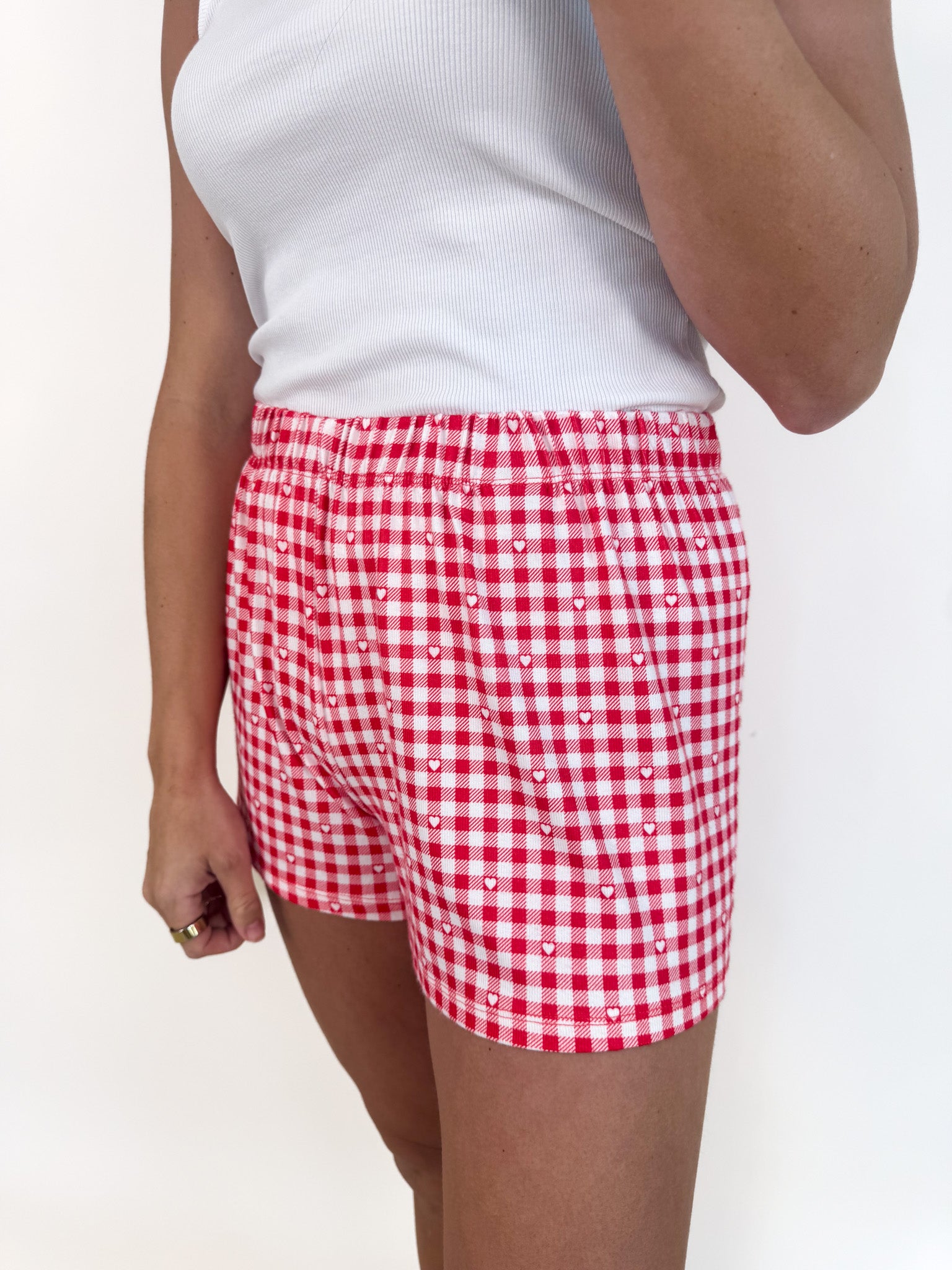 - Red gingham print with hearts